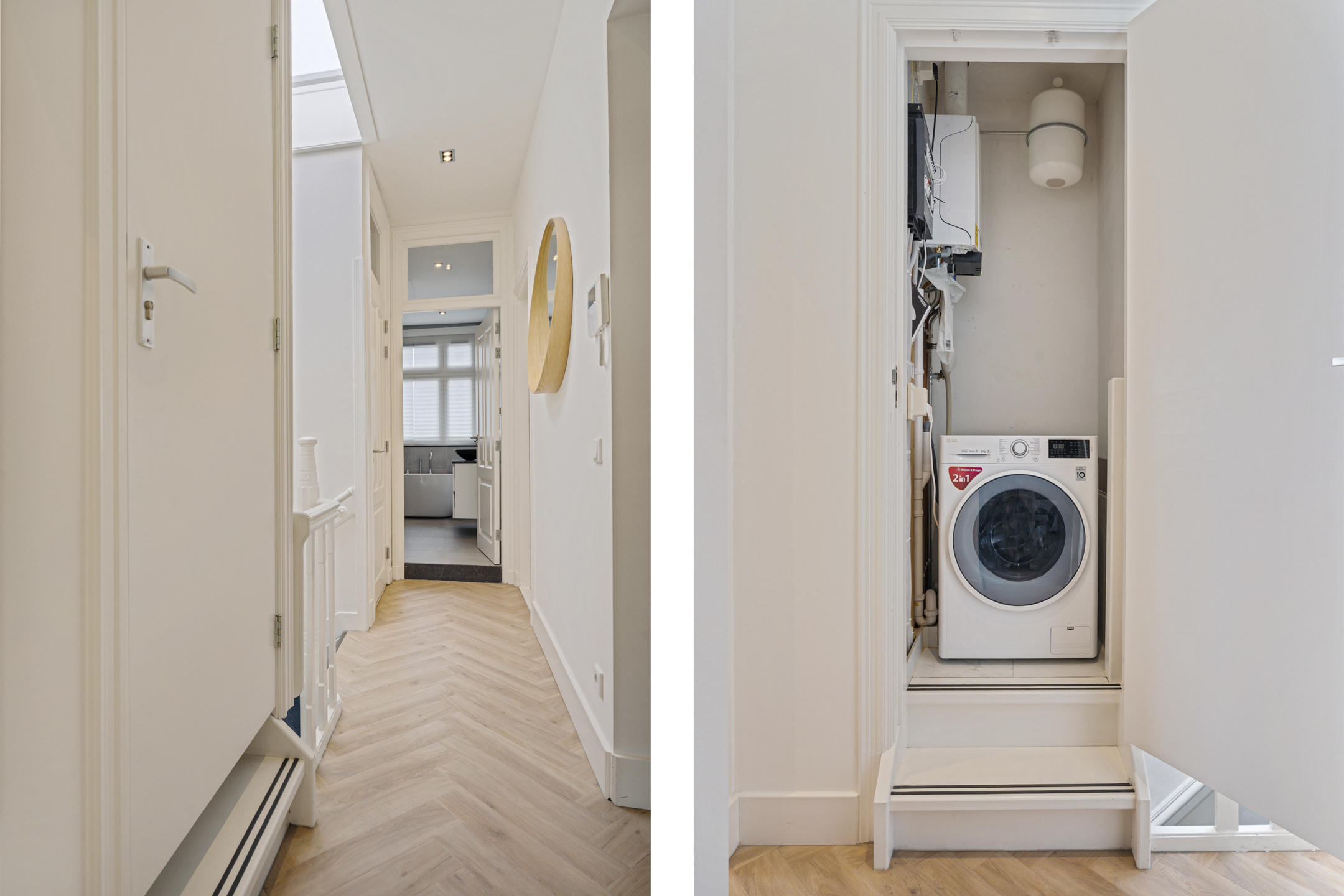 Je betreedt de woning via een lichte hal met een fraaie dakkoepel die zorgt voor een natuurlijke lichtinval. Hier vind je het moderne, separate toilet, een afgesloten cv-/wasruimte met verhoogd plateau voor extra gebruiksgemak, en toegang tot alle vertrekken.