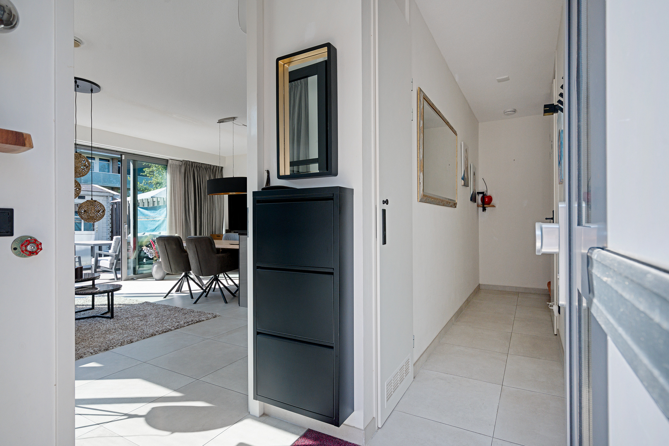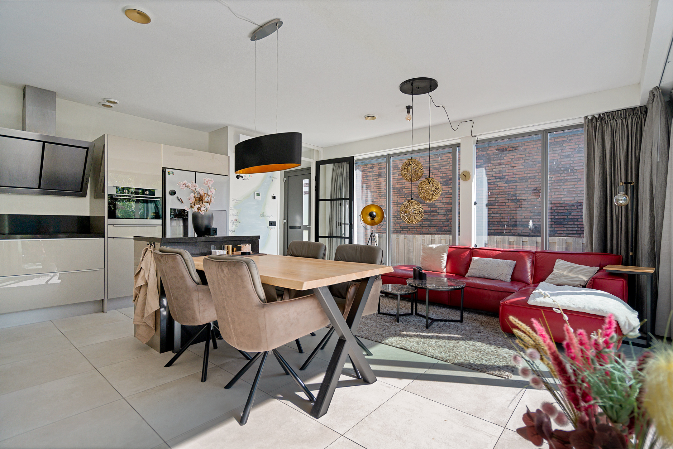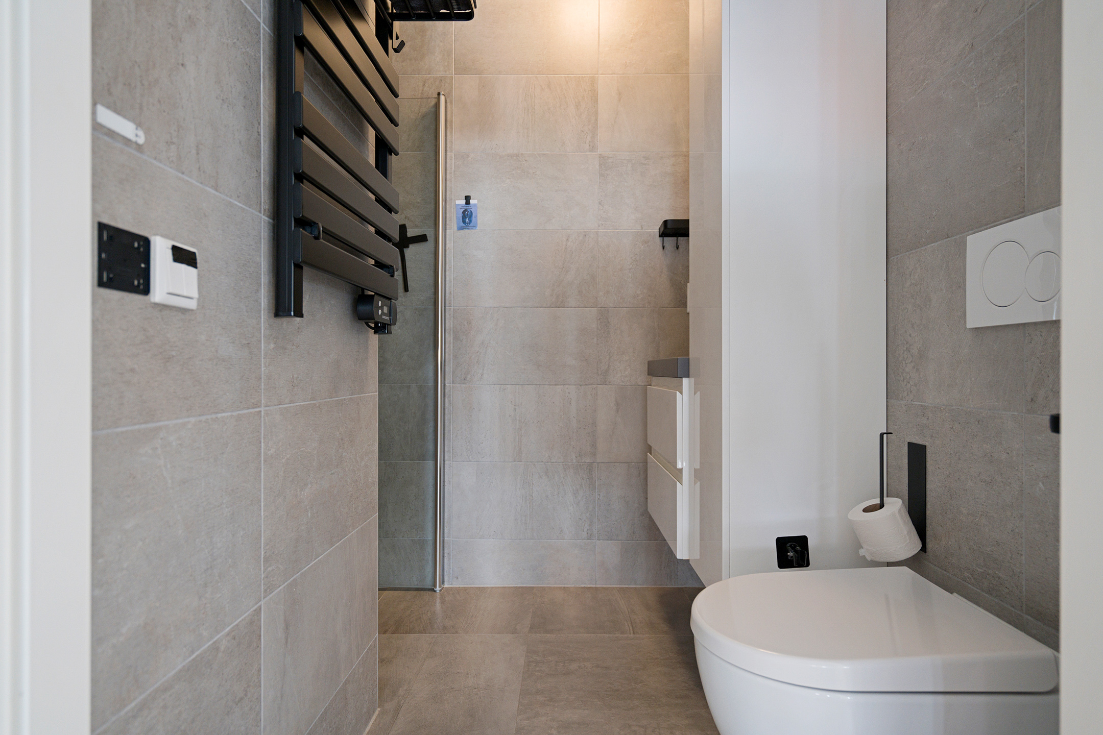 Je parkeert je auto op eigen terrein en bereikt de woning via de zijkant van het pand. In de hal vind je het moderne toilet, de meterkast met waterontharder en toegang tot de lichte en ruime woonkamer. Grote raampartijen en een schuifpui zorgen hier voor veel natuurlijk licht. De tegelvloer in combinatie met de vloerverwarming zorgt voor comfort en een strakke uitstraling.