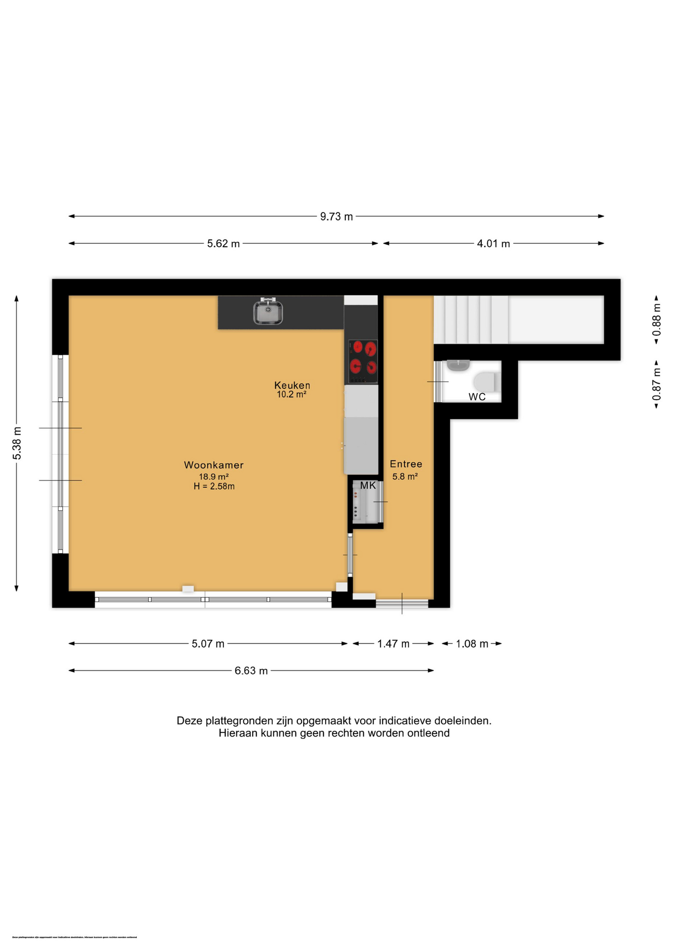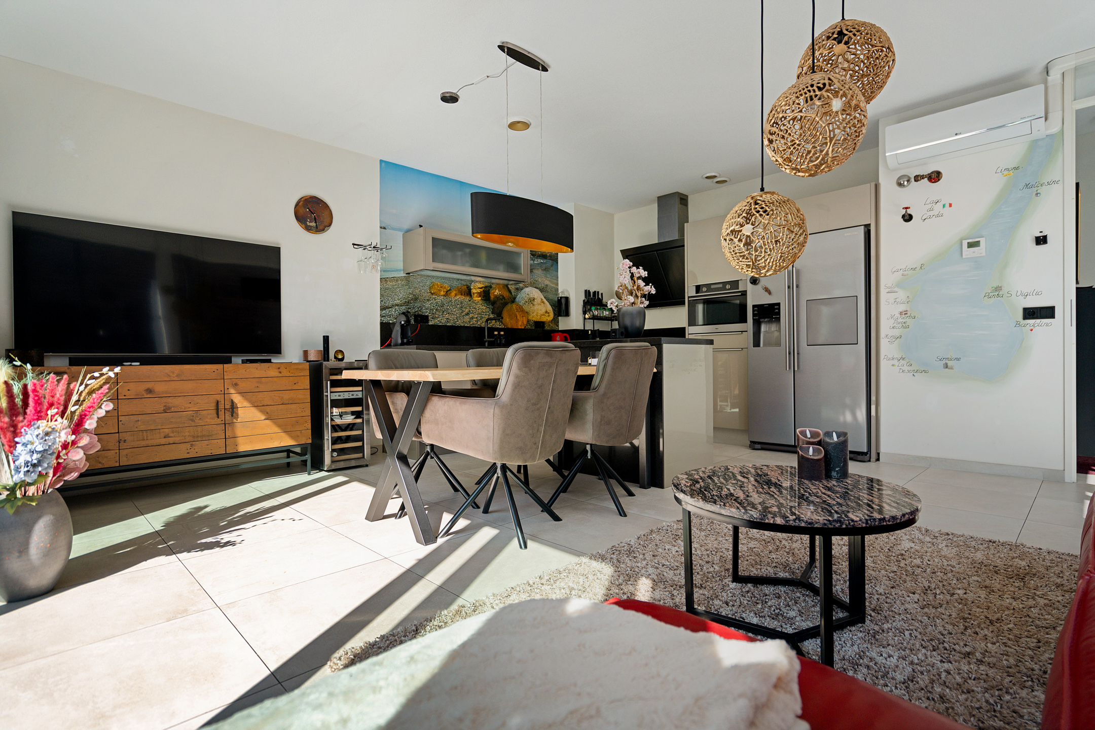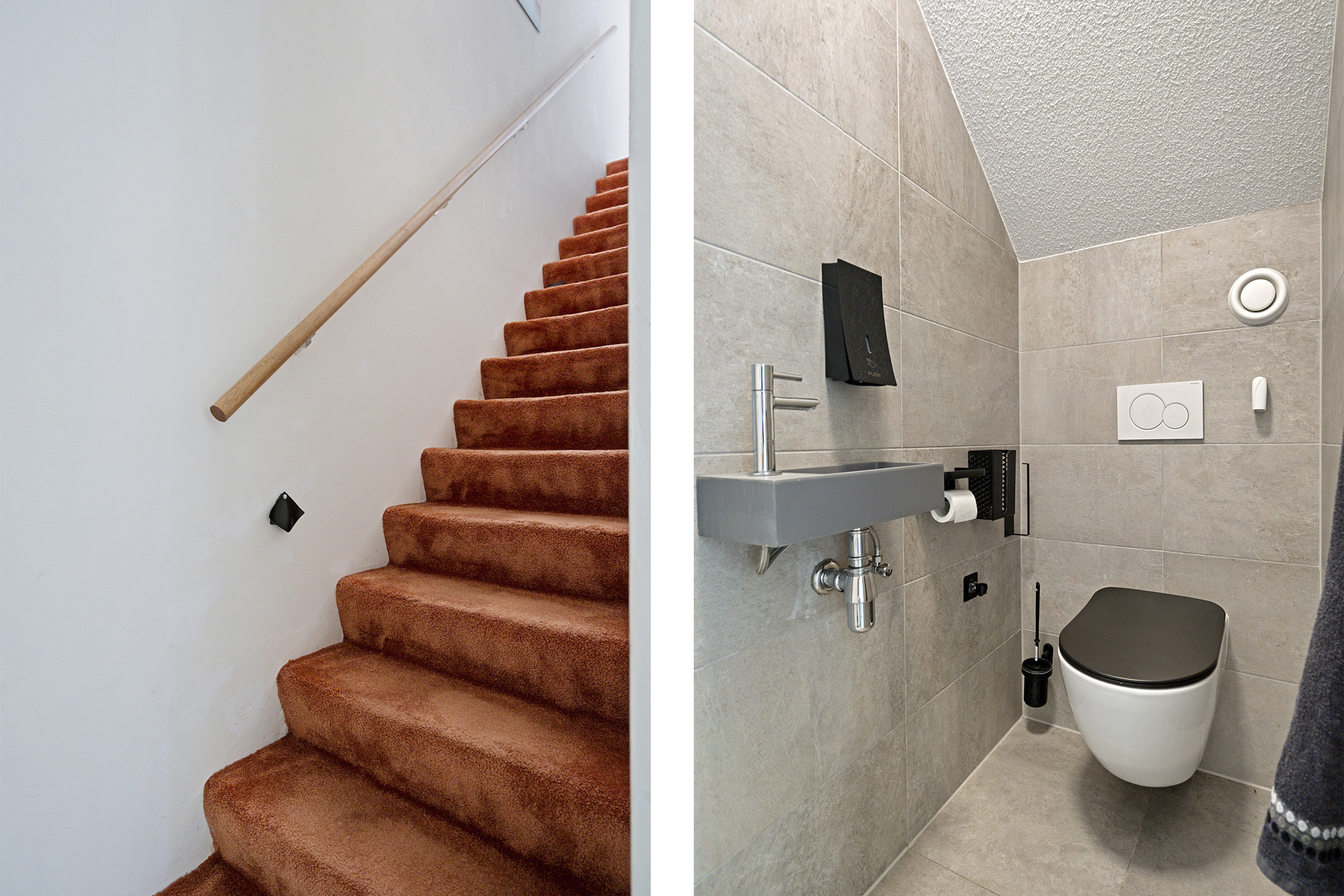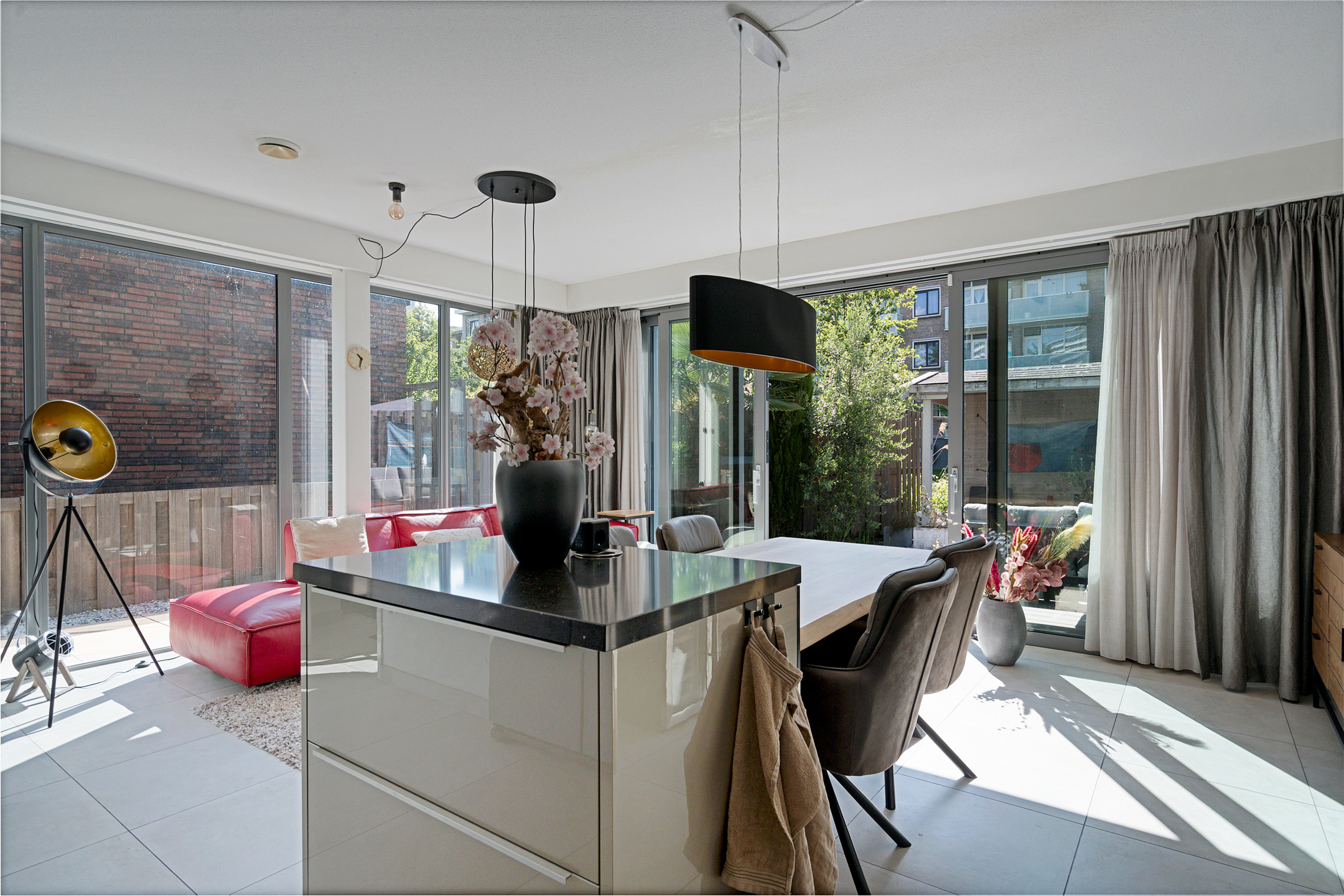 Je parkeert je auto op eigen terrein en bereikt de woning via de zijkant van het pand. In de hal vind je het moderne toilet, de meterkast met waterontharder en toegang tot de lichte en ruime woonkamer. Grote raampartijen en een schuifpui zorgen hier voor veel natuurlijk licht. De tegelvloer in combinatie met de vloerverwarming zorgt voor comfort en een strakke uitstraling.