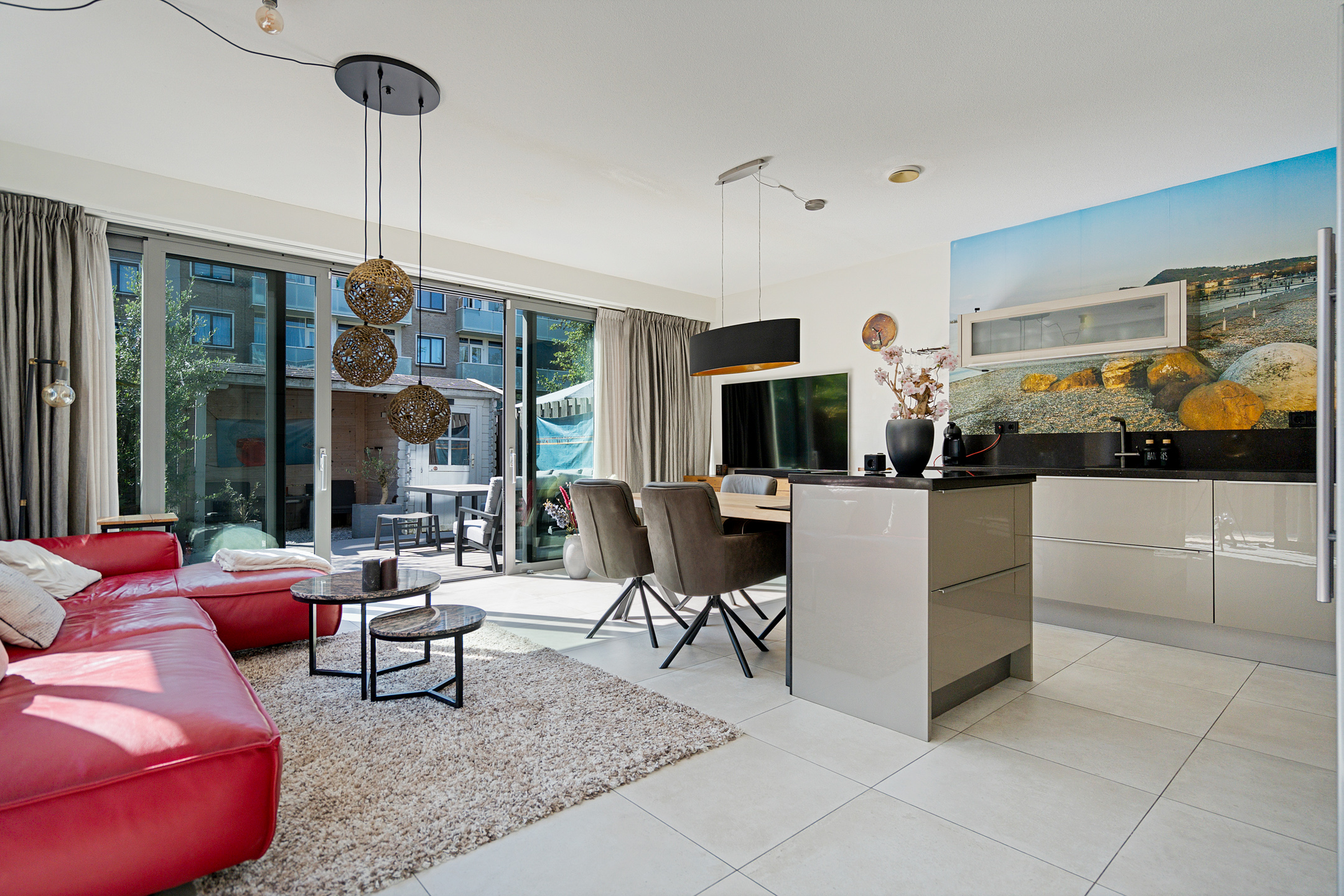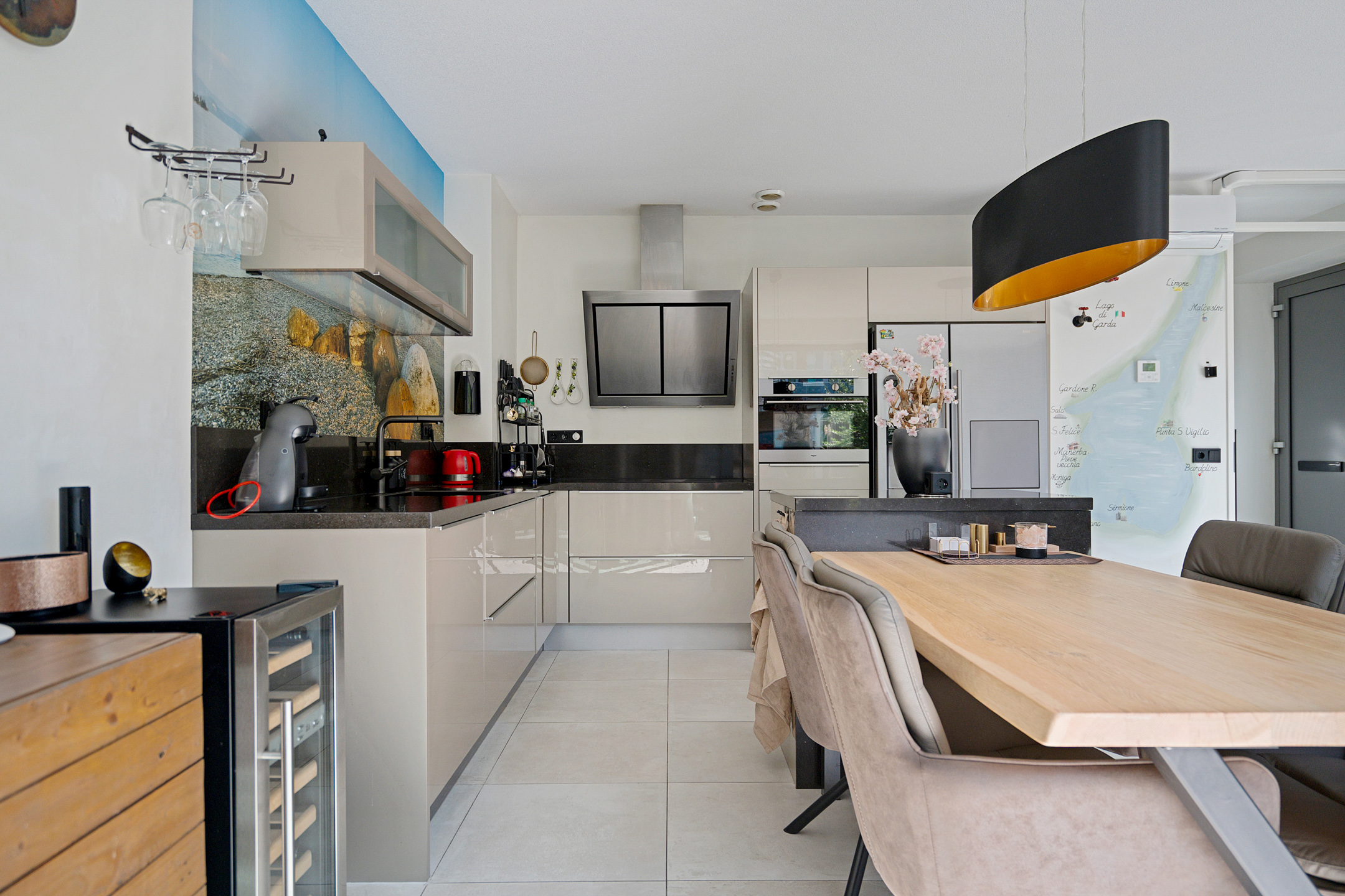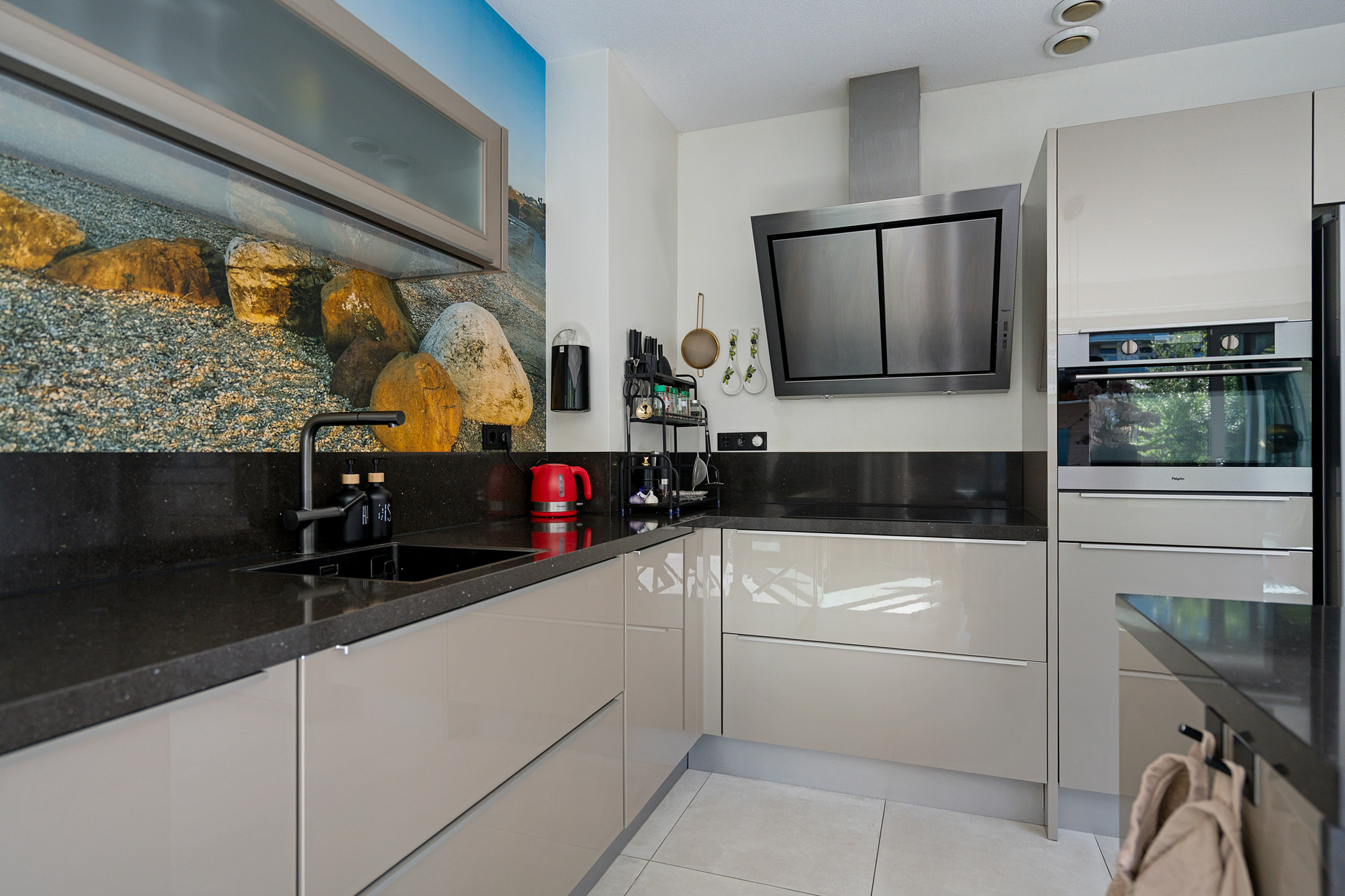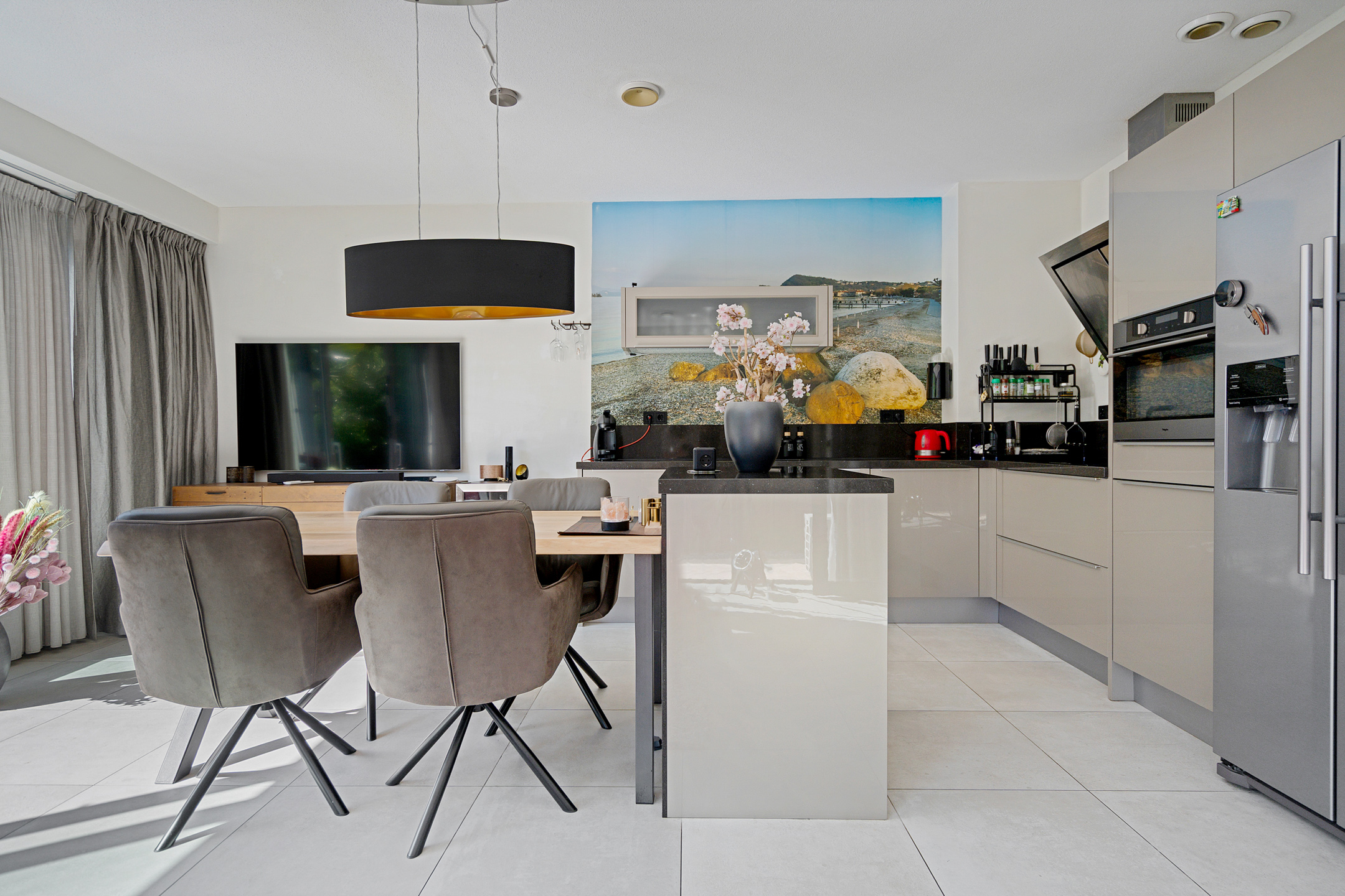 De open keuken is strak en modern, voorzien van een composiet werkblad en hoogwaardige inbouwapparatuur: een inductiekookplaat, recirculatiekap, combi-oven, vaatwasser en een vrijstaande Amerikaanse koelkast van Samsung. De keuken staat in directe verbinding met de woonkamer, wat zorgt voor een prettige, open sfeer.