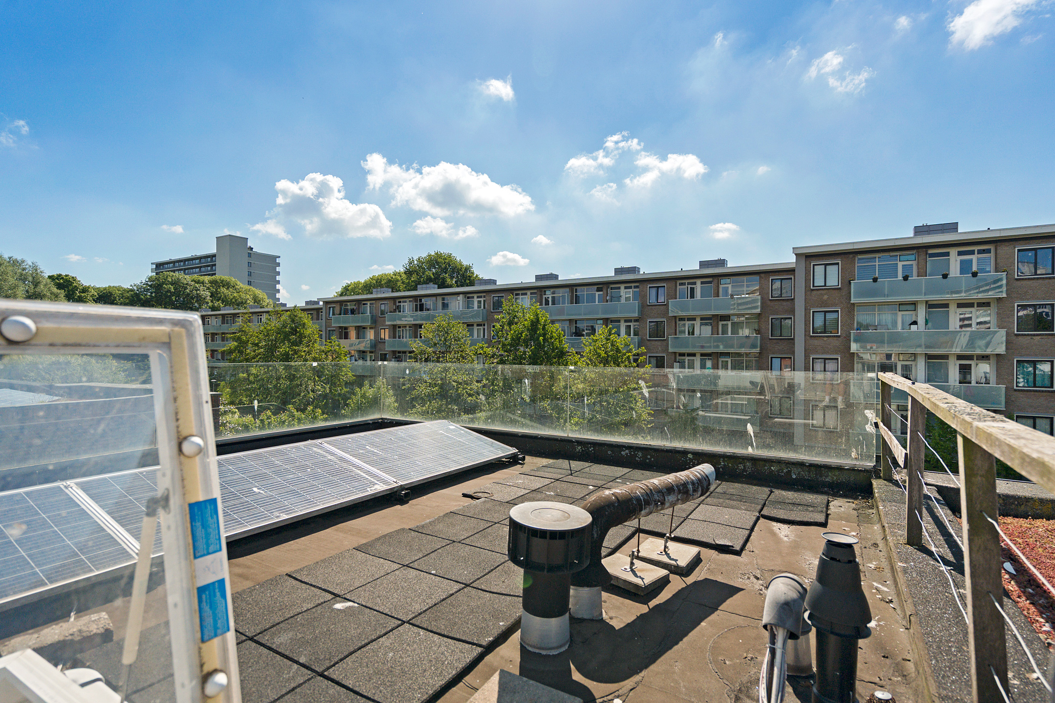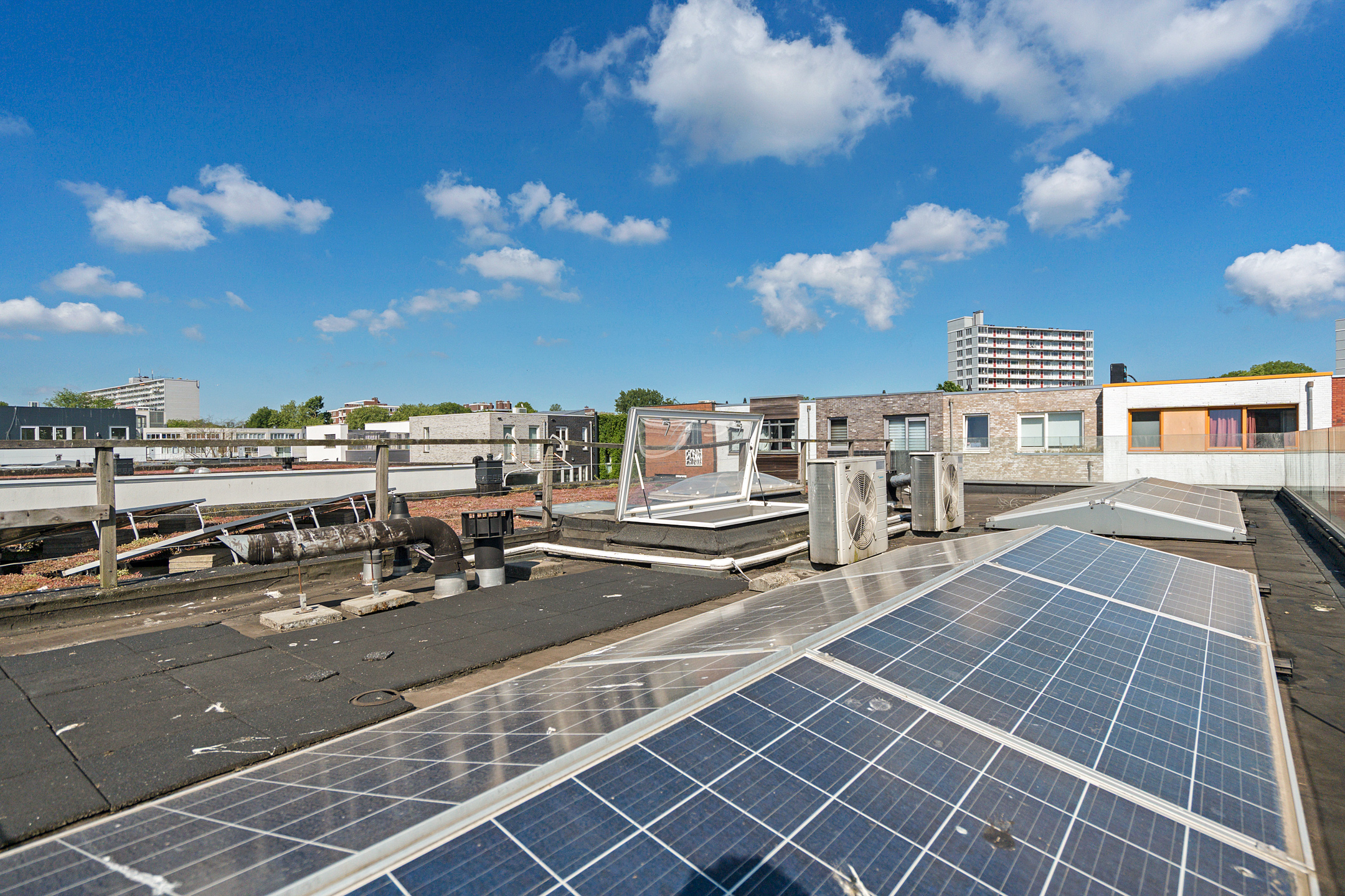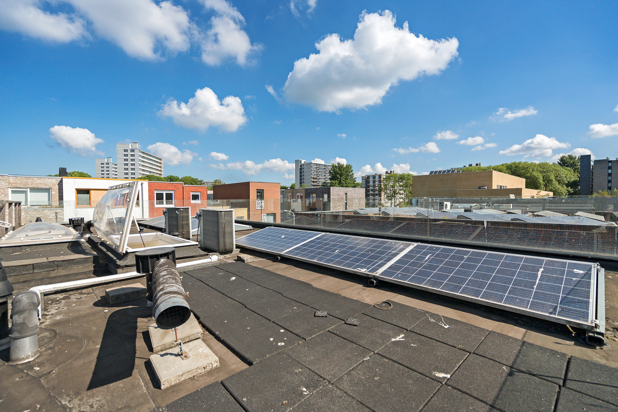 Via een vaste trap bereik je het dak, waar je een eigen gedeelte van het dakterras tot je beschikking hebt. Hier geniet je in alle rust van de zon en het vrije uitzicht. Daarnaast liggen hier de 6 zonnepanelen.