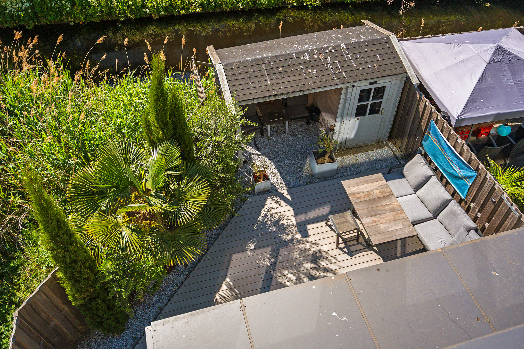 + Zonnige tuin aan het water met veranda en tuinhuis