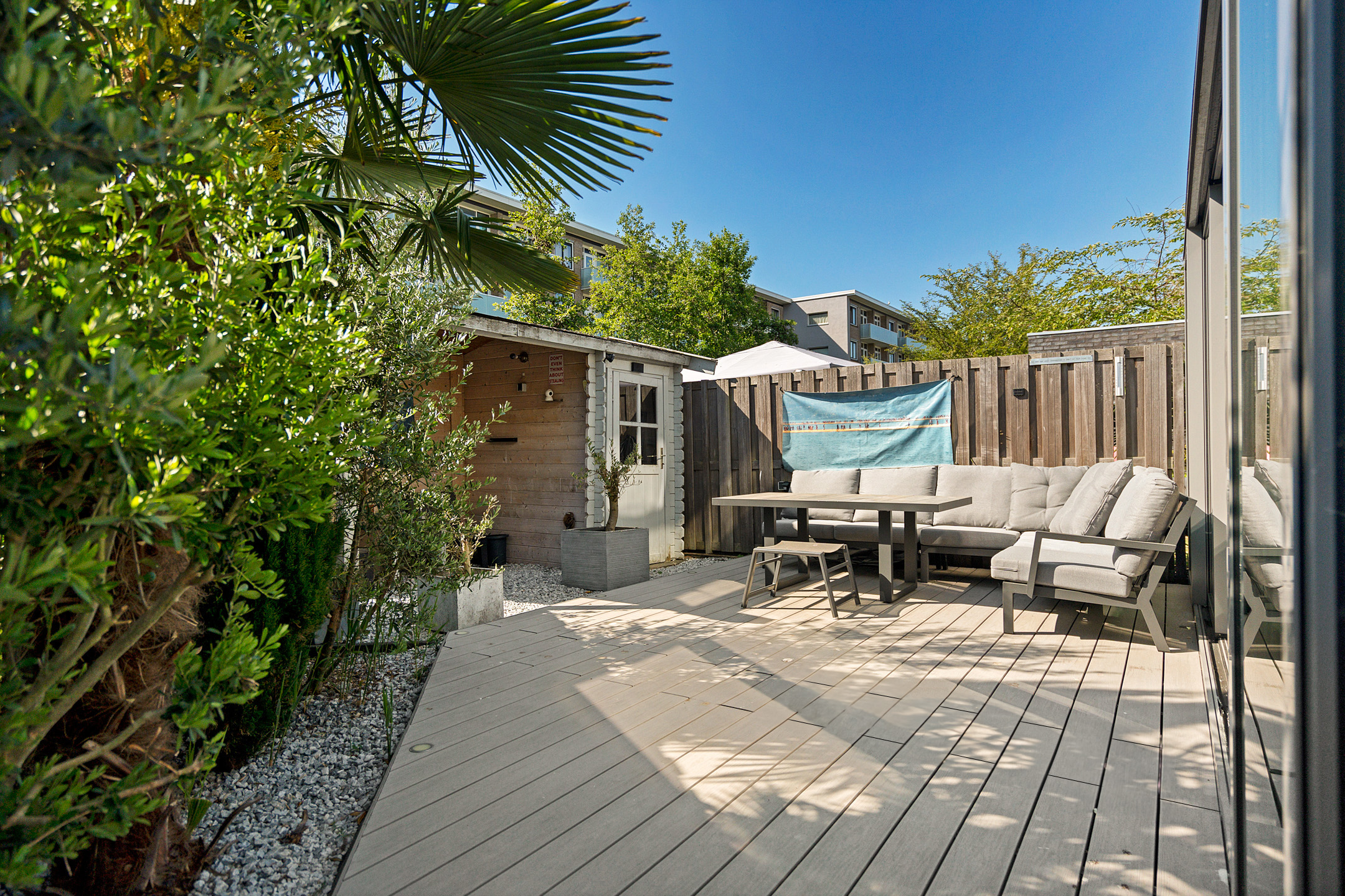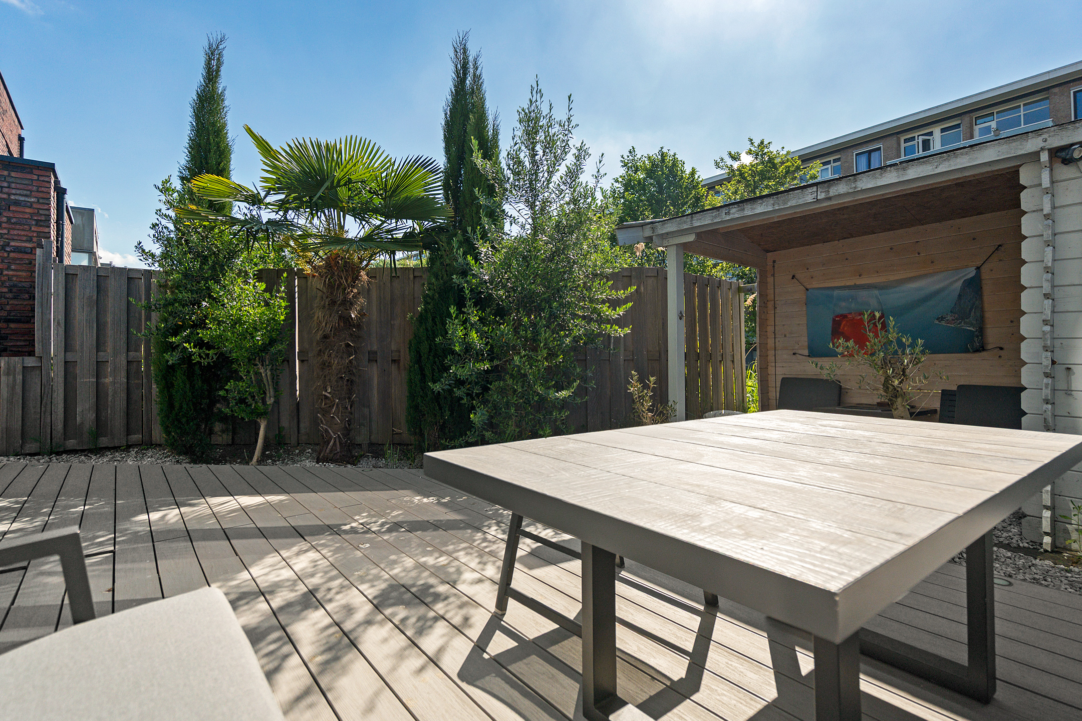 Het onderhoudsvriendelijke PVC-vlonderterras met inbouwspots en het tuinhuisje maken het plaatje compleet.