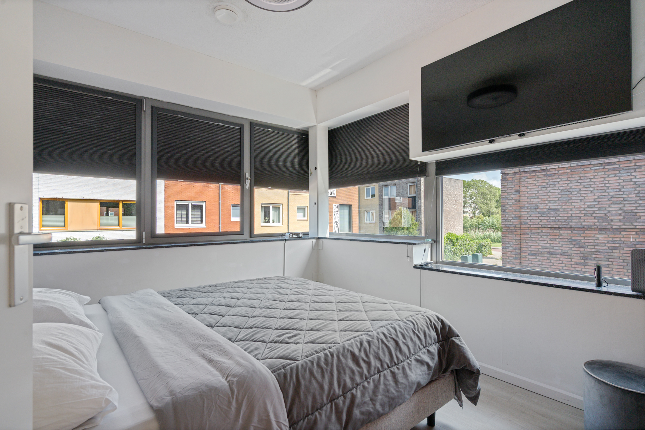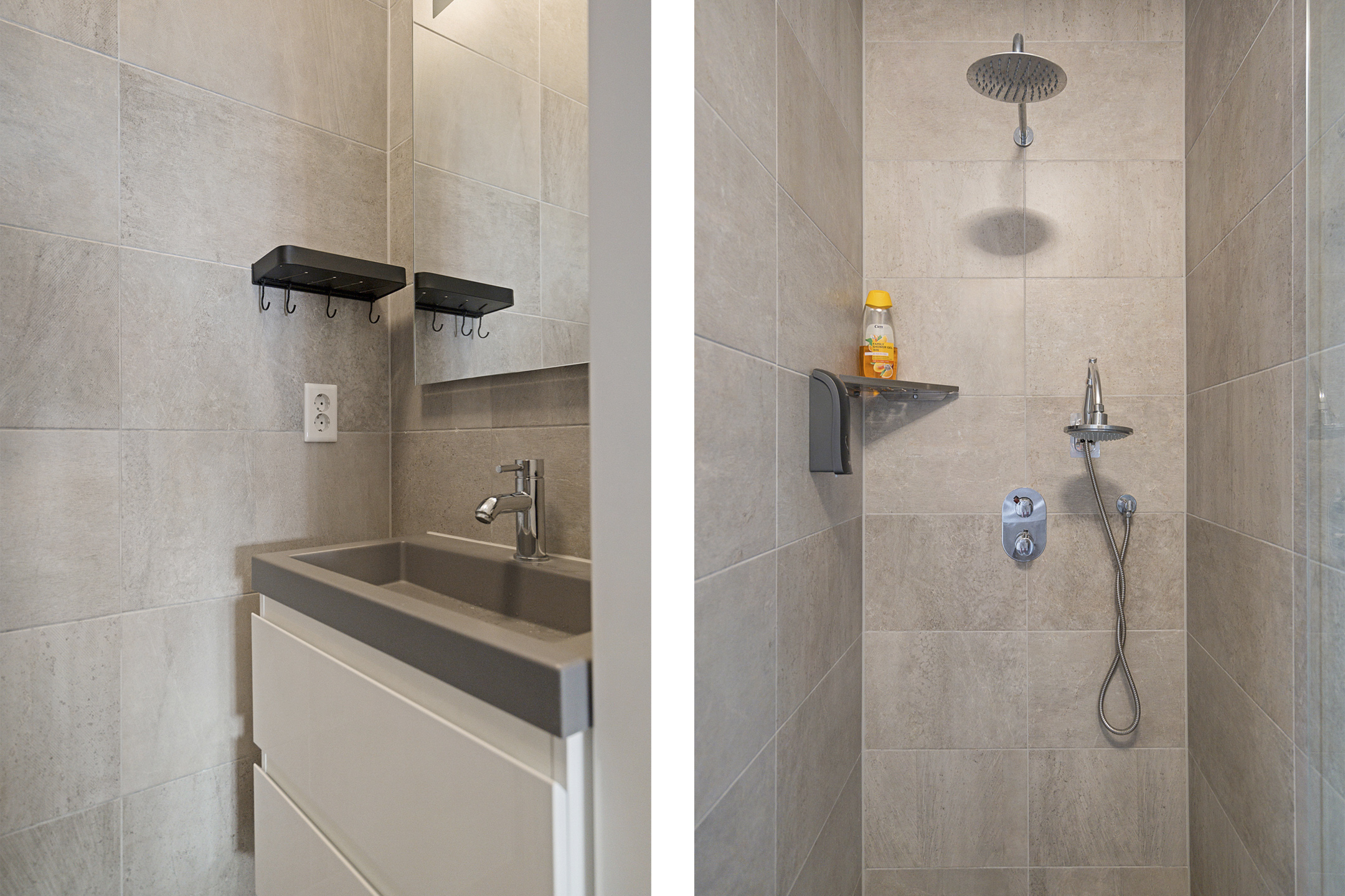 Via de goed belichte betonnen trap bereik je de eerste verdieping. Hier bevinden zich drie slaapkamers, waaronder een ruime hoofdslaapkamer aan de voorzijde. Alle kamers zijn netjes afgewerkt met een PVC-vloer. De moderne badkamer is voorzien van een inloopdouche met regendouche en handdouche, hangend toilet, strak wastafelmeubel, designradiator en mechanische ventilatie.