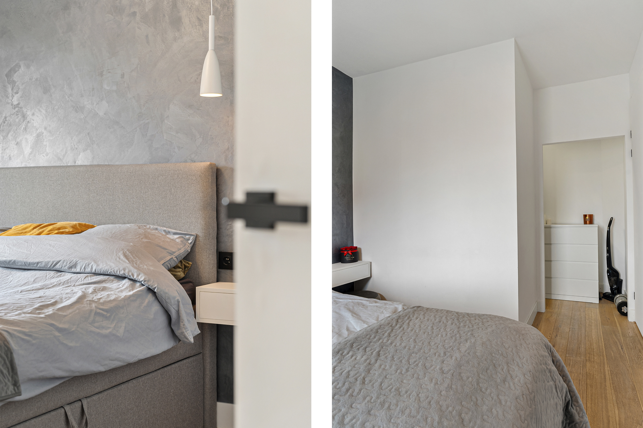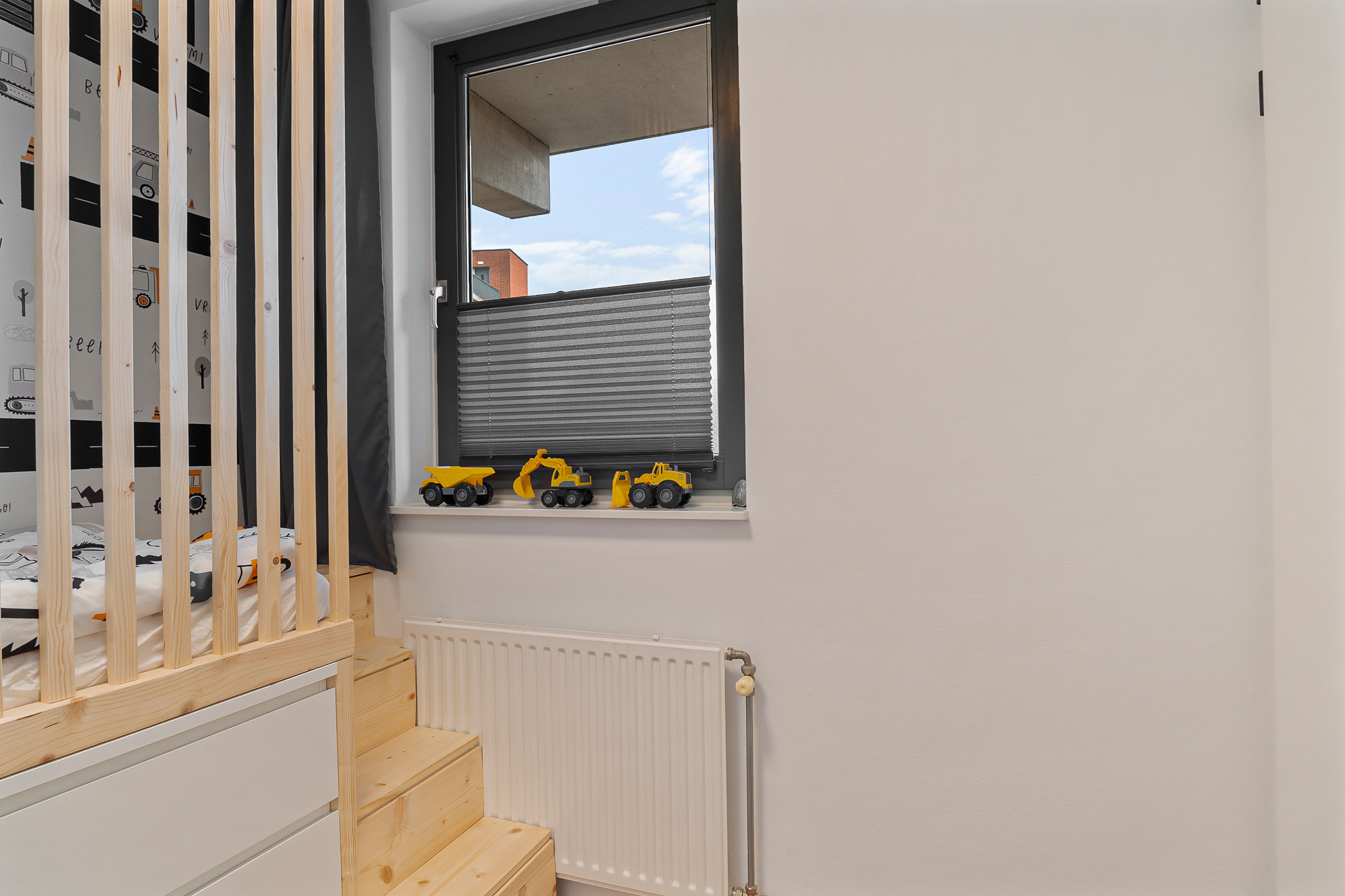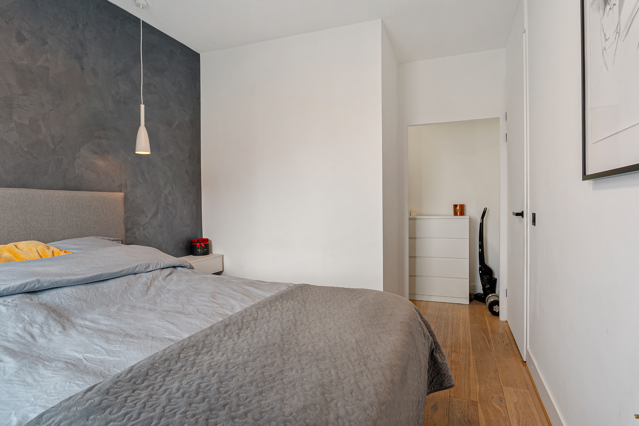 De hoofdslaapkamer aan de achterzijde beschikt over een royale inloopkast – een echte meerwaarde! De tweede slaapkamer aan de voorzijde is nu ingericht als kinderkamer met een praktische hoogslaper (ter overname) en biedt eveneens volop ruimte.