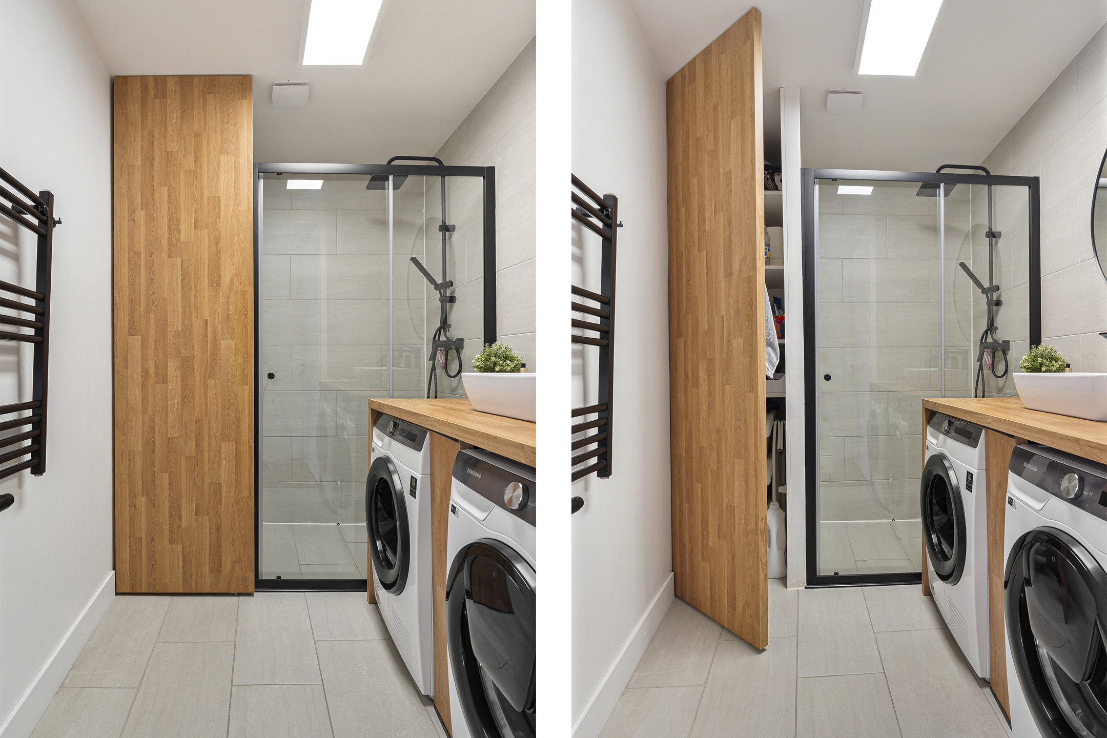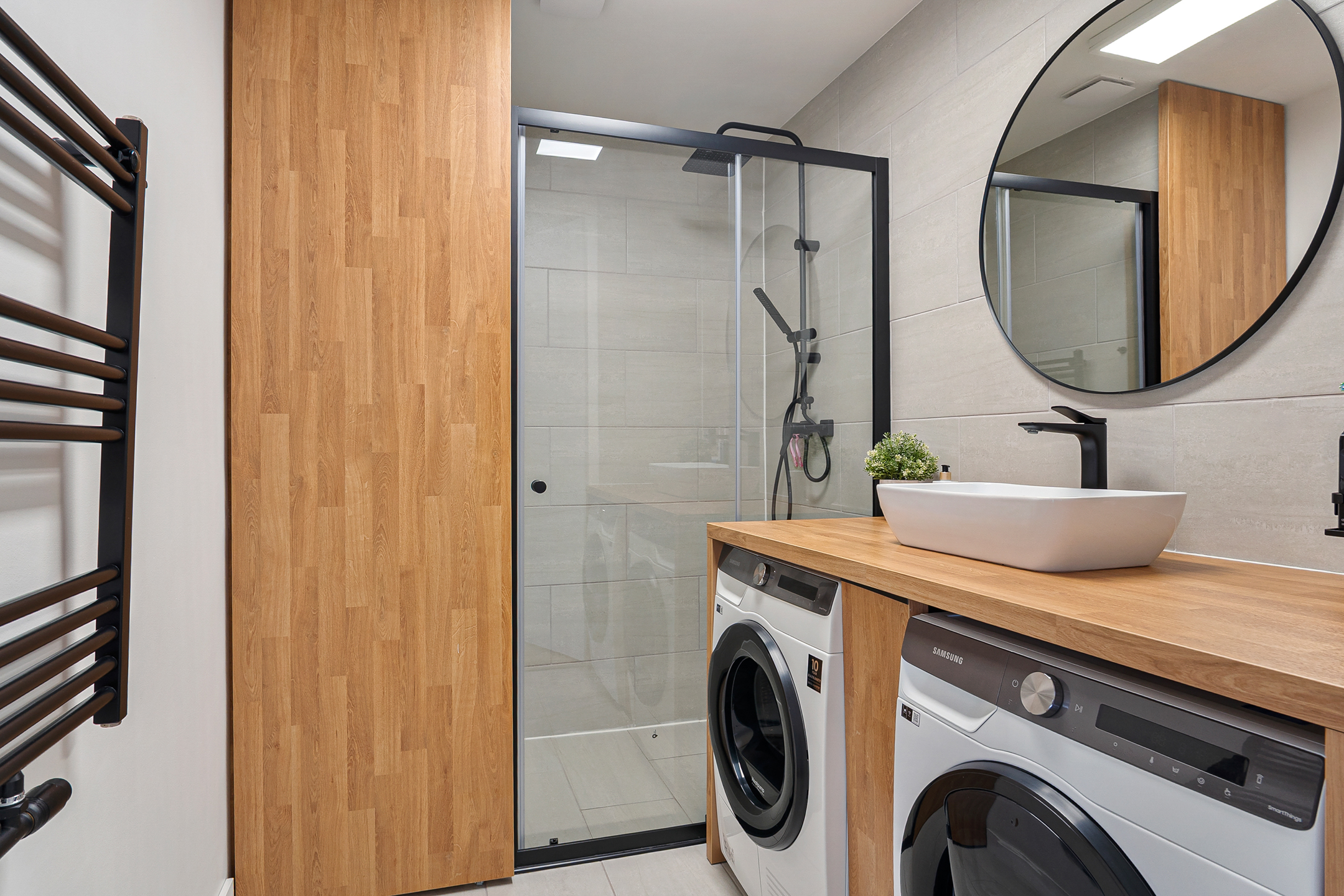 De badkamer is compact maar zeer efficiënt en stijlvol ingericht. Met een ruime inloopdouche, wastafelmeubel, bergruimte en aansluitingen voor de wasmachine en droger is deze ruimte praktisch én modern.