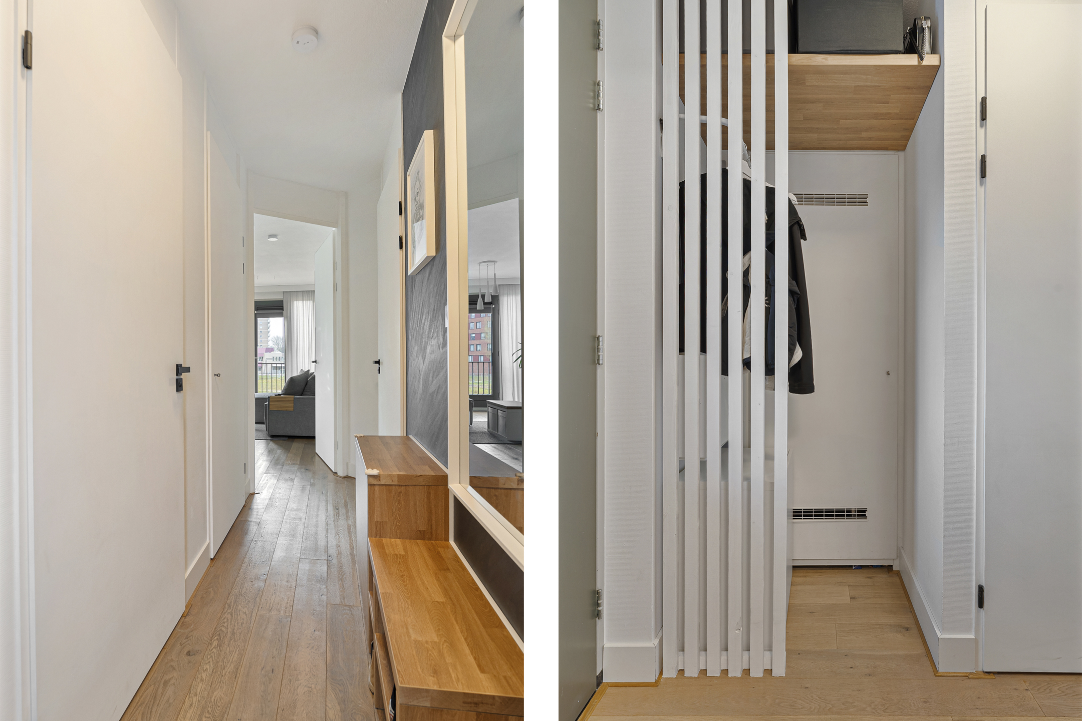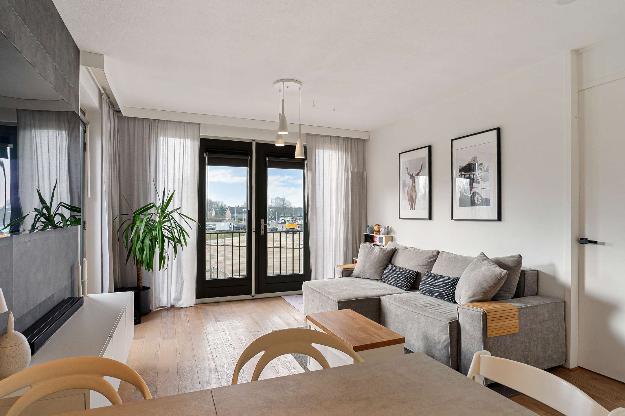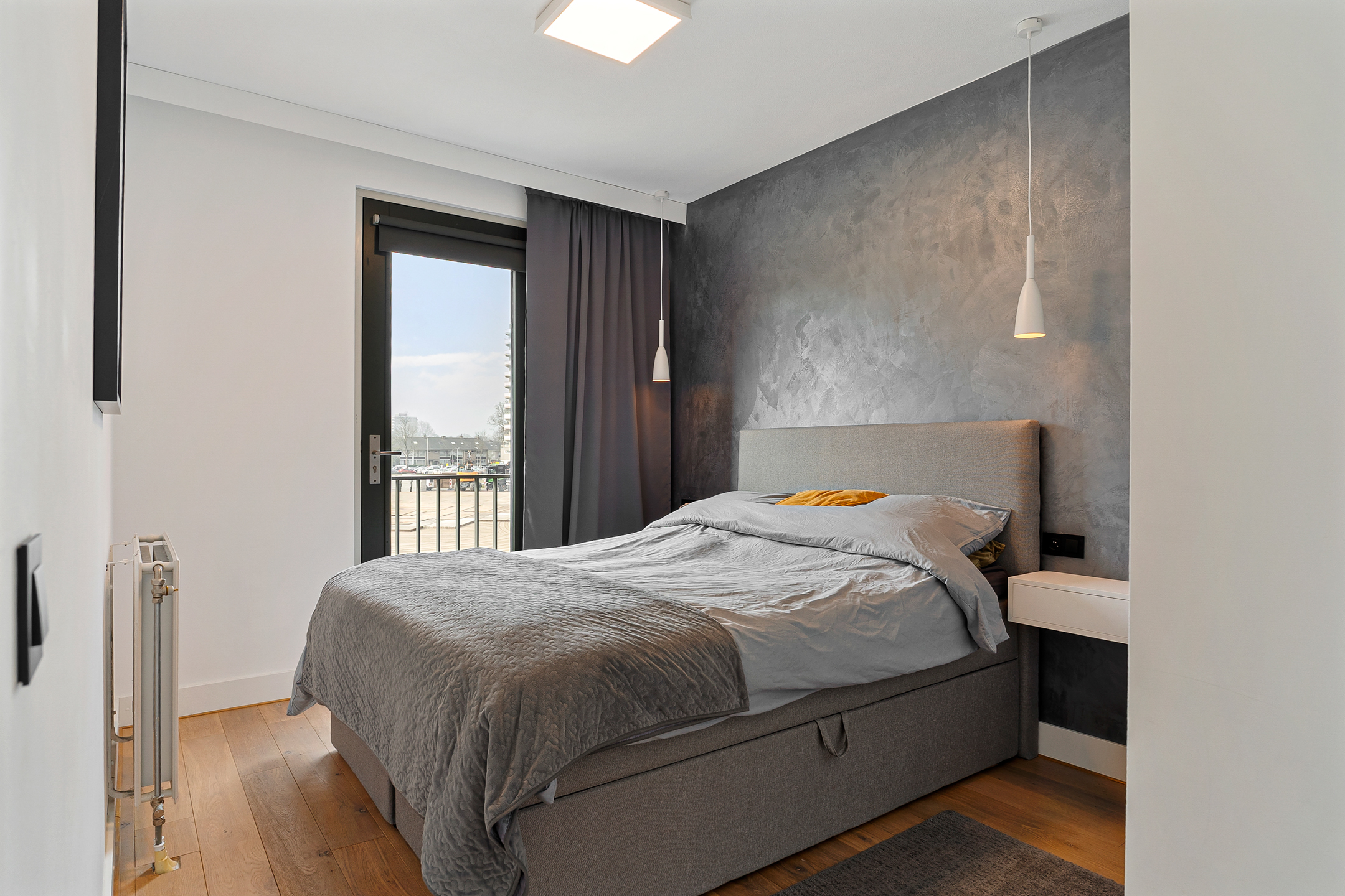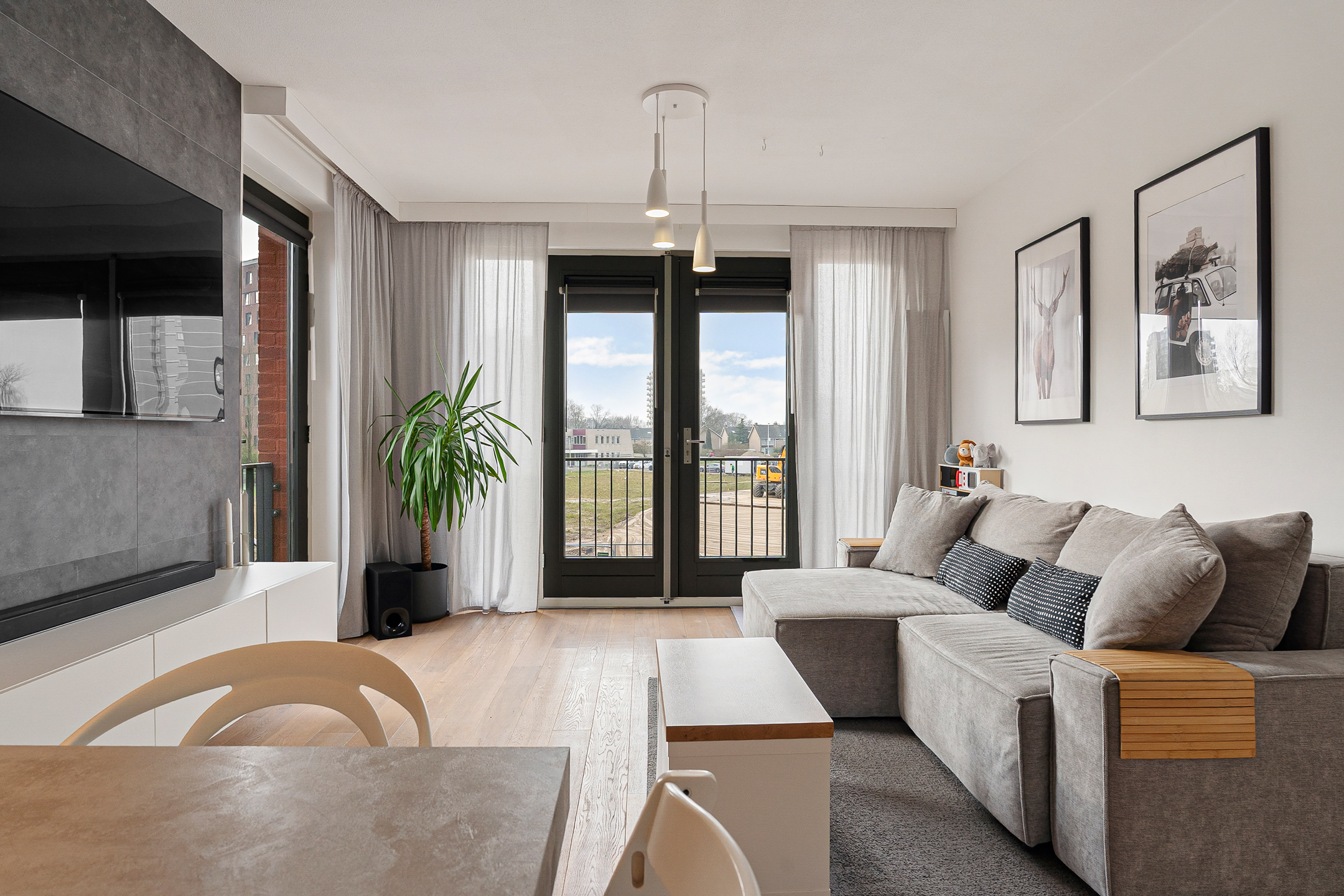 Via de nette galerij op de eerste verdieping bereik je de entree van de woning. In de hal vind je het separate toilet, een bergkast met cv-installatie en de moderne meterkast. De woonkamer voelt ruim en licht aan dankzij het extra zijraam en de dubbele openslaande deuren naar een Frans balkon. De muren zijn strak afgewerkt en de vloer is modern en neutraal gehouden.