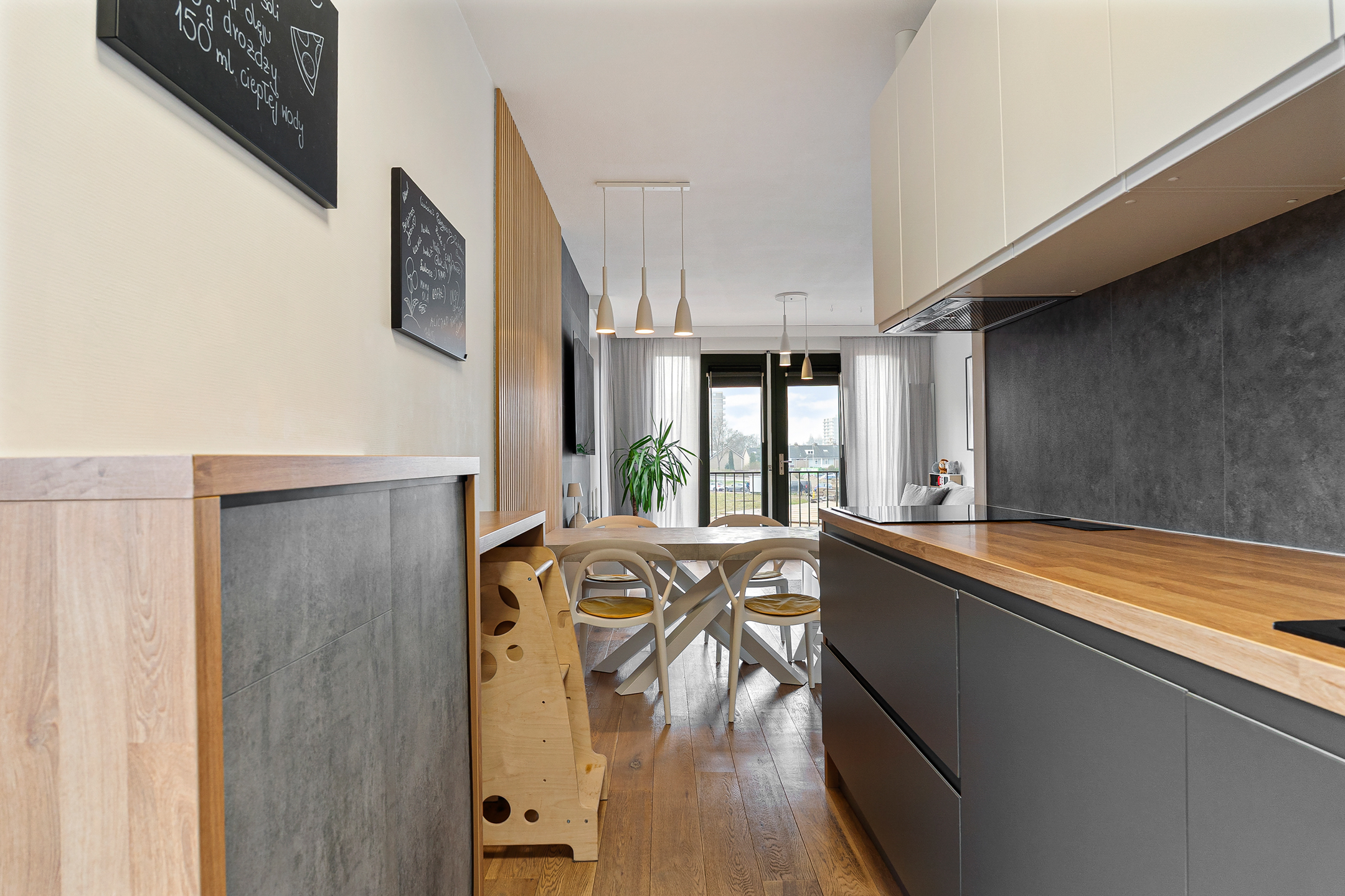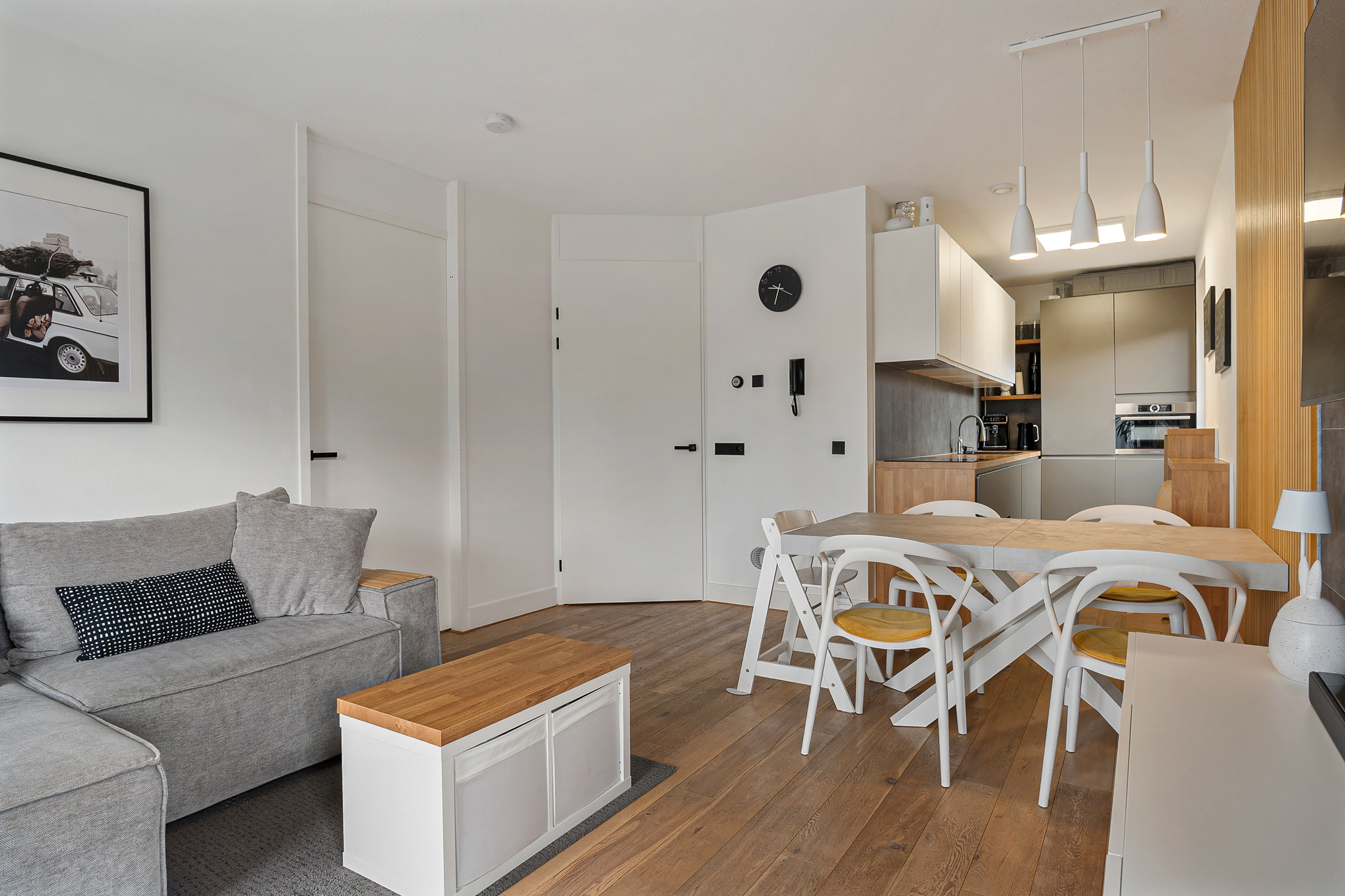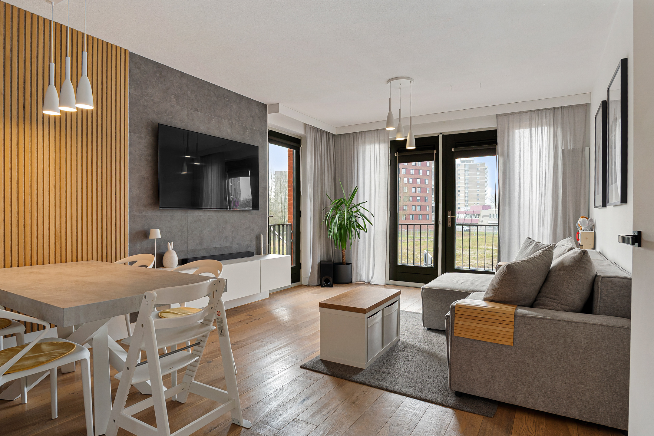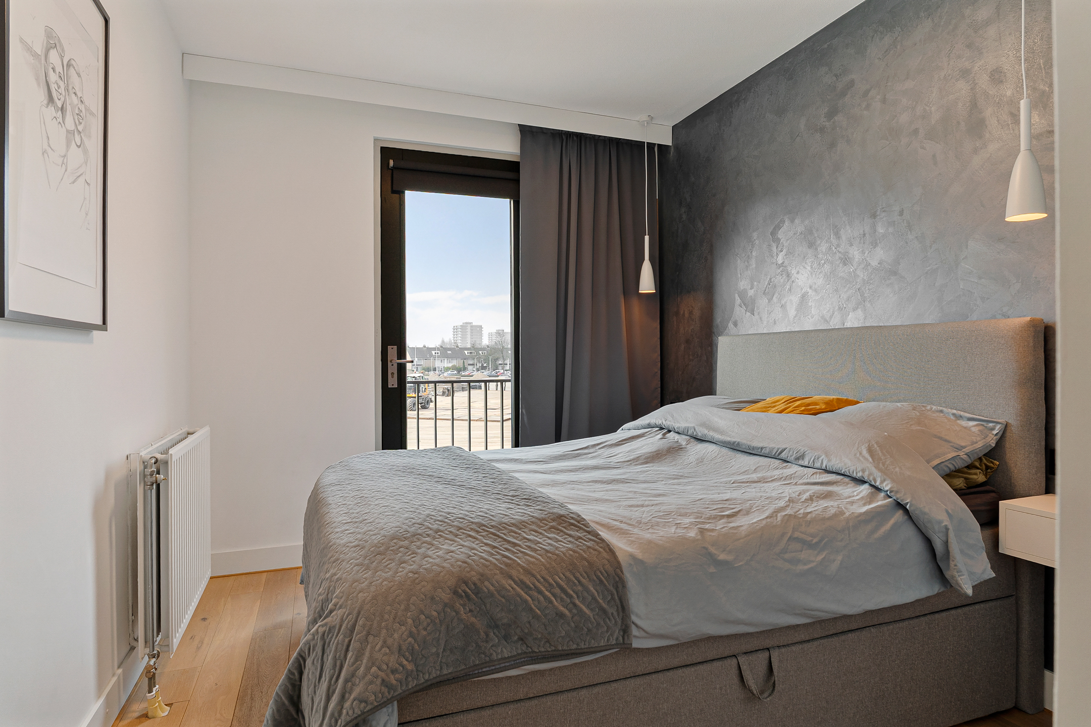 Via de nette galerij op de eerste verdieping bereik je de entree van de woning. In de hal vind je het separate toilet, een bergkast met cv-installatie en de moderne meterkast. De woonkamer voelt ruim en licht aan dankzij het extra zijraam en de dubbele openslaande deuren naar een Frans balkon. De muren zijn strak afgewerkt en de vloer is modern en neutraal gehouden.