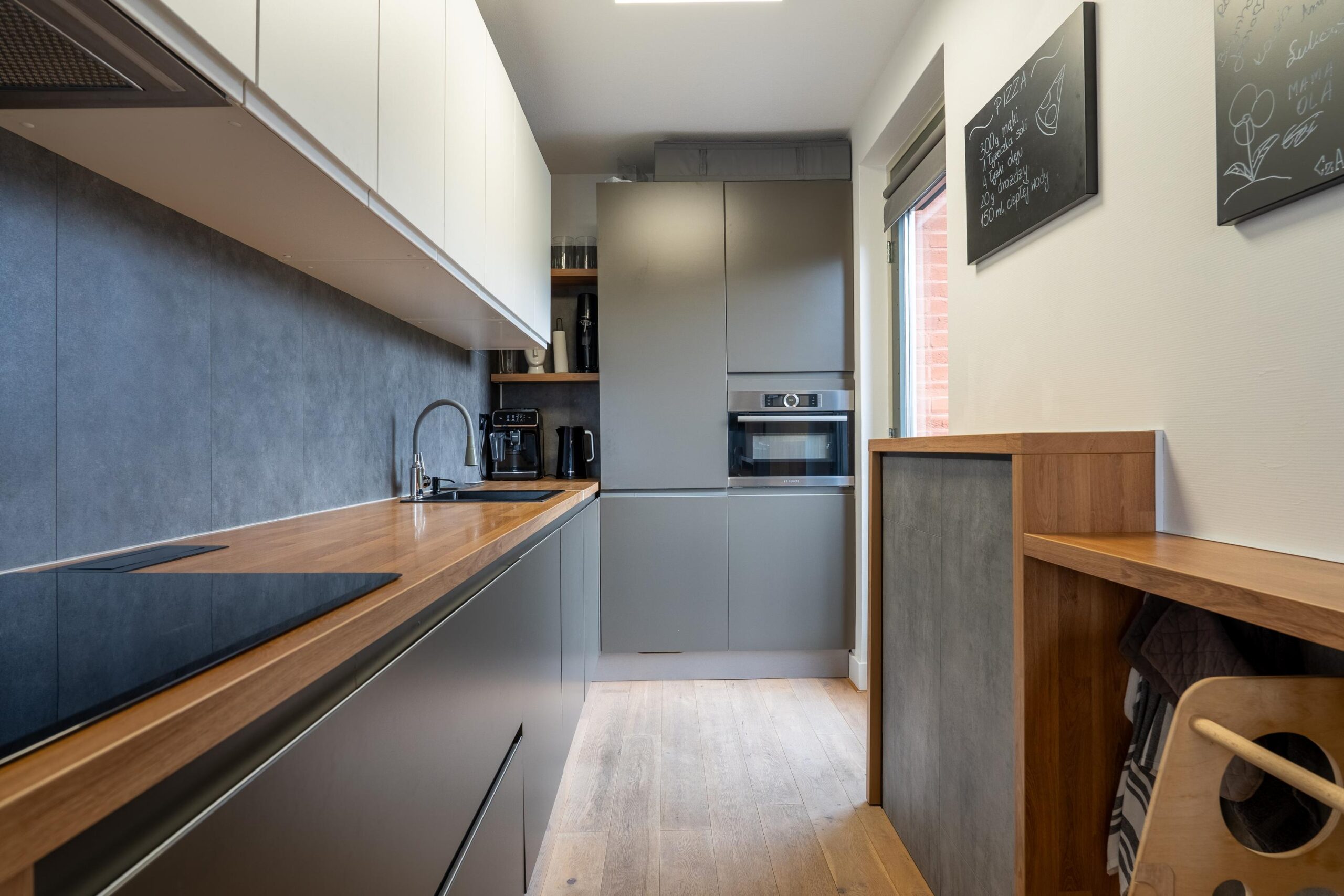 De open keuken aan de voorzijde is eveneens heerlijk licht en in 2021 volledig vernieuwd. Deze is voorzien van een inductiekookplaat, vaatwasser, koel-vriescombinatie en een combi-oven.