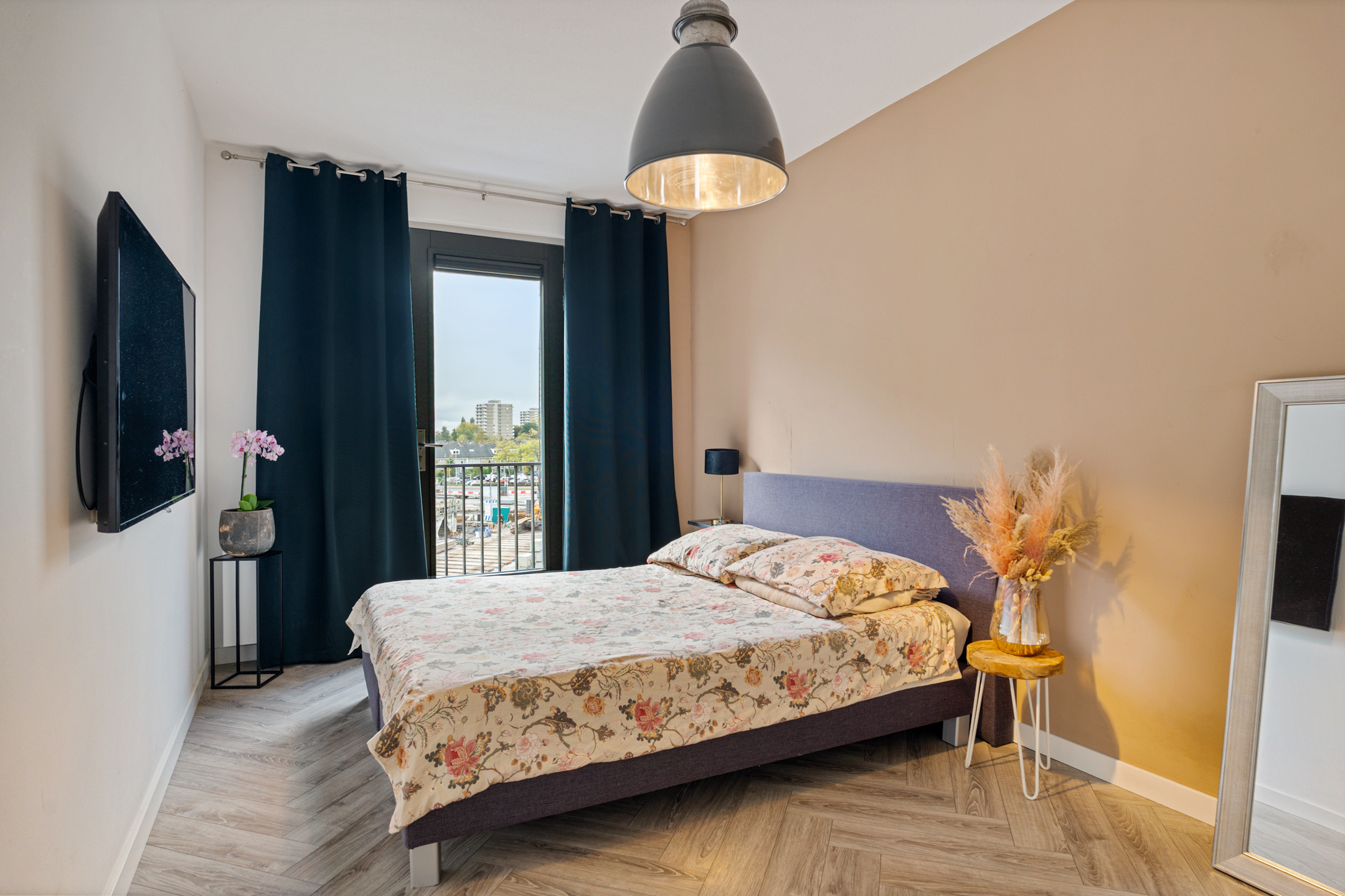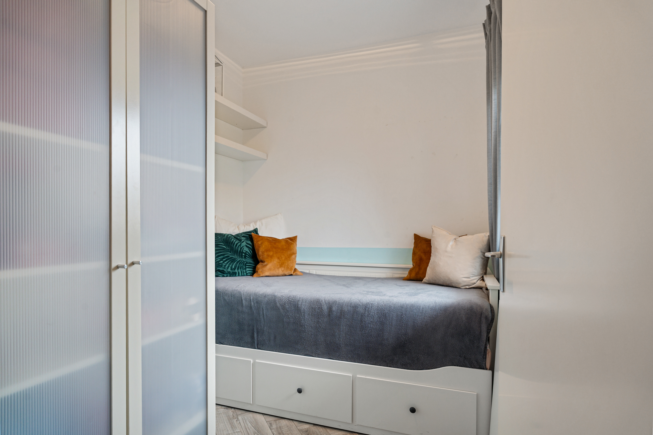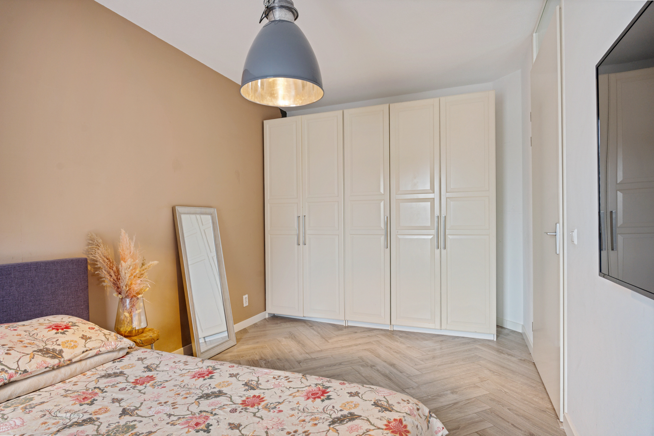 De hoofdslaapkamer aan de achterzijde beschikt over openslaande deuren naar het tweede Franse balkon, wat zorgt voor extra licht en ventilatie. De tweede slaapkamer aan de voorzijde is nu ingericht als kinderkamer, maar kan ook goed dienen als werk- of logeerkamer.