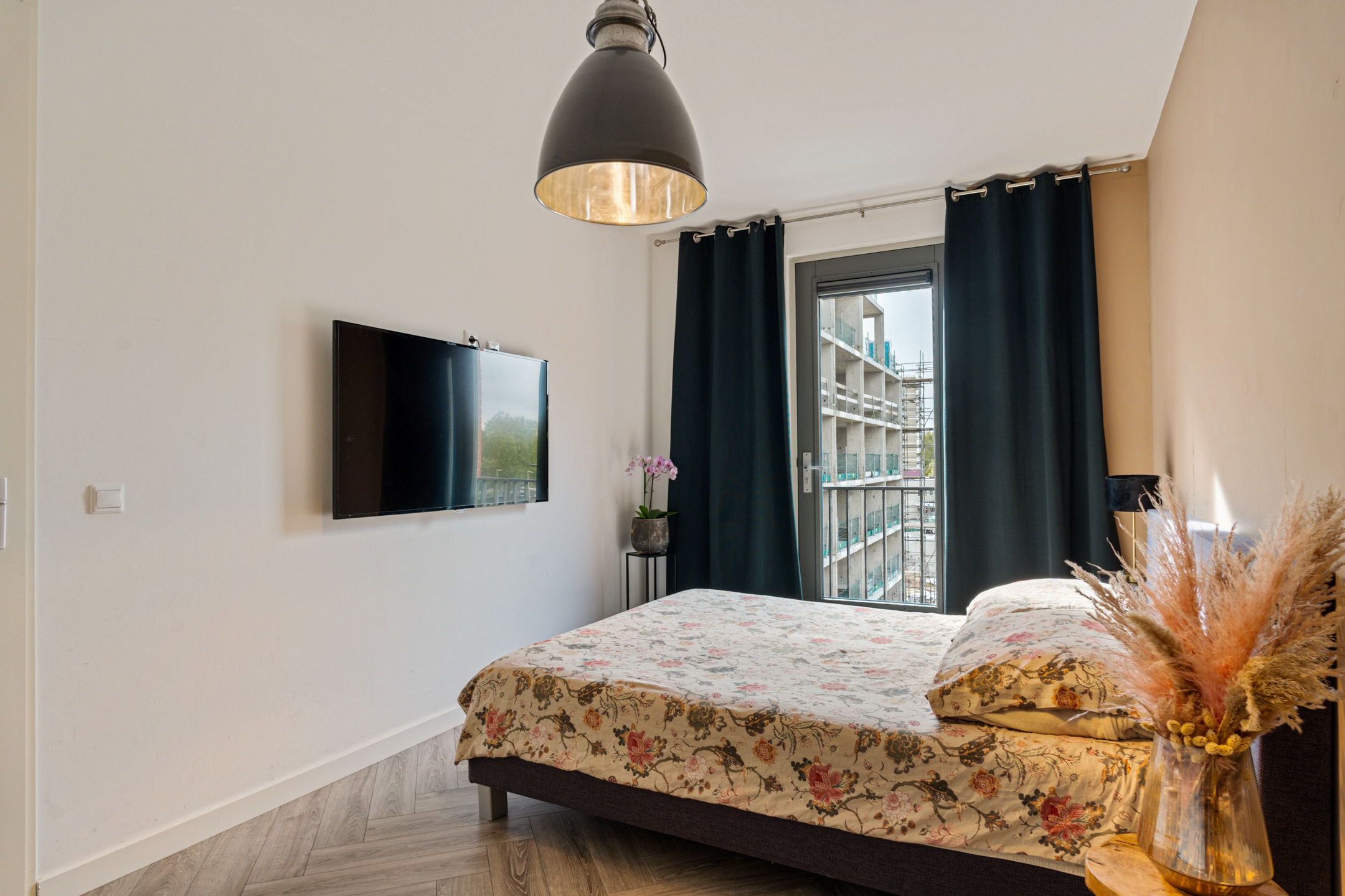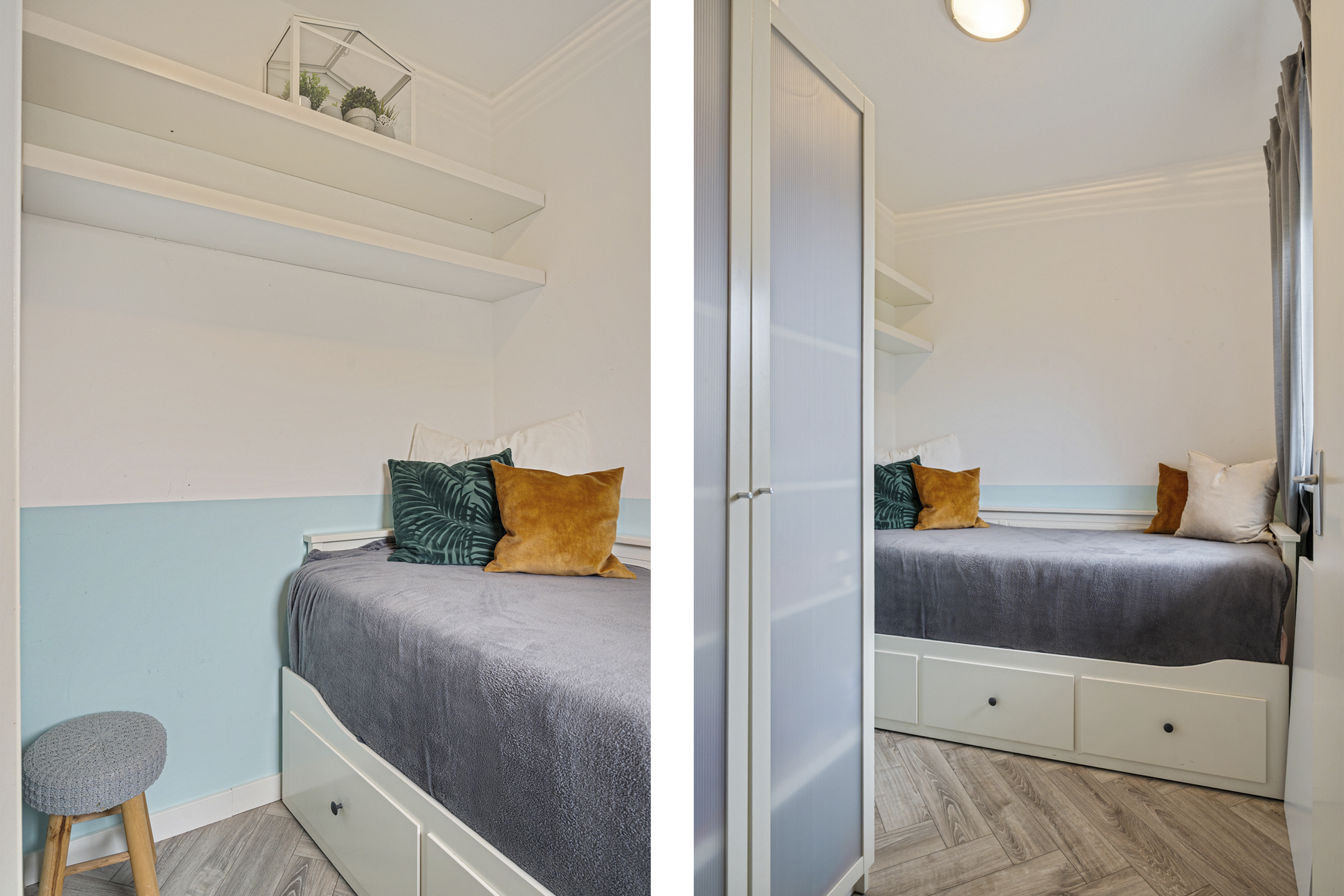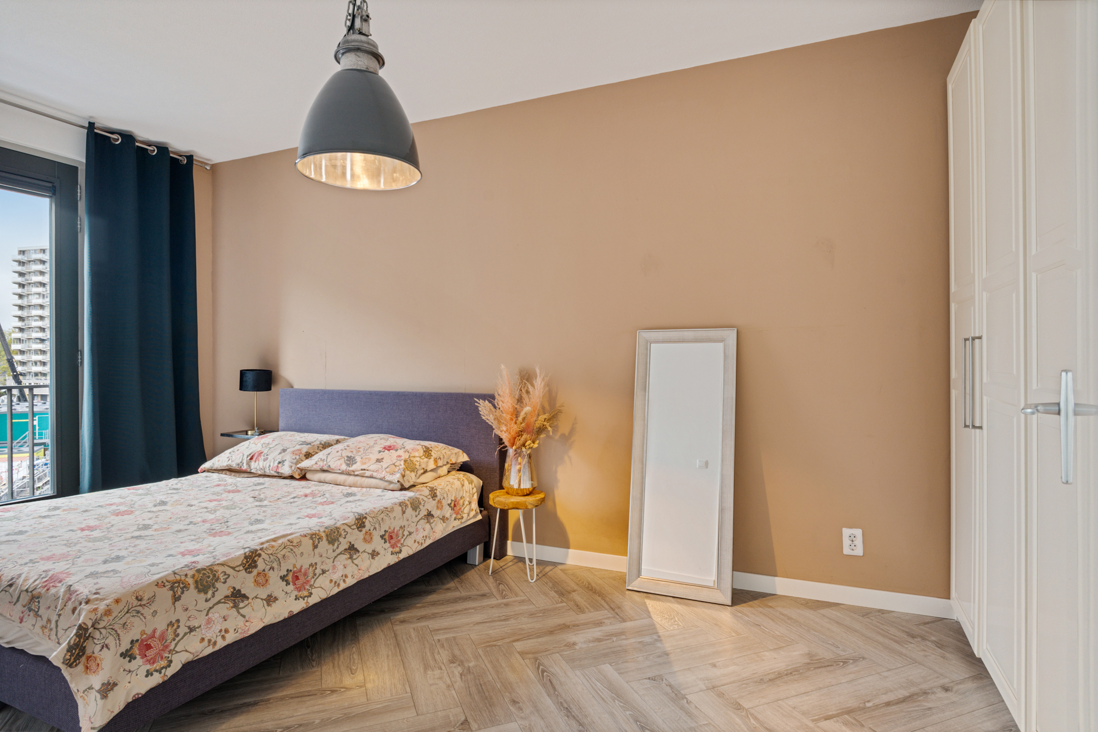 De hoofdslaapkamer aan de achterzijde beschikt over openslaande deuren naar het tweede Franse balkon, wat zorgt voor extra licht en ventilatie. De tweede slaapkamer aan de voorzijde is nu ingericht als kinderkamer, maar kan ook goed dienen als werk- of logeerkamer.