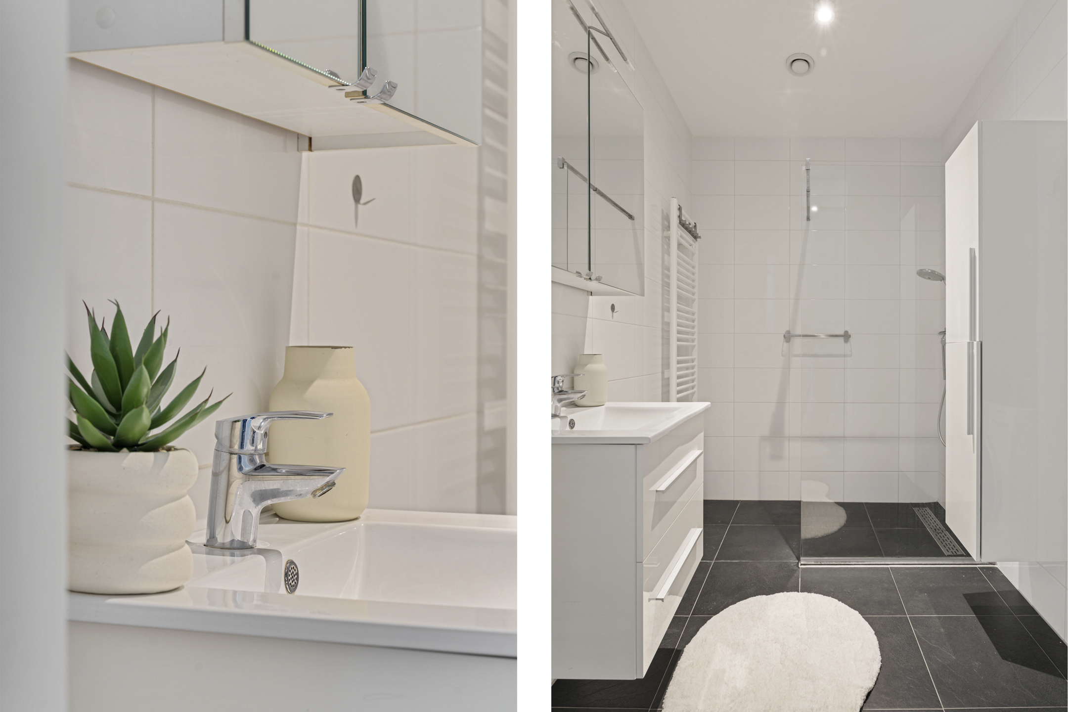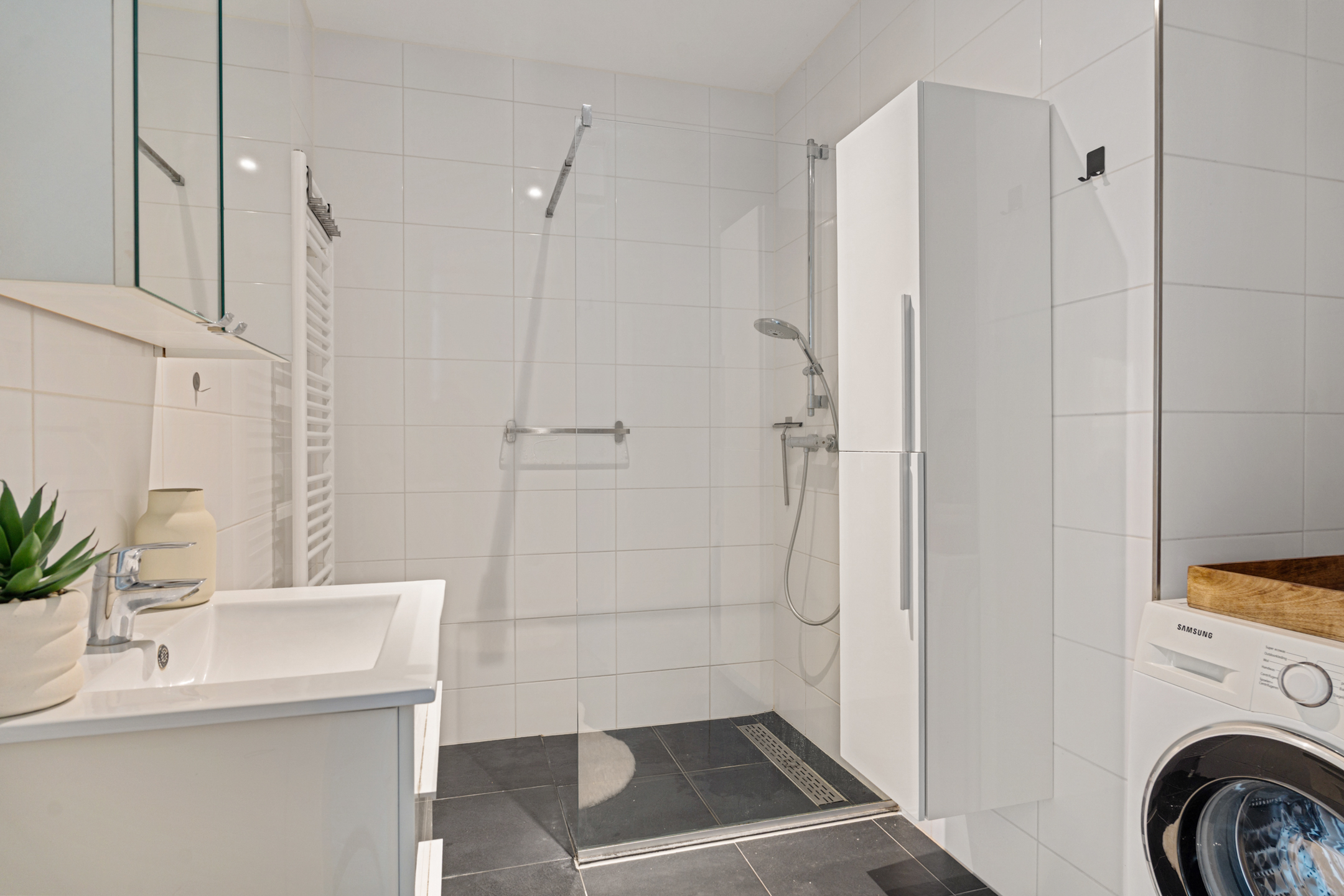 De badkamer is licht en functioneel ingedeeld met een inloopdouche, wastafelmeubel en aansluiting voor de wasmachine.