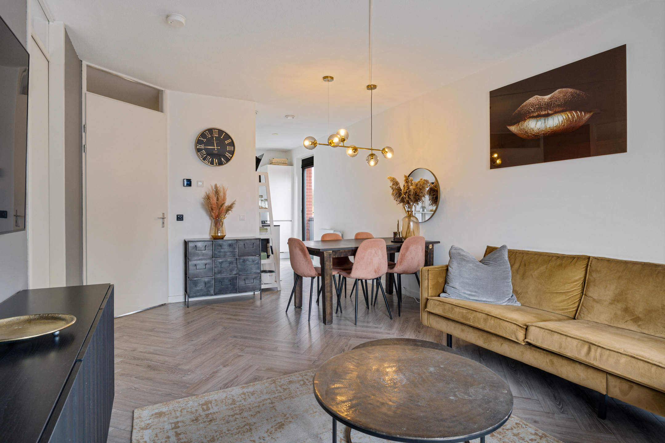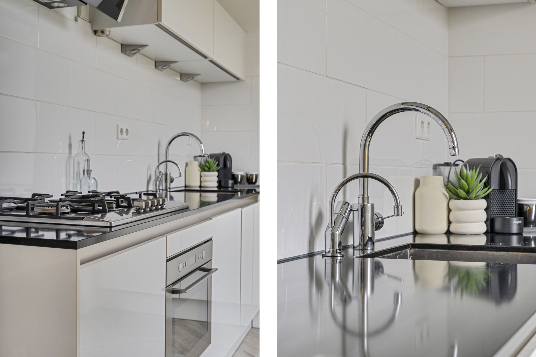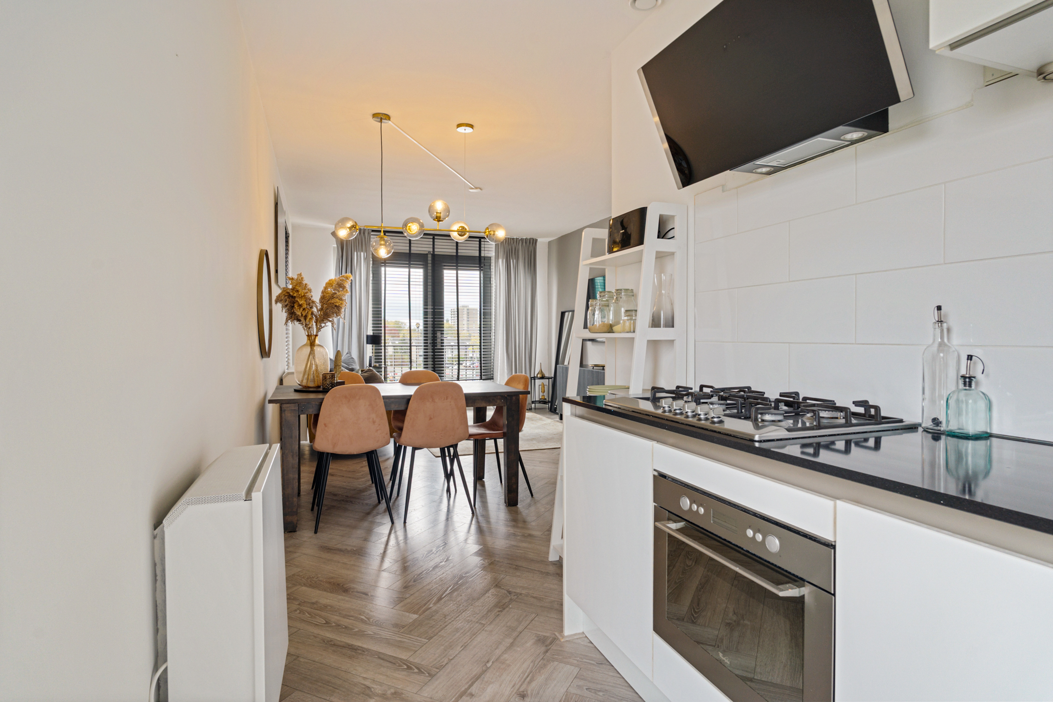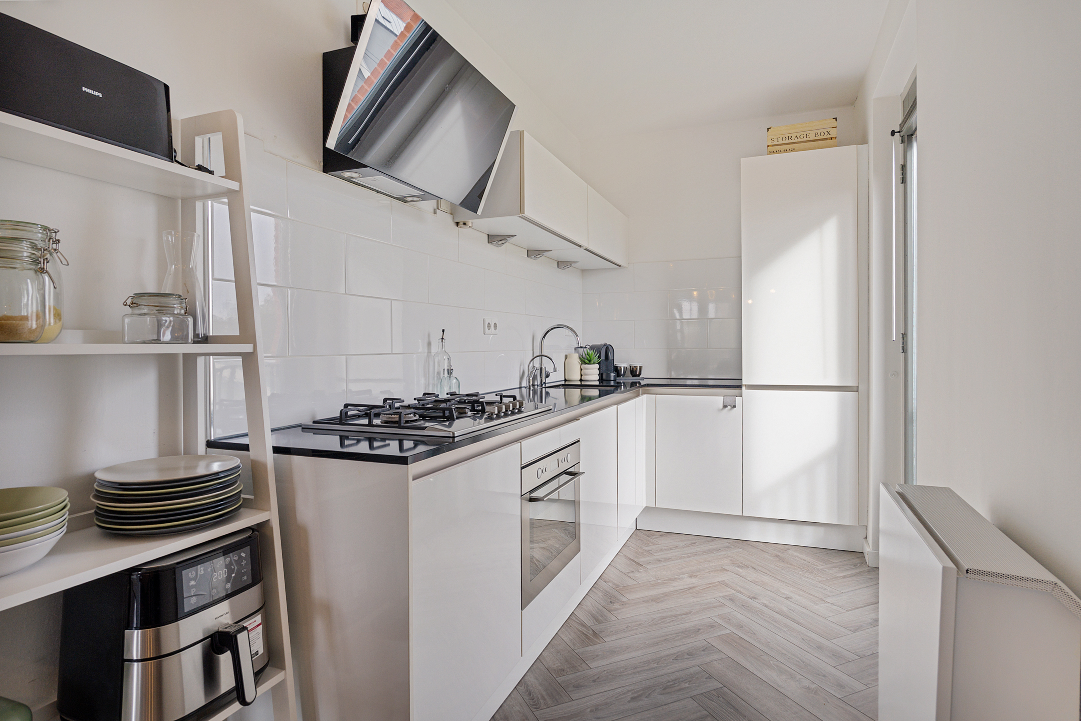 De woonkamer voelt licht en ruim aan dankzij de hoekligging, het extra zijraam en de dubbele openslaande deuren naar het Franse balkon. De wanden zijn strak afgewerkt en de inrichting is modern en stijlvol. De open keuken aan de voorzijde is eveneens heerlijk licht en voorzien van een vijfpits gaskookplaat, vaatwasser, koel-vriescombinatie, Quooker en oven. De grote ramen zorgen voor een prettige sfeer tijdens het koken.