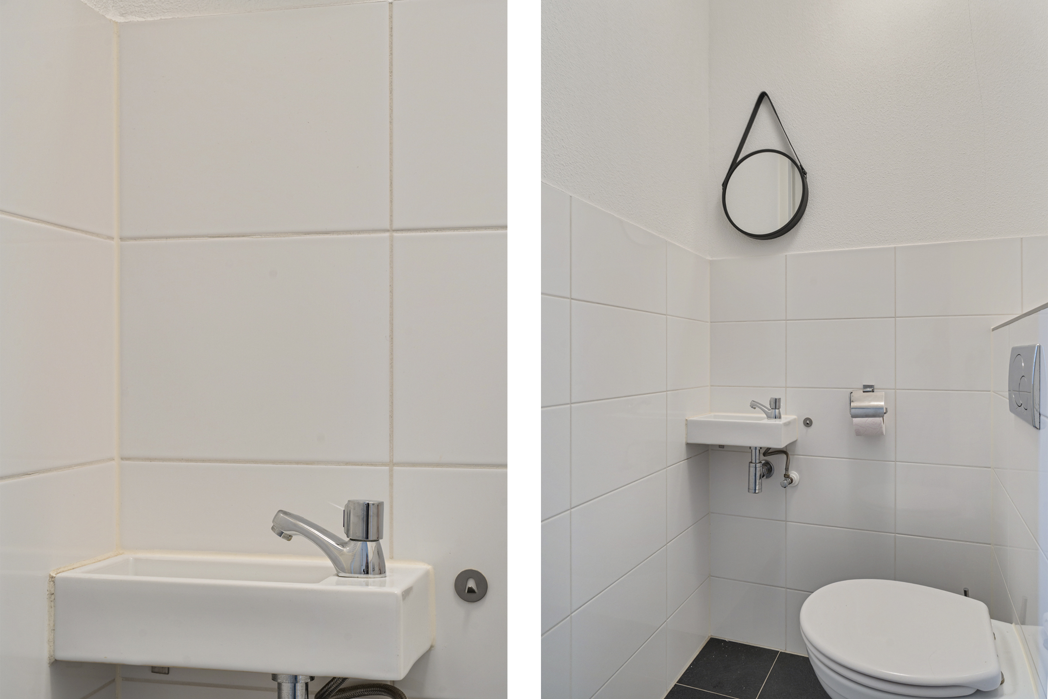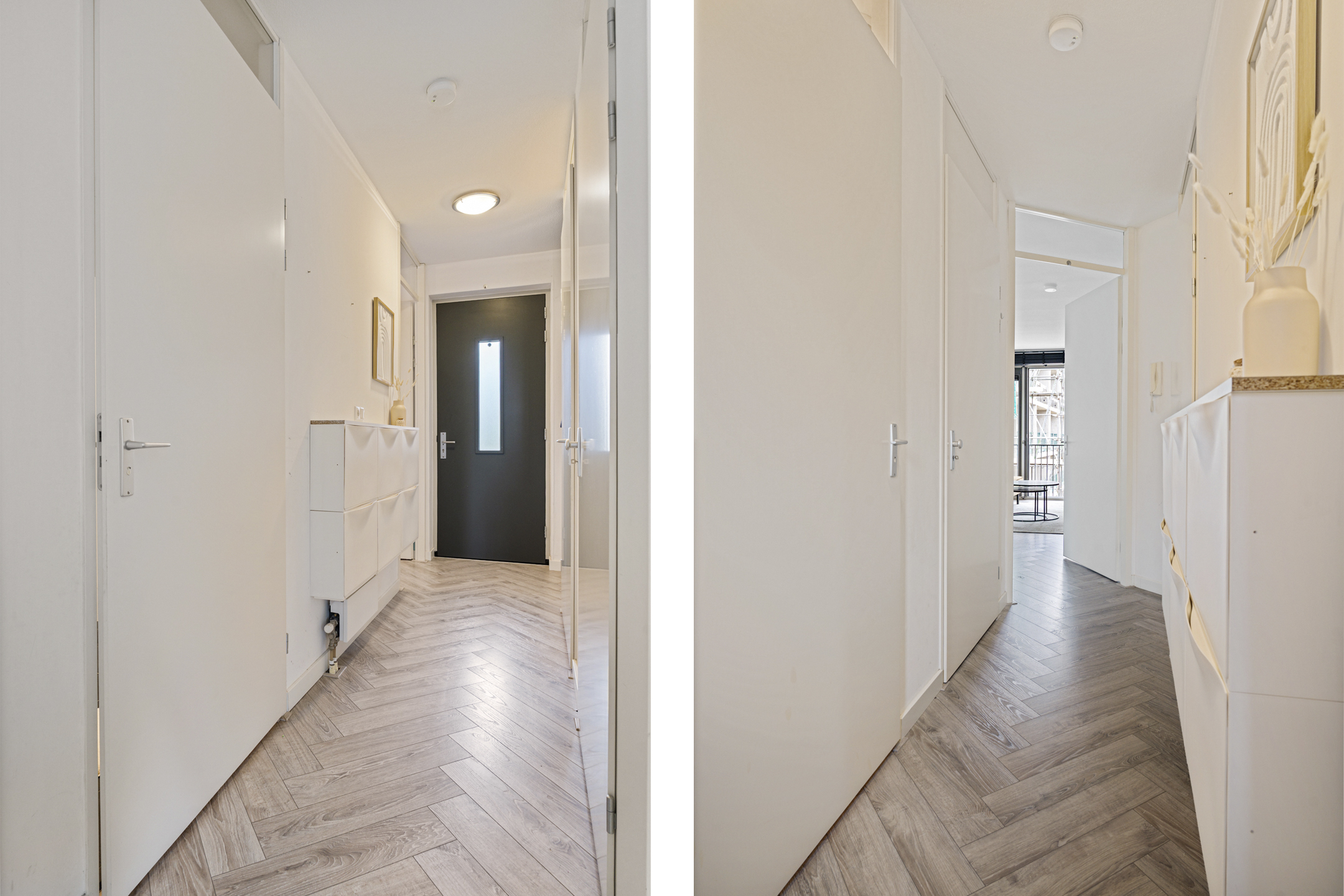 Via de galerij kom je bij de entree van het appartement. De hal geeft toegang tot het separate toilet, een bergkast met cv-installatie en de moderne meterkast.