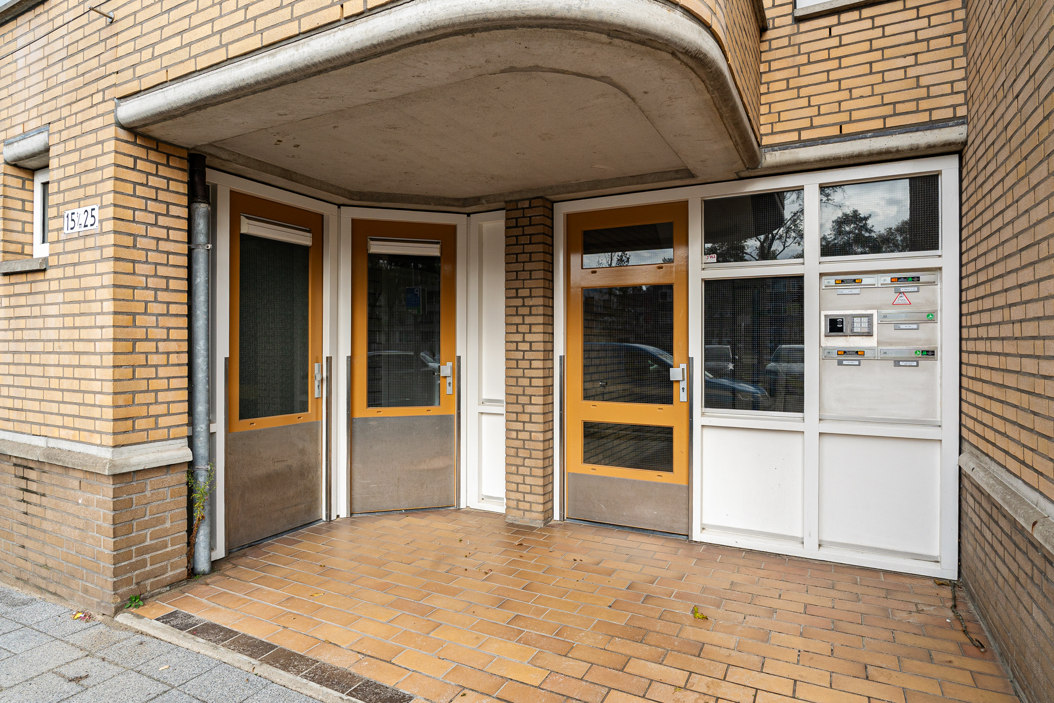 Verzorgd portiek met brievenbussen en trapopgang naar de verdiepingen.