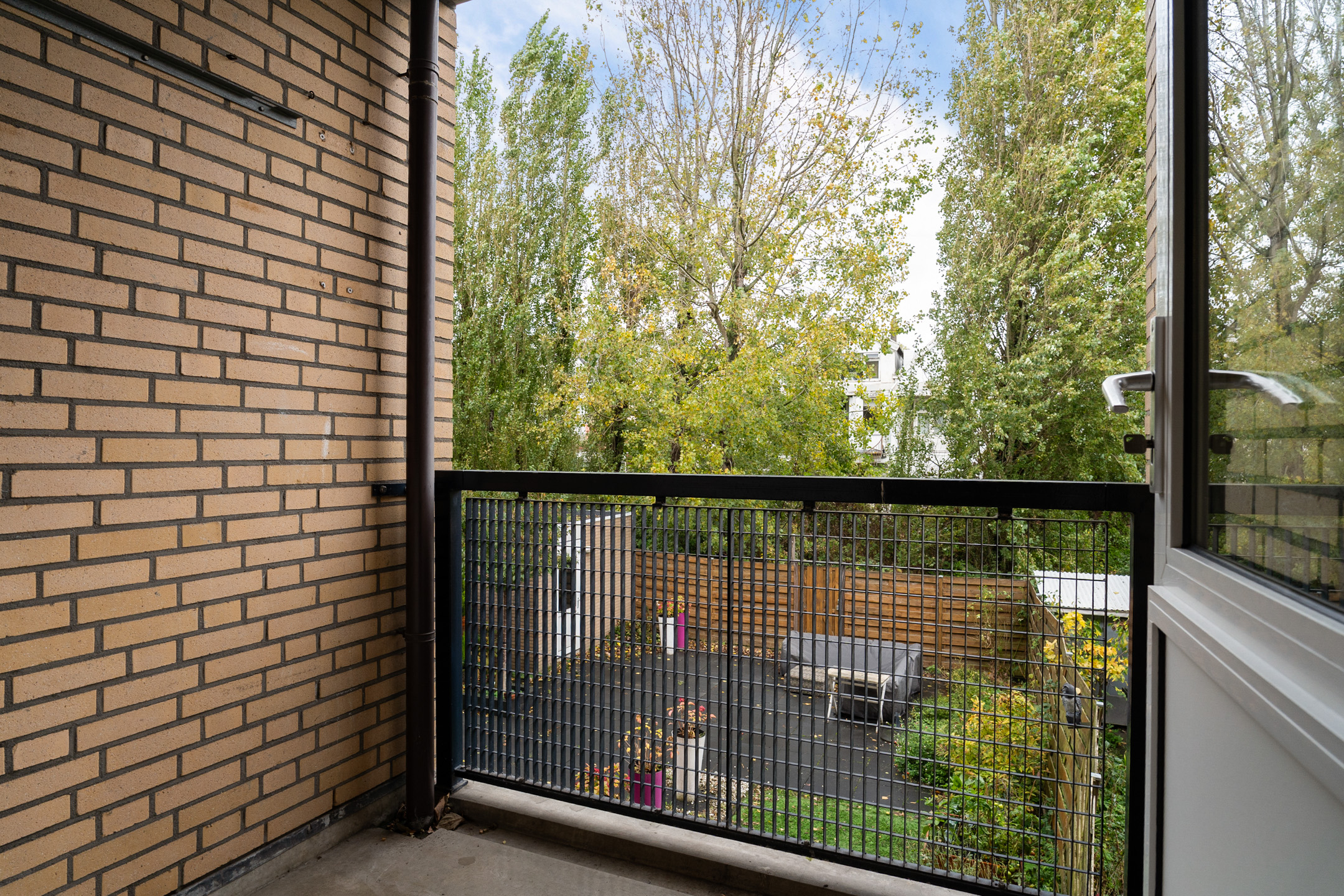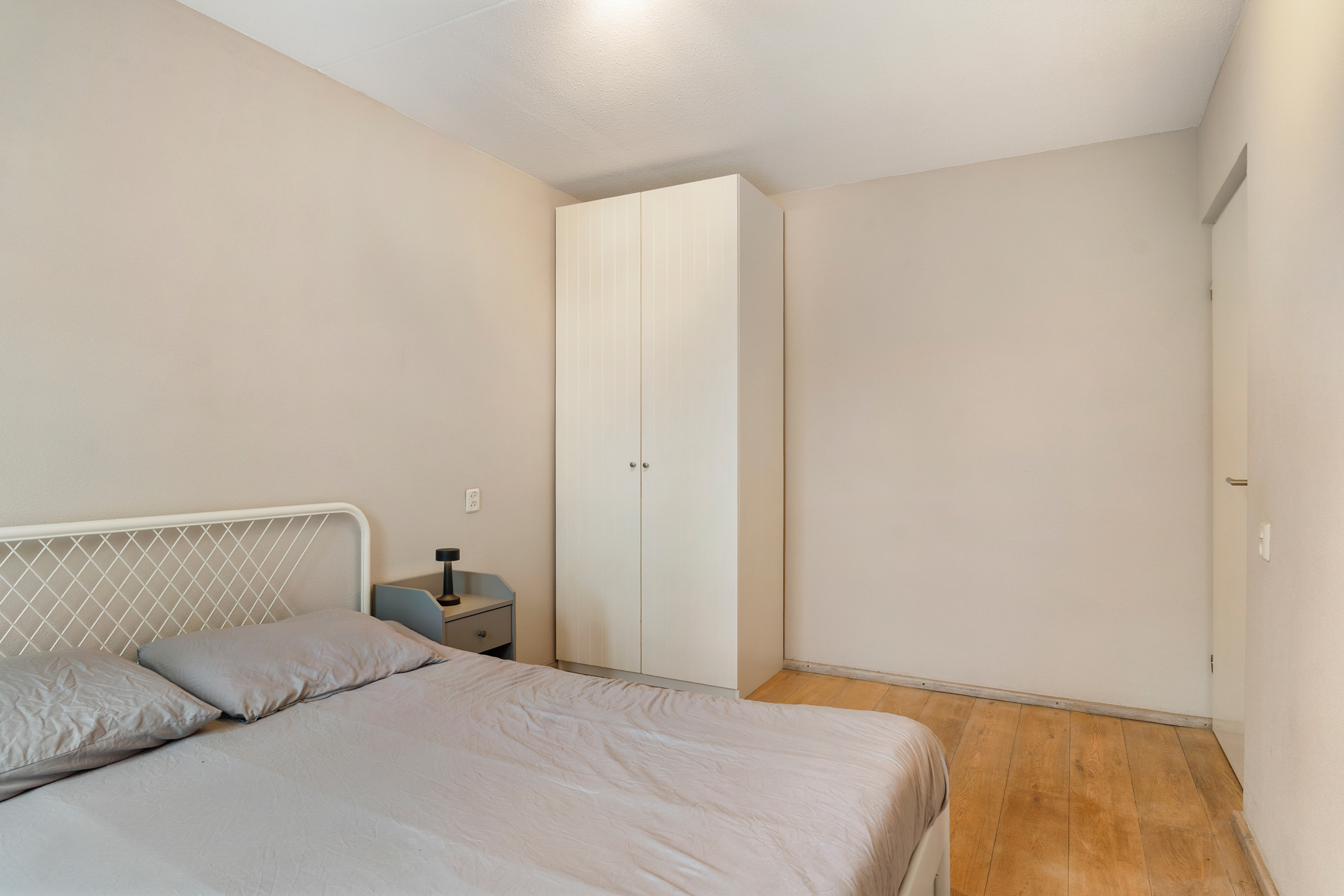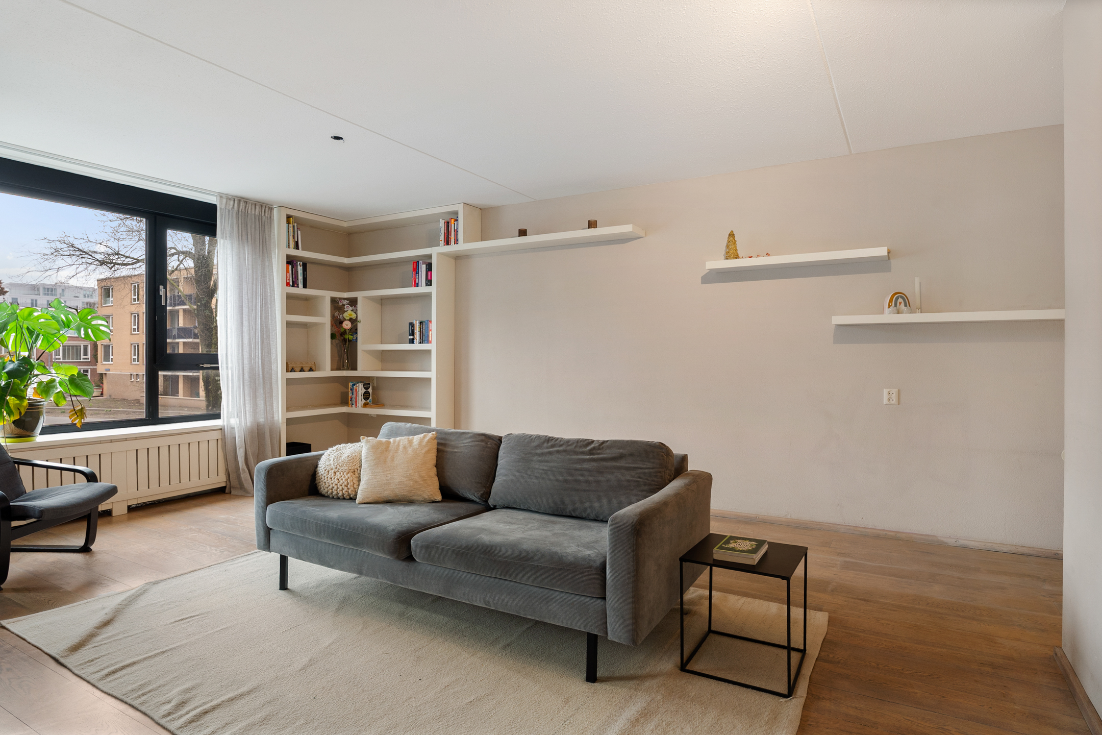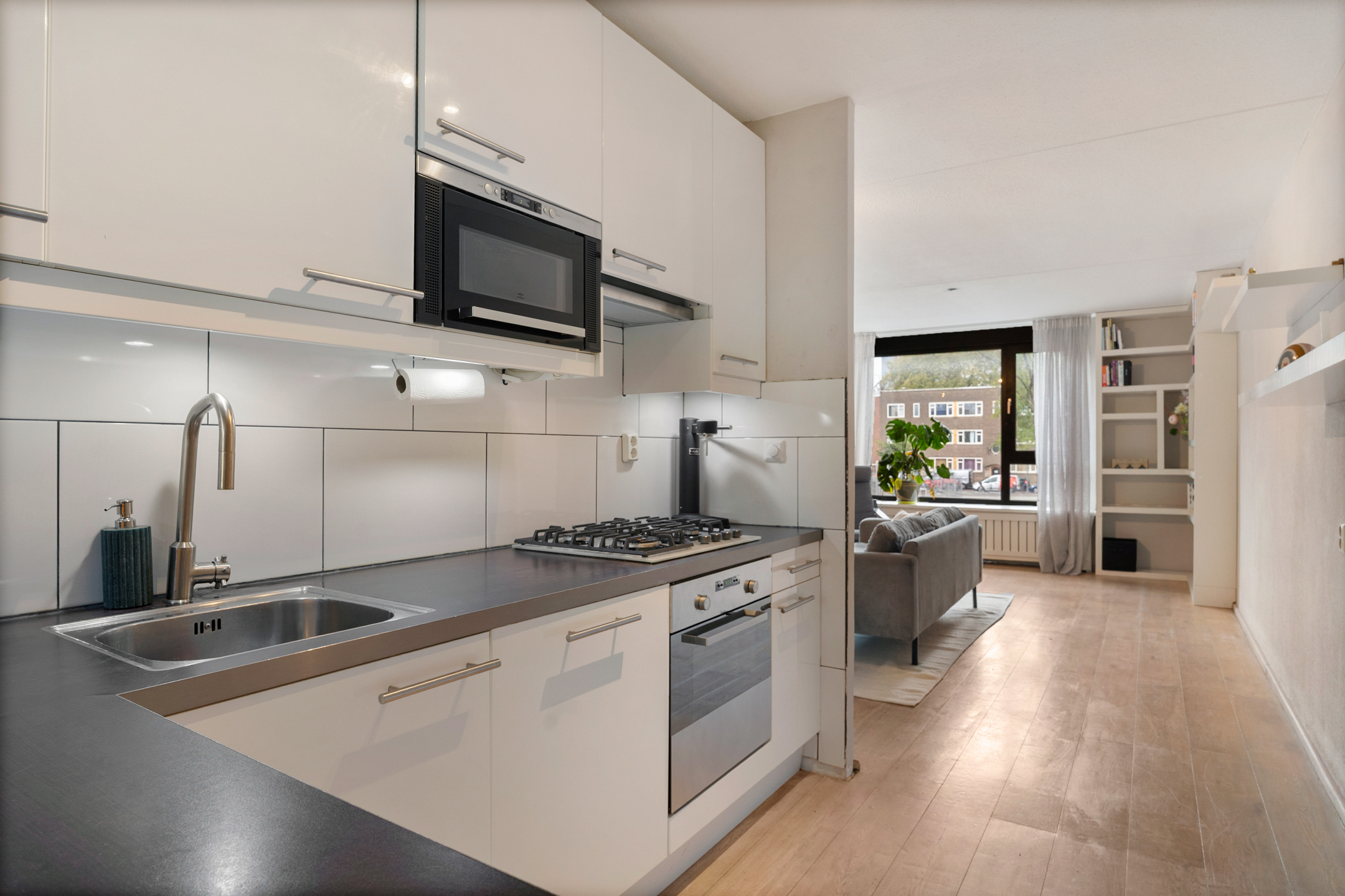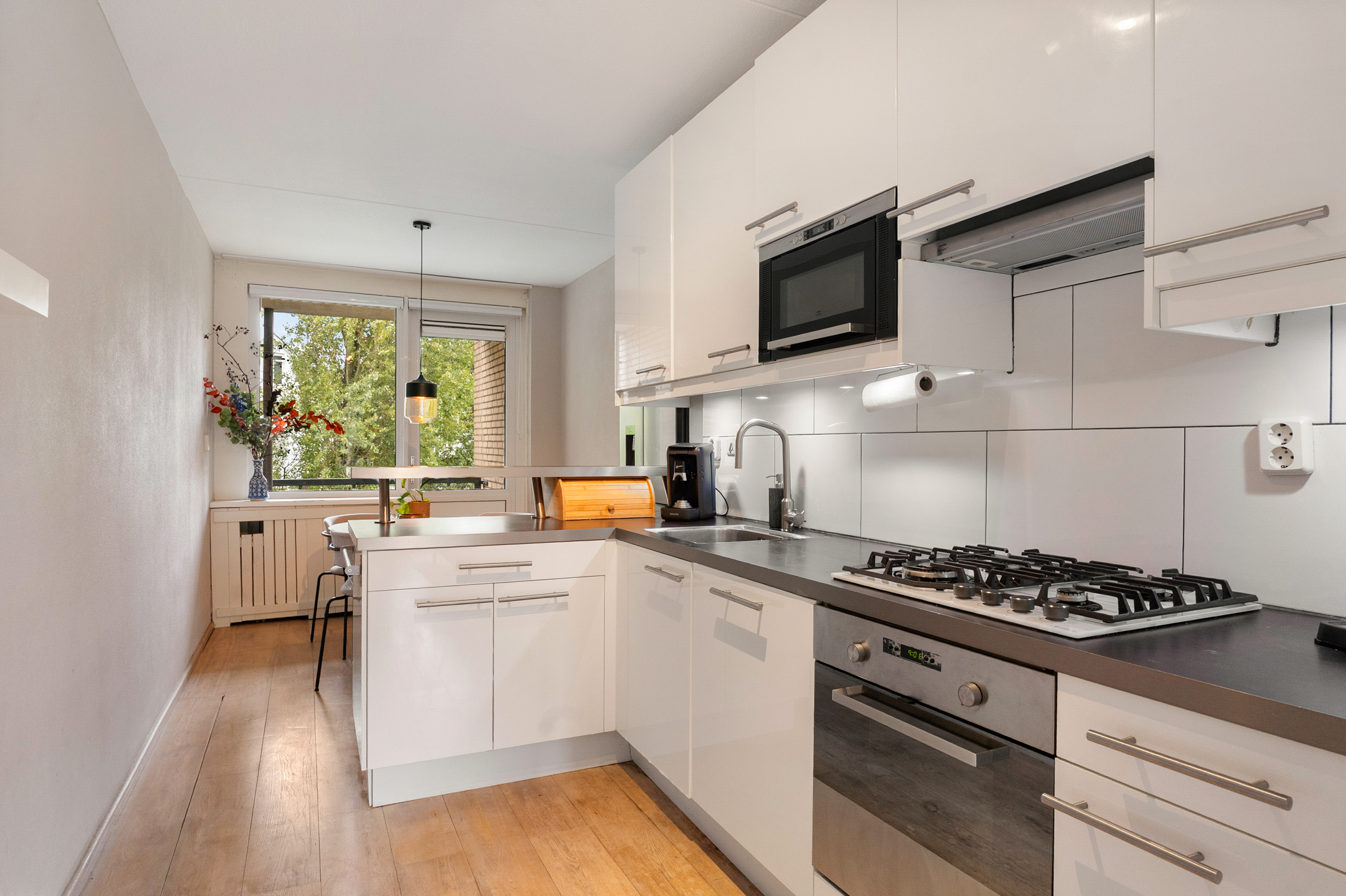 De woonkamer is heerlijk licht dankzij de grote ramen en het balkon op het zuidwesten. De ruimte is sfeervol afgewerkt en biedt genoeg plek voor een comfortabele zithoek en een werk- of leeshoek. Aan de achterzijde bevindt zich de moderne keuken, uitgevoerd in hoogglans wit en voorzien van diverse inbouwapparatuur, waaronder een vaatwasser, oven, magnetron, gaskookplaat, afzuigkap, koelkast en vriezer. Vanuit de keuken loop je zo het tweede balkon op, gelegen op het noordoosten – perfect voor een kop koffie in de ochtendzon.
