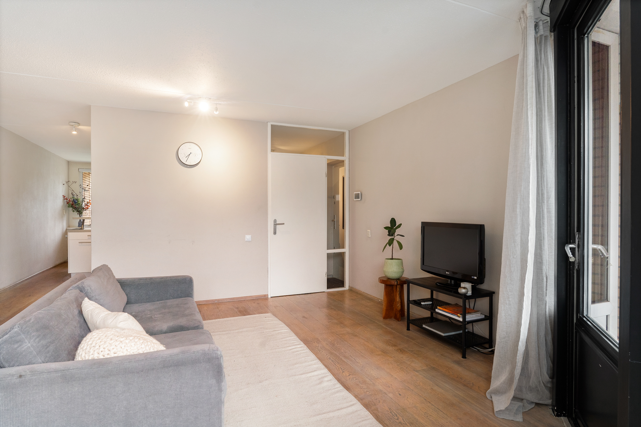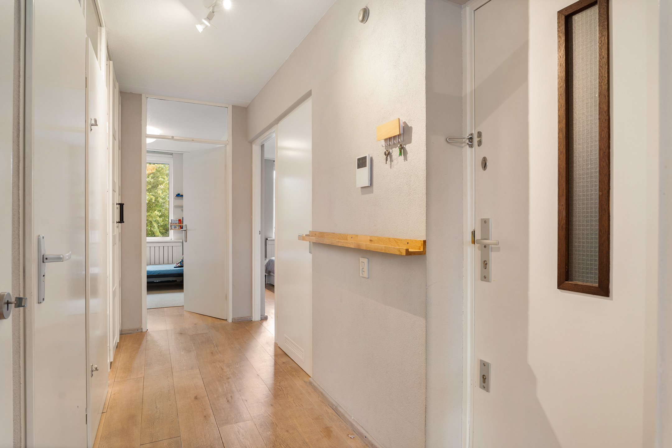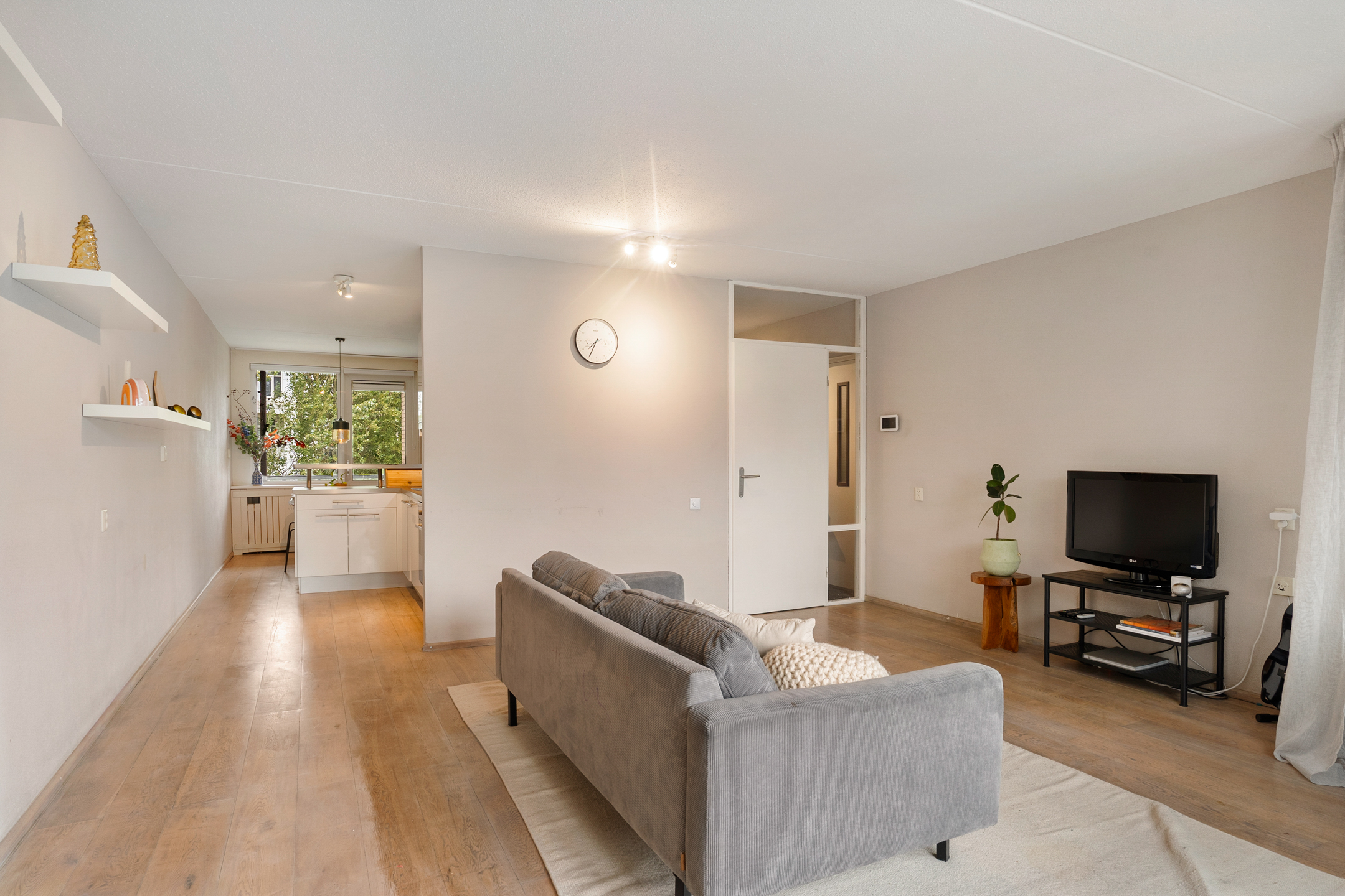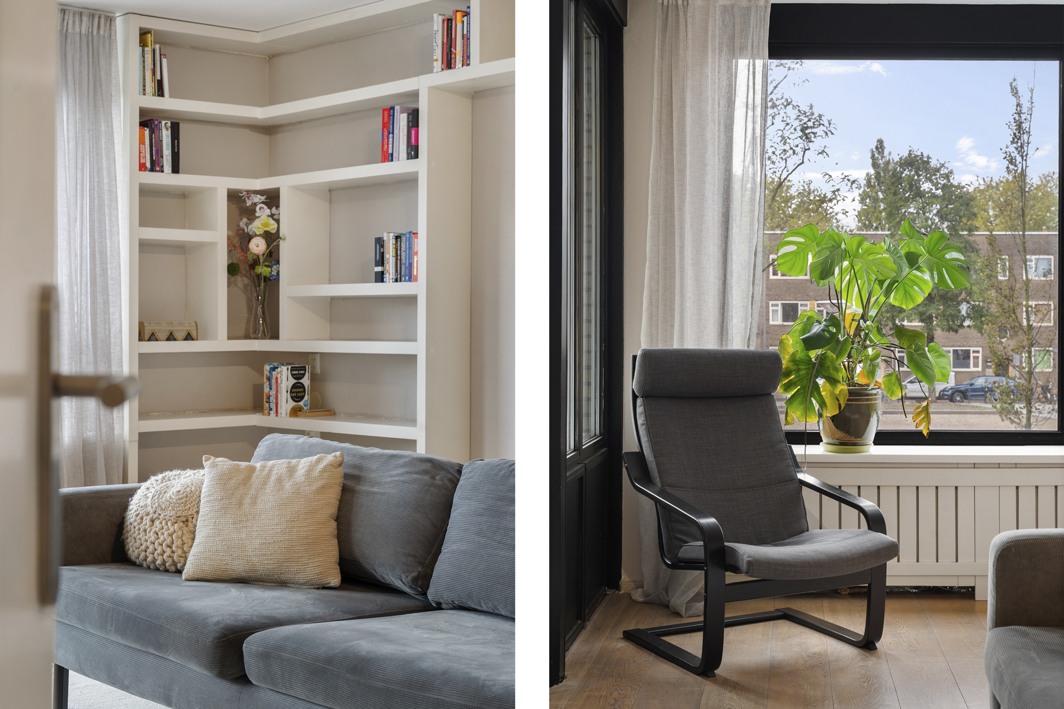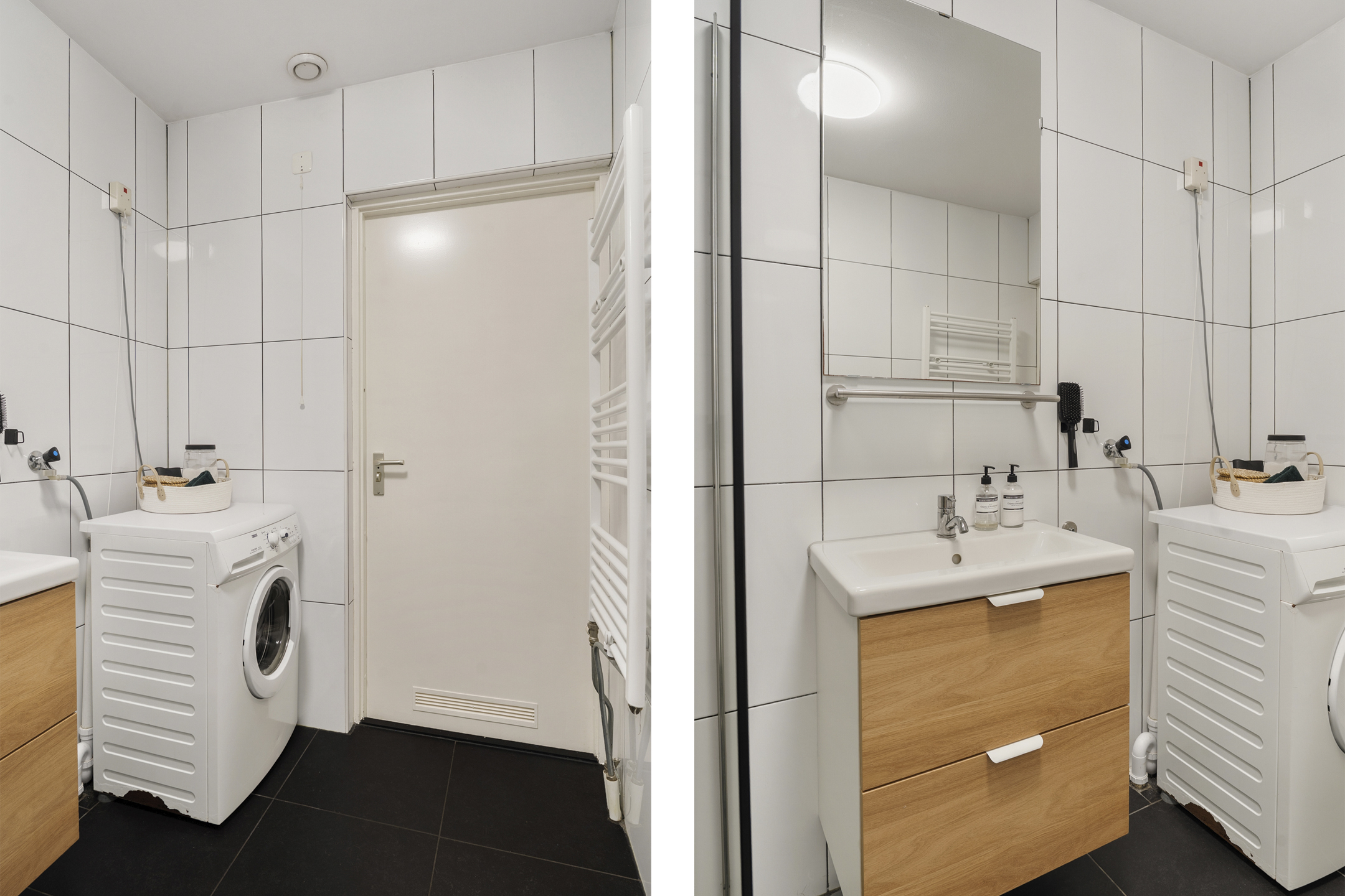 De woonkamer is heerlijk licht dankzij de grote ramen en het balkon op het zuidwesten. De ruimte is sfeervol afgewerkt en biedt genoeg plek voor een comfortabele zithoek en een werk- of leeshoek. Aan de achterzijde bevindt zich de moderne keuken, uitgevoerd in hoogglans wit en voorzien van diverse inbouwapparatuur, waaronder een vaatwasser, oven, magnetron, gaskookplaat, afzuigkap, koelkast en vriezer. Vanuit de keuken loop je zo het tweede balkon op, gelegen op het noordoosten – perfect voor een kop koffie in de ochtendzon.