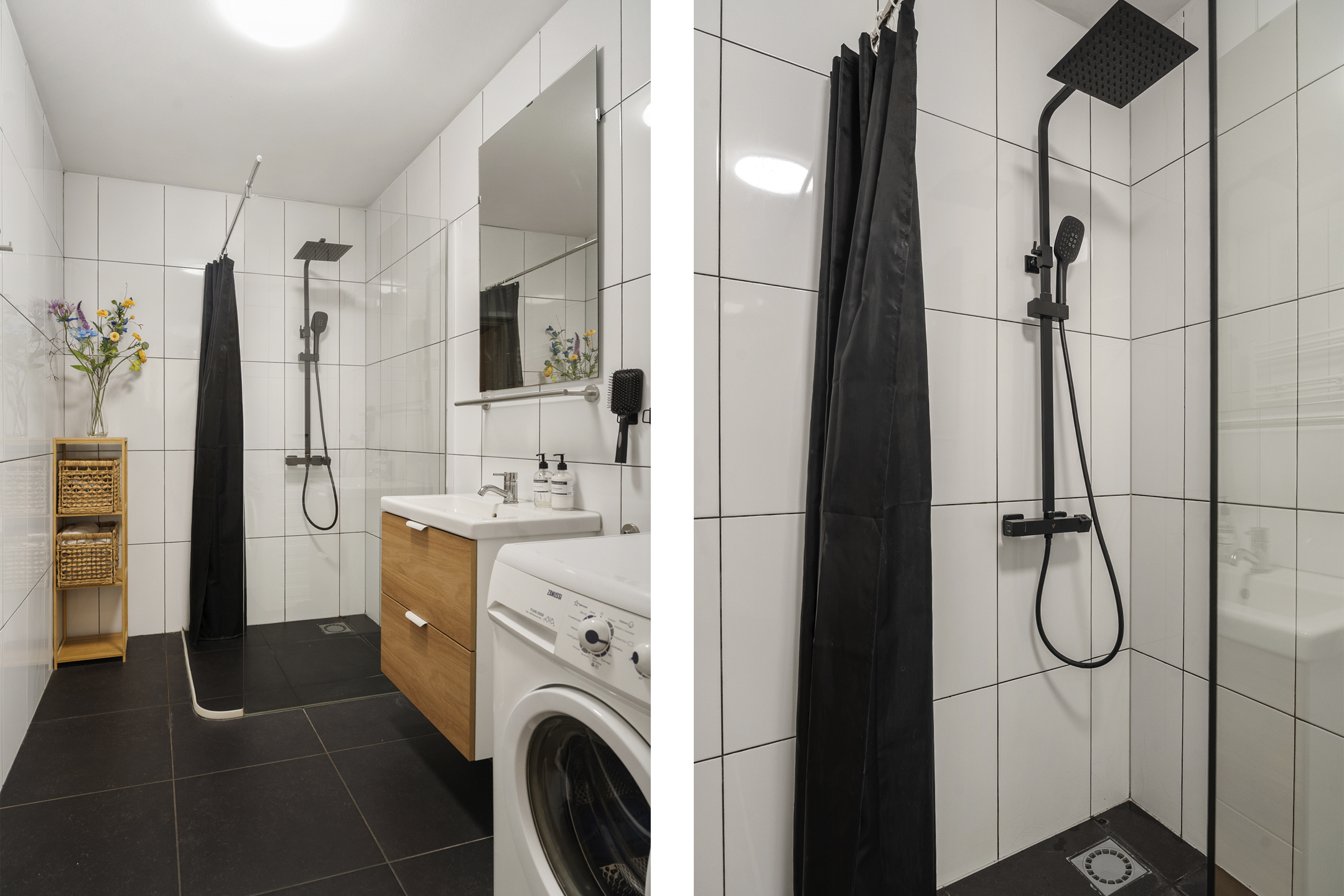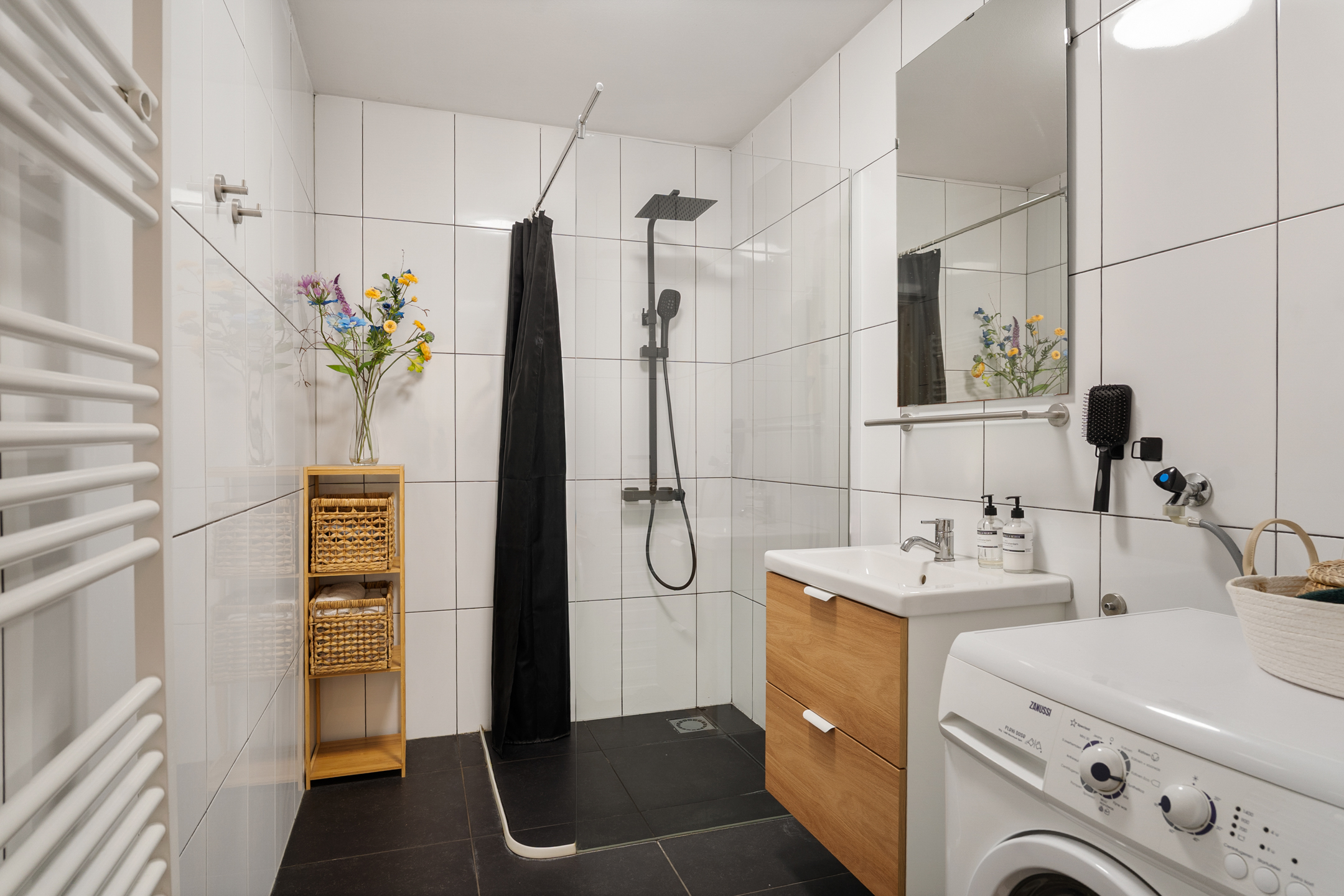 De badkamer is modern betegeld en voorzien van een ruime inloopdouche, wastafelmeubel met spiegel en een wasmachineaansluiting.