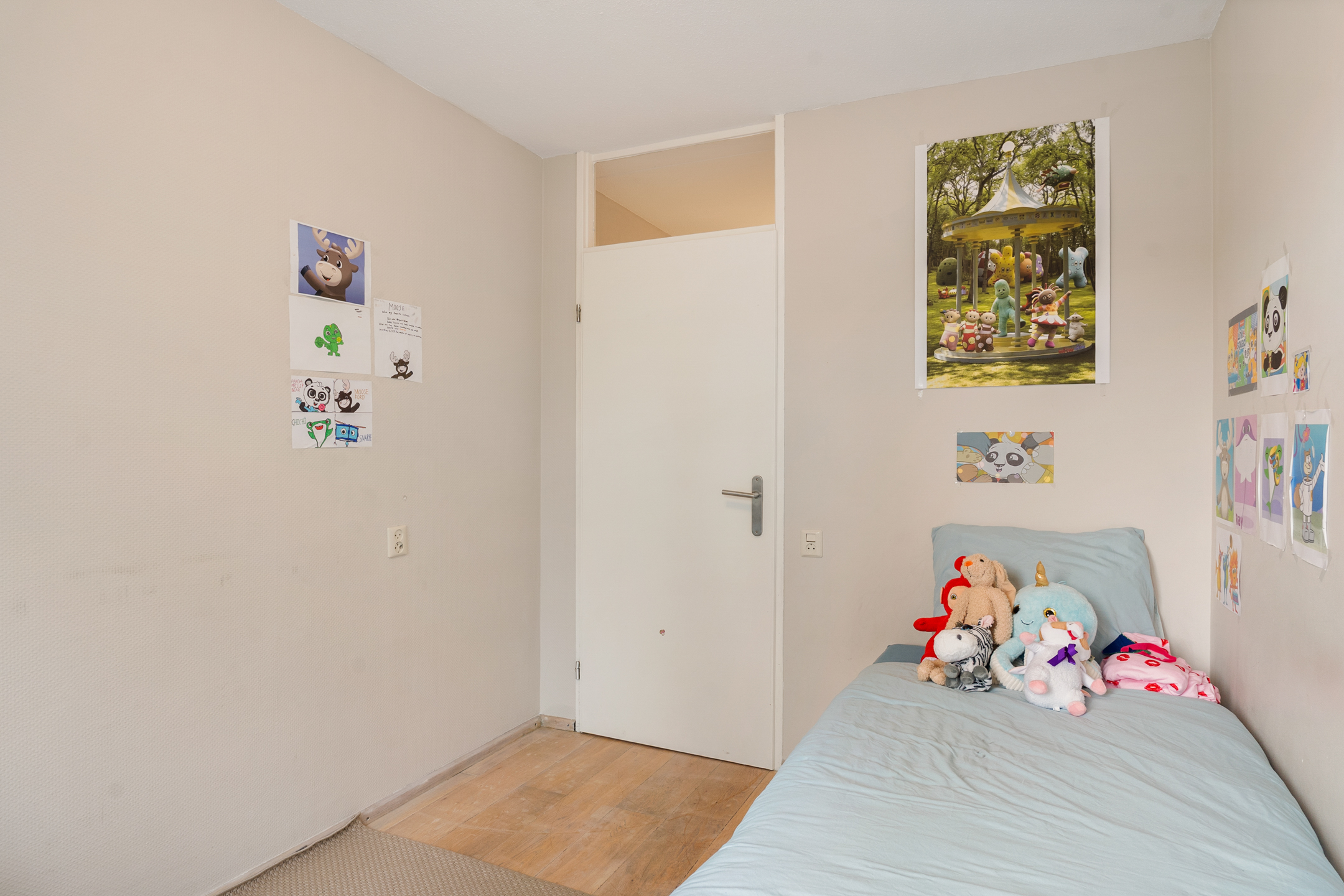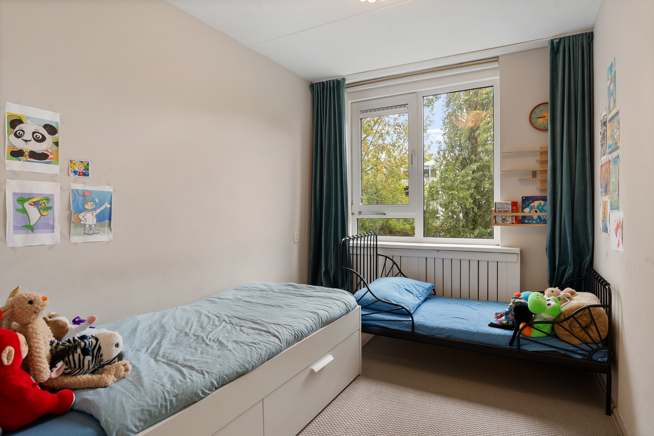 De aangrenzende eetkamer biedt ruimte voor een gezellige eettafel met uitzicht op het groen. De hoofdslaapkamer is ruim genoeg voor een tweepersoonsbed en kledingkast, terwijl de tweede kamer ideaal is als kinder-, logeer- of werkkamer. Tevens is het erg eenvoudig om een derde slaapkamer te creëren, waar nu de eetkamer is.