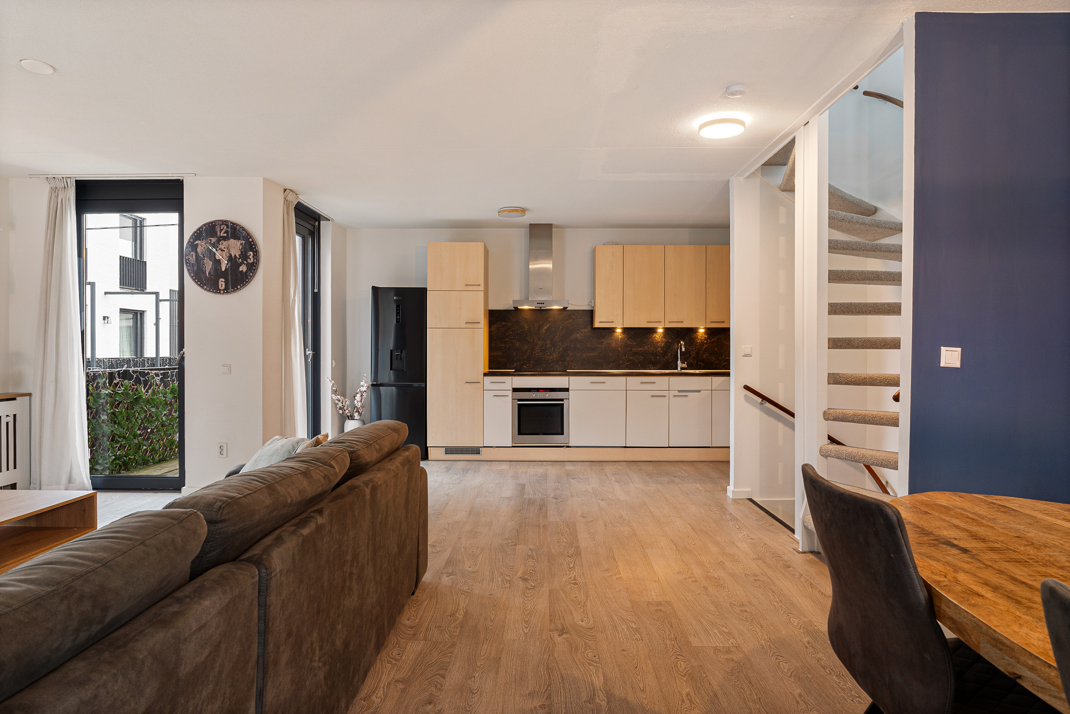 De eerste verdieping is ingericht als een royale woonverdieping. De lichte woonkamer van ca. 38 m² biedt volop ruimte voor een comfortabele zithoek én een grote eettafel. De open keuken (ca. 10 m²) heeft een praktische indeling en is voorzien van een recent geplaatste keramische kookplaat. Aan de achterzijde bevindt zich een ruim balkon, perfect voor een kop koffie in de ochtend of een moment in de zon.