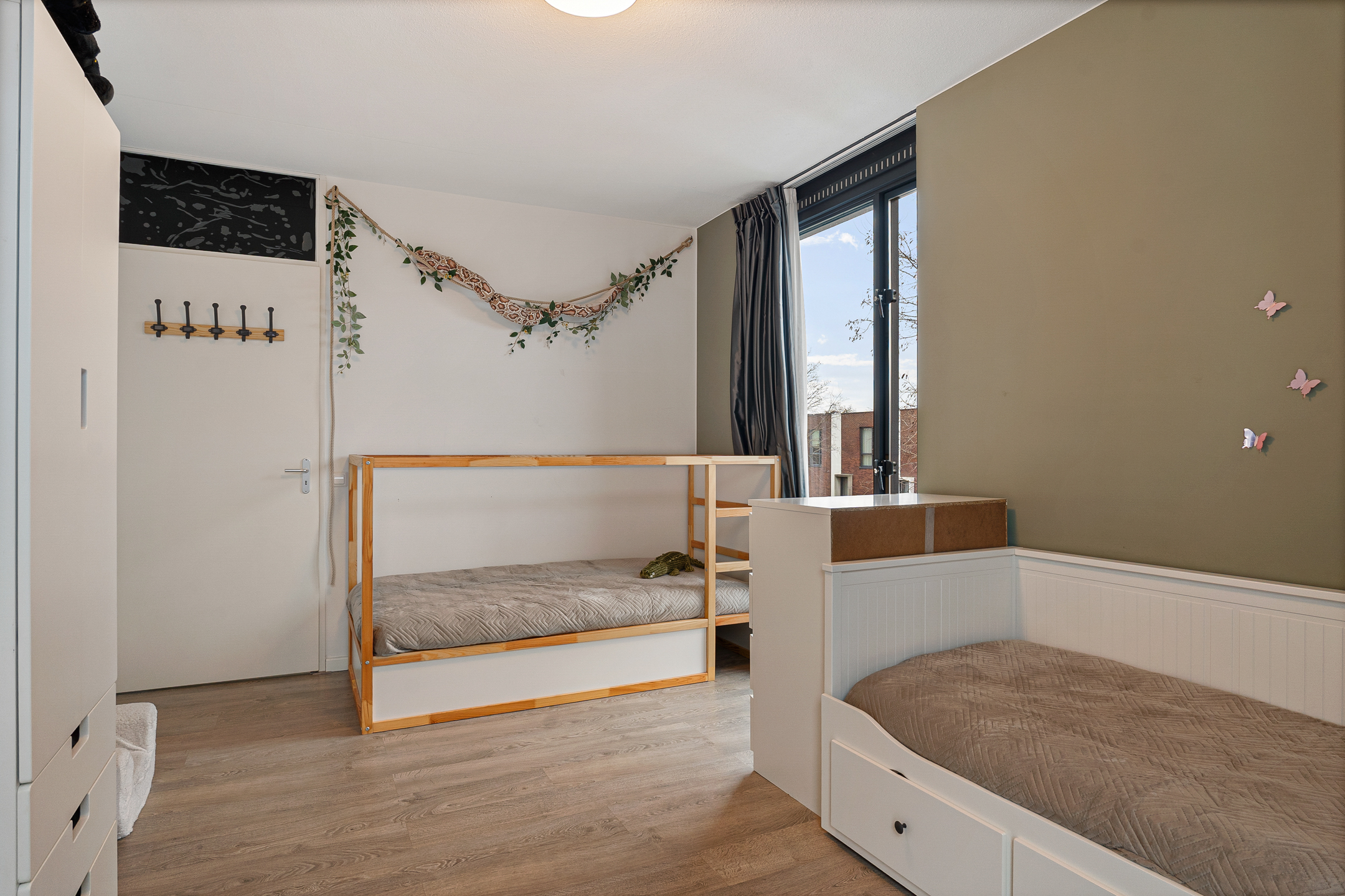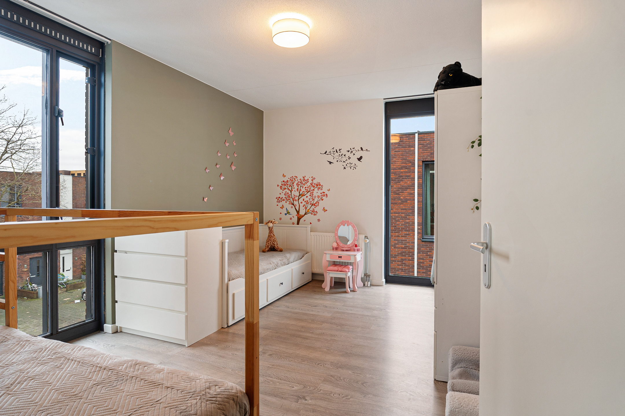 Op de tweede verdieping liggen nog twee slaapkamers, ideaal als master bedroom en logeer- of kinderkamer. Ook hier is een badkamer aanwezig, voorzien van alle comfort. Vanaf de overloop heeft u toegang tot het grote dakterras, een heerlijke en zonnige buitenruimte met volop privacy.