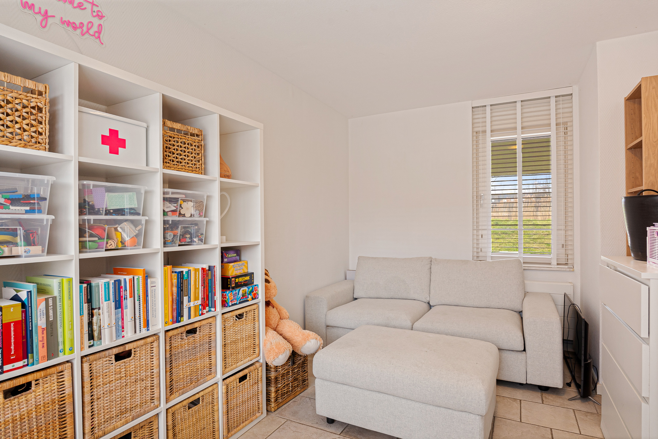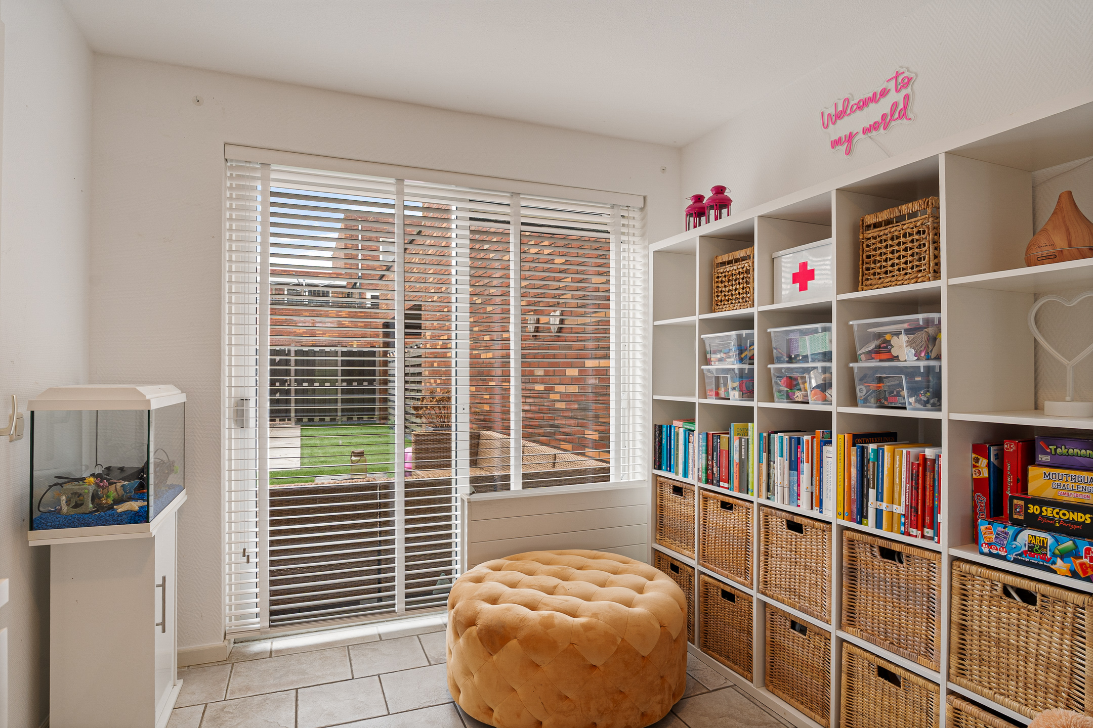 Aan de achterzijde ligt een ruime kamer met directe toegang tot de tuin. Deze ruimte is perfect als slaapkamer, hobbyruimte of thuiswerkplek en maakt de woning extra flexibel in gebruik.
