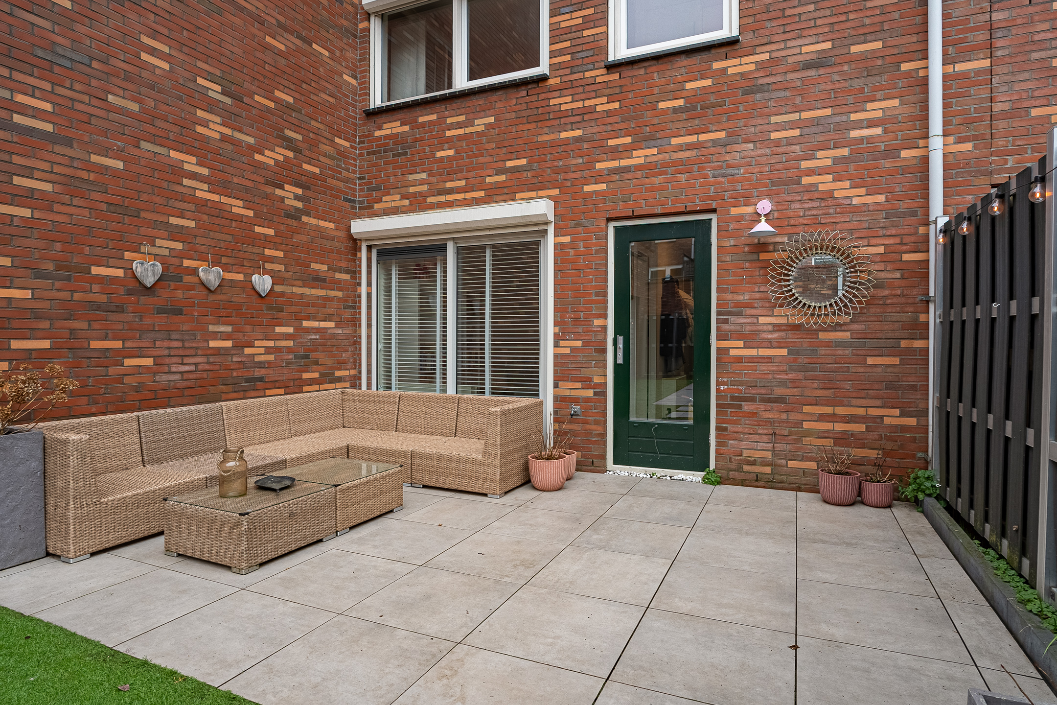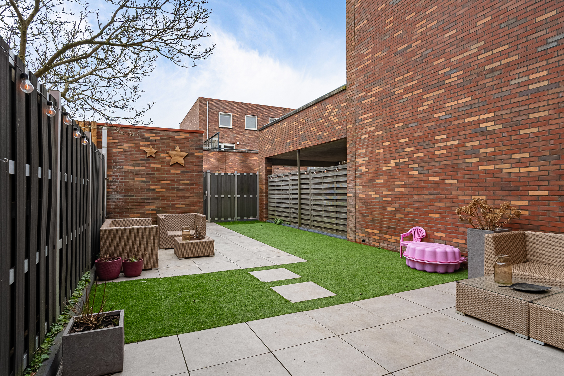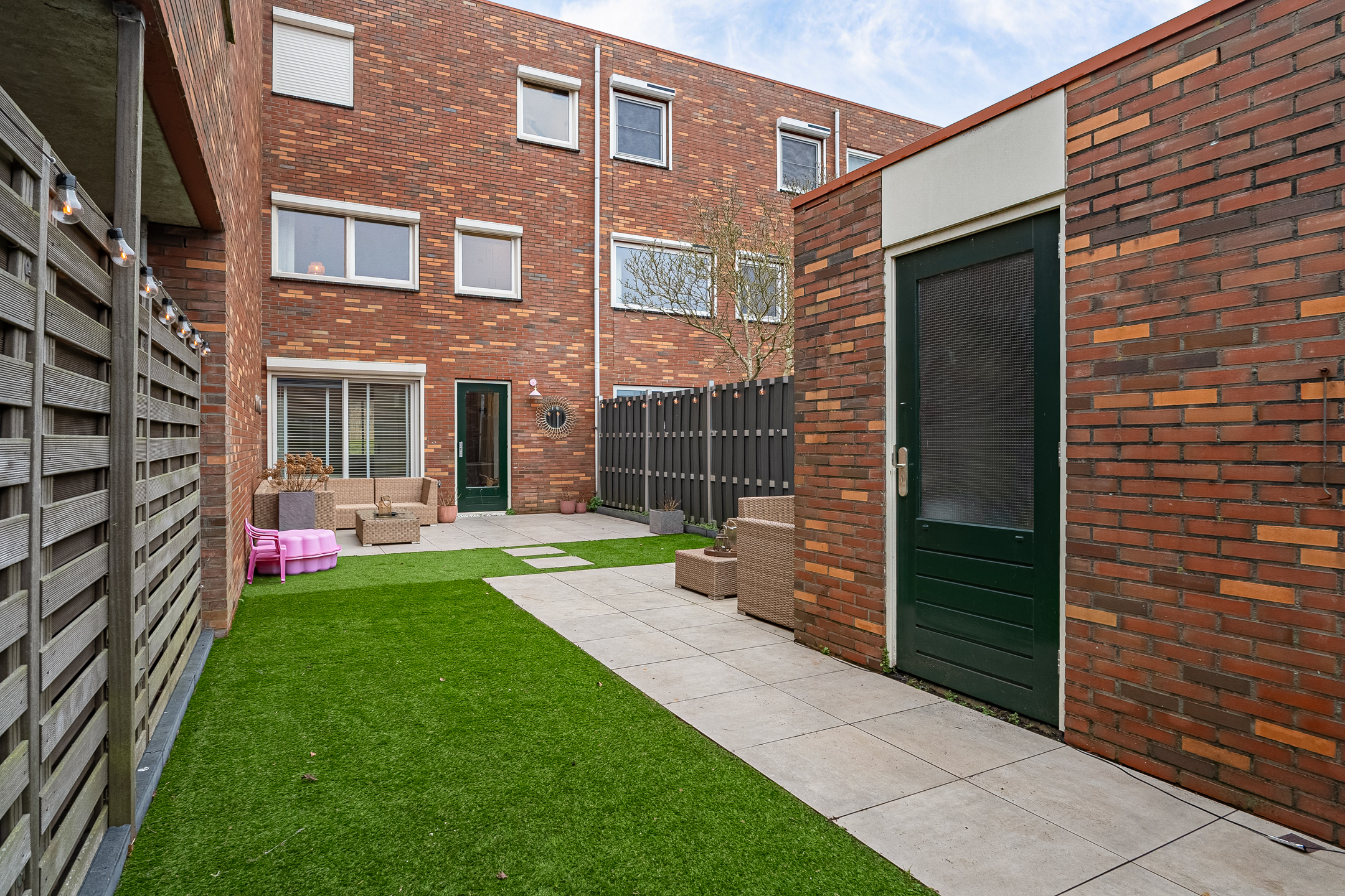 De achtertuin is verzorgd en onderhoudsvriendelijk aangelegd en biedt voldoende ruimte om te ontspannen of gezellig te zitten met familie en vrienden. Achterin bevindt zich een ruime, stenen berging.