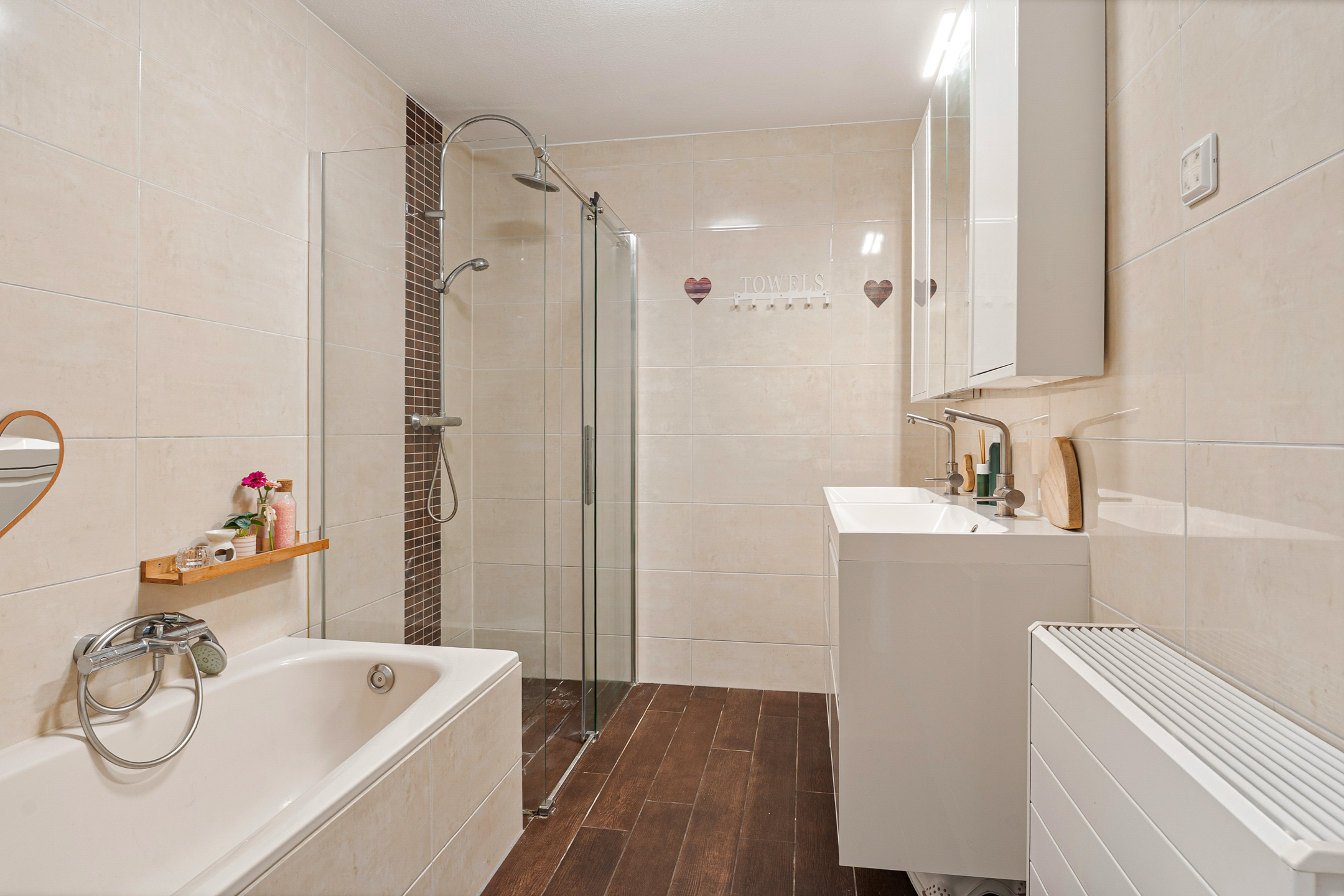 Aan de voorzijde bevindt zich een ruime slaapkamer en grote ramen. Op deze verdieping bevinden zich ook de rolluiken. Aan de achterzijde ligt de tweede slaapkamer, eveneens goed bemeten en prettig licht. De badkamer is ruim opgezet en volledig betegeld in een neutrale, tijdloze kleurstelling. Je beschikt hier over een comfortabel ligbad, een separate inloopdouche met glazen douchewand en een modern wastafelmeubel met bergruimte. Dankzij de praktische indeling heb je hier voldoende bewegingsruimte en kun je kiezen tussen snel douchen of ontspannen in bad.