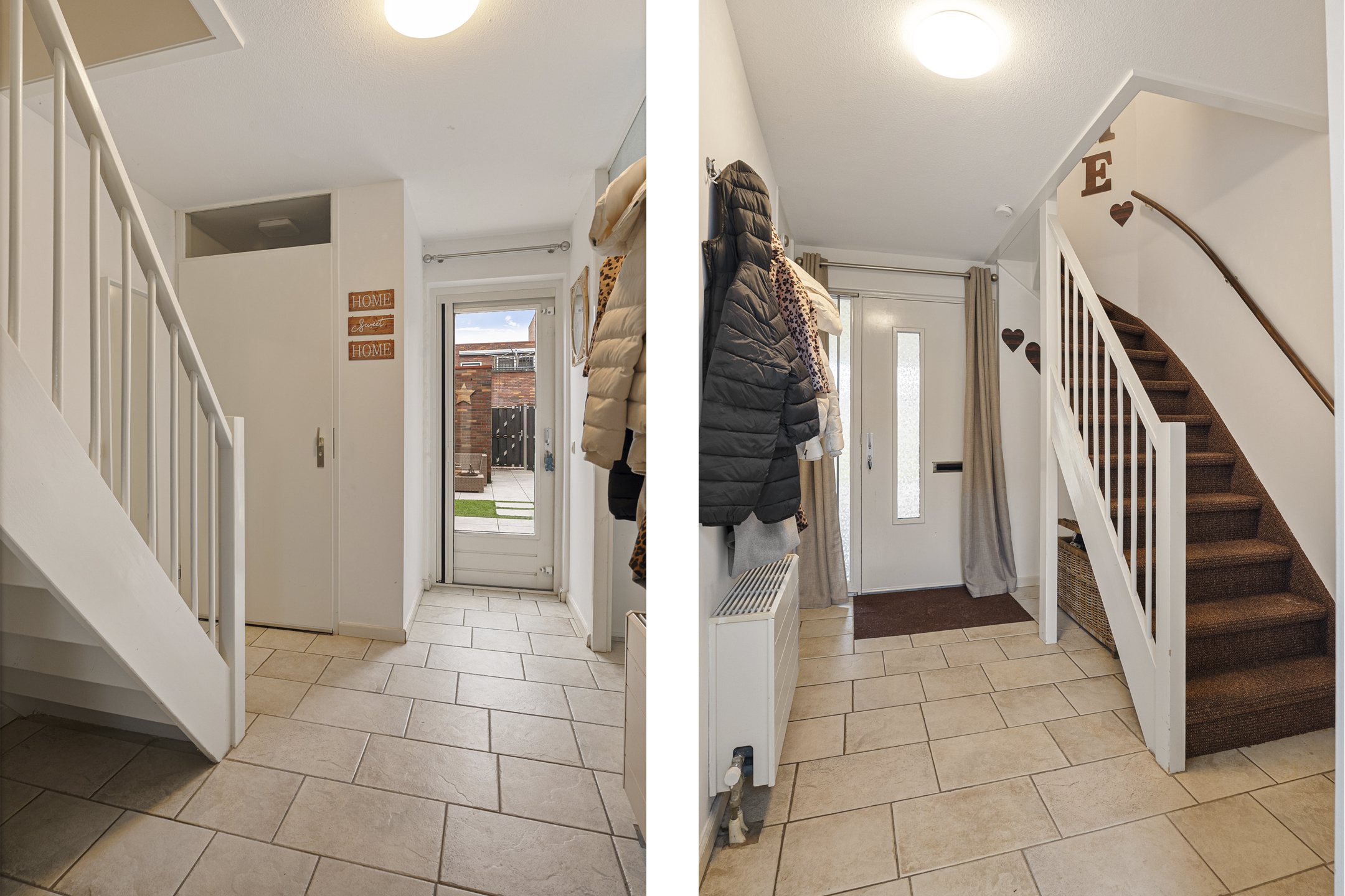 Je parkeert je auto op eigen terrein onder de carport. Via de ruime entreehal met trapopgang, trapkast en meterkast kom je binnen. Hier bevindt zich ook het toilet met fonteintje.