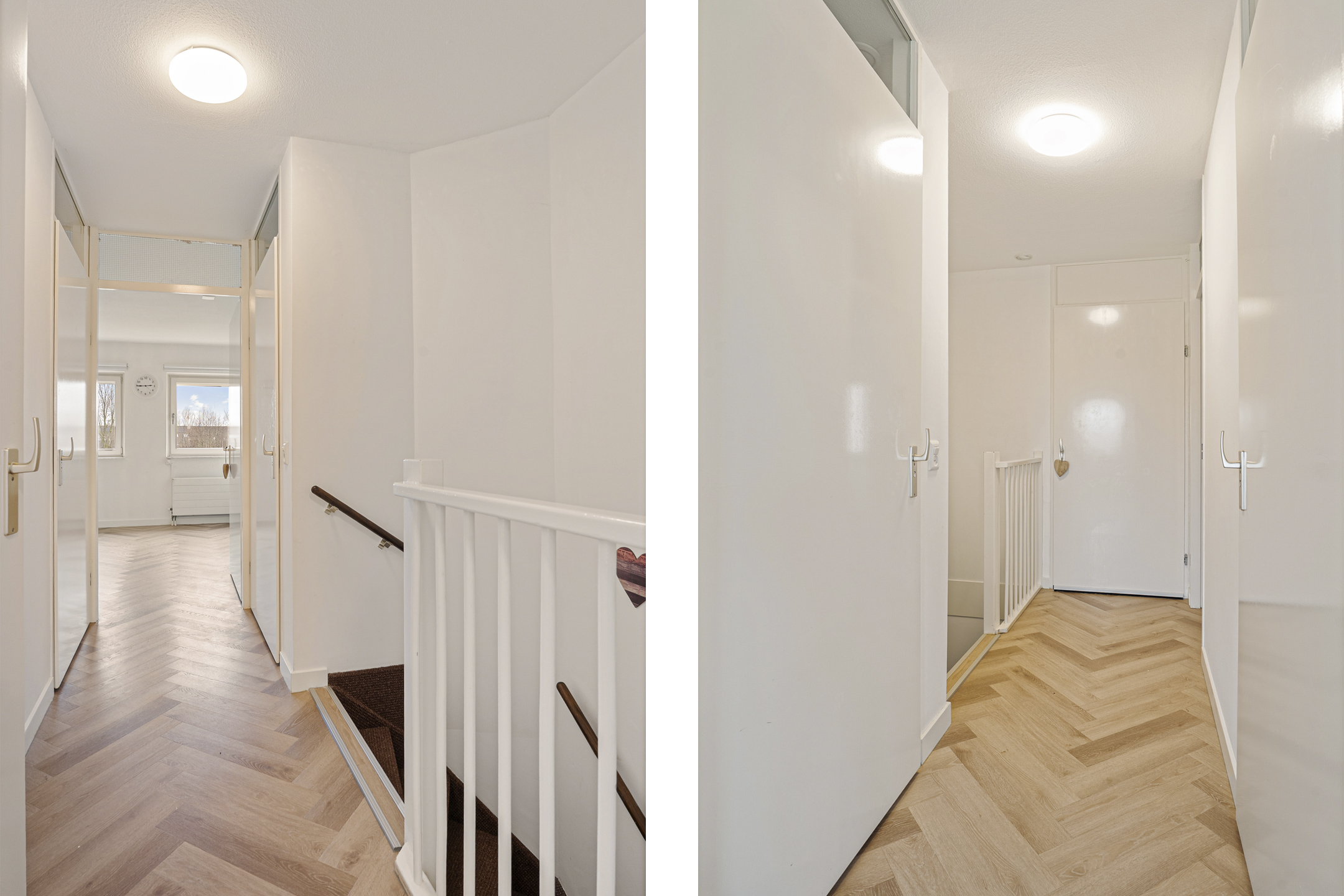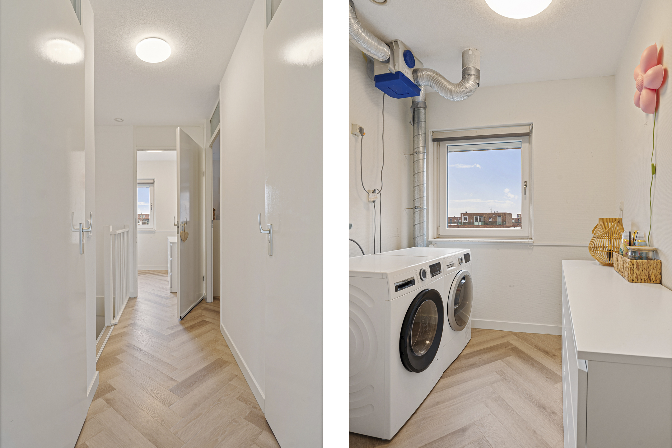 Daarnaast is er een separaat toilet op de overloop aanwezig, wel zo prettig met meerdere personen in huis. In de aparte wasruimte vind je de mechanische ventilatie-unit en de aansluitingen voor wasmachine en droger, netjes uit het zicht en praktisch gescheiden van de overige ruimtes.