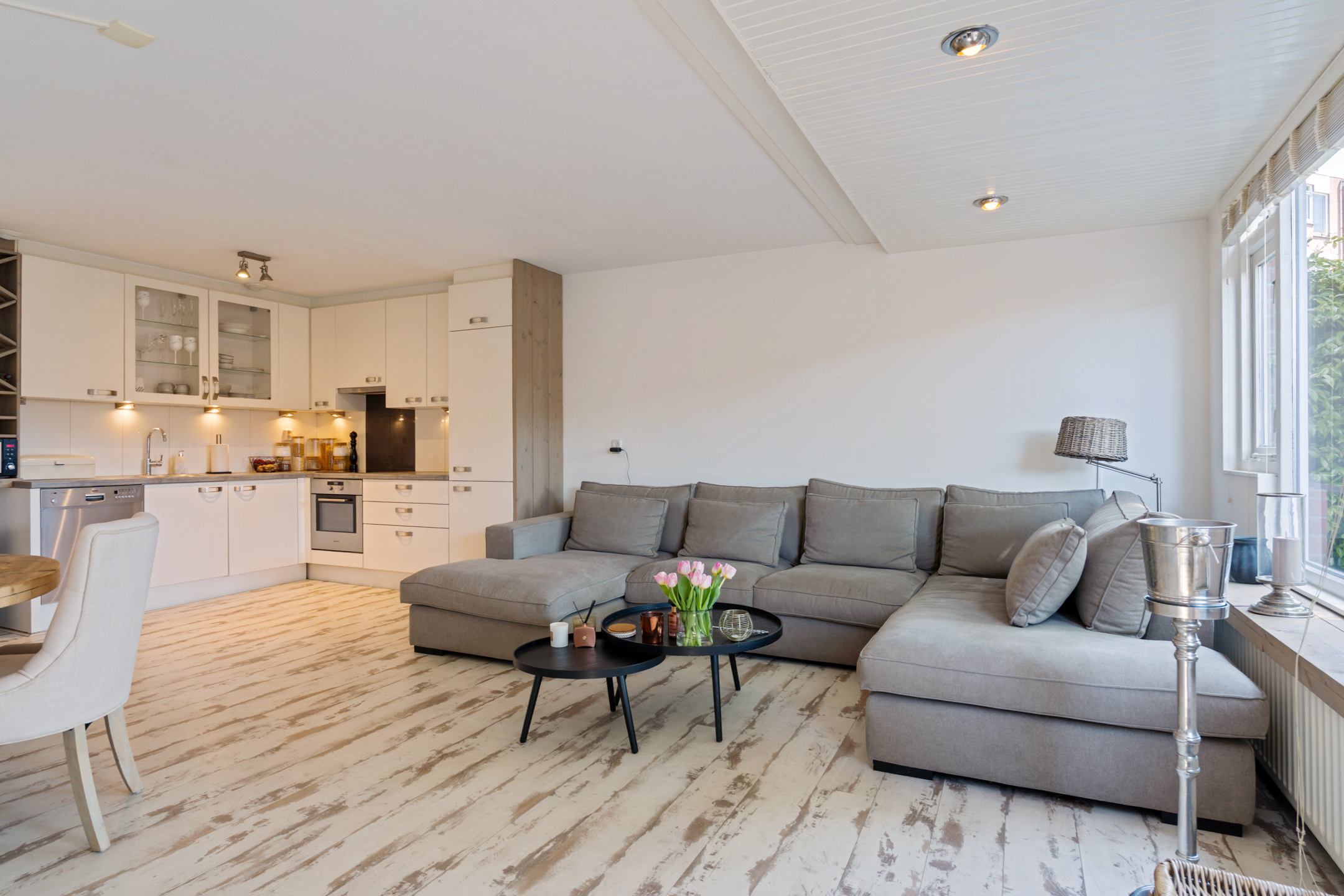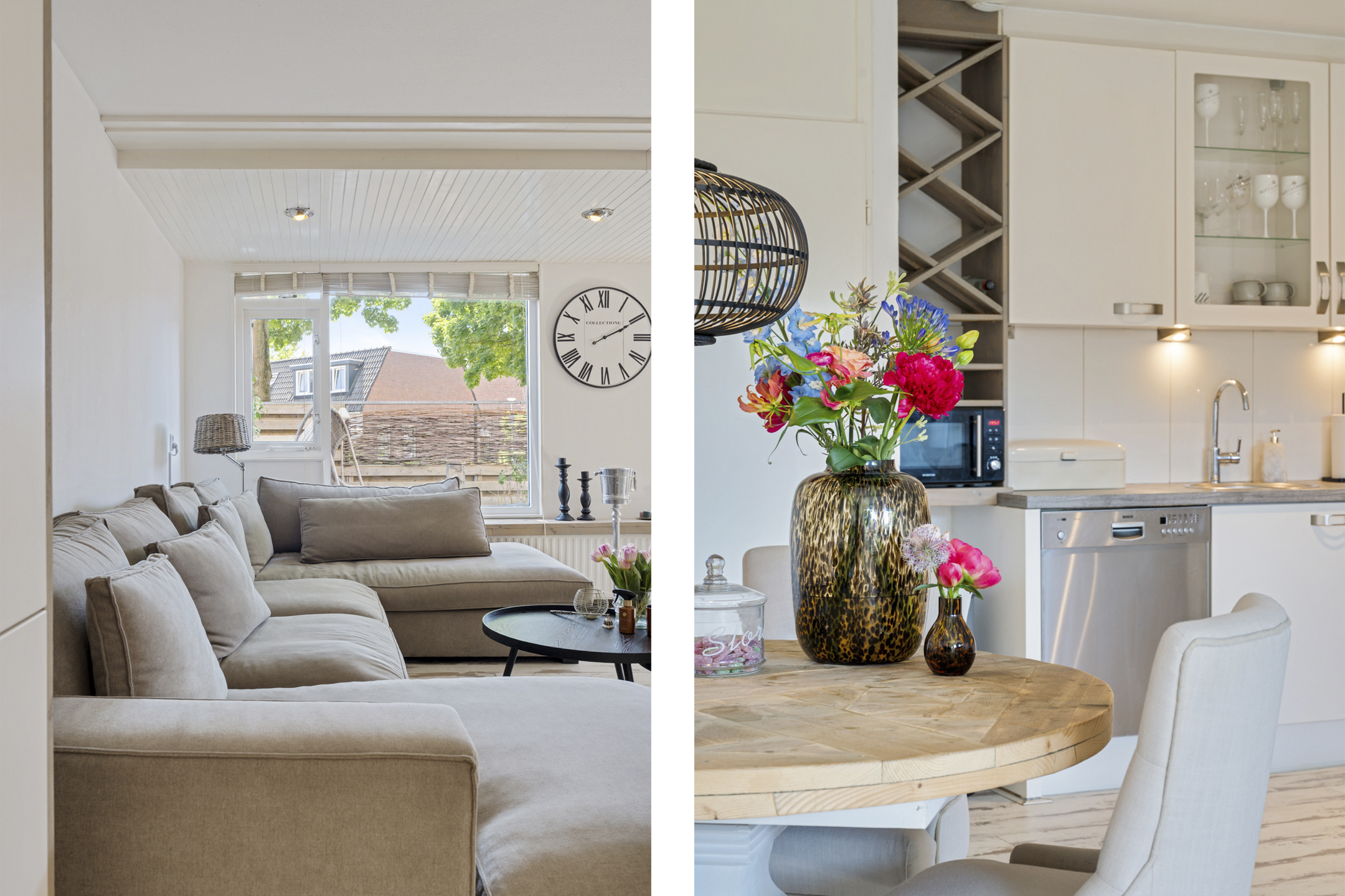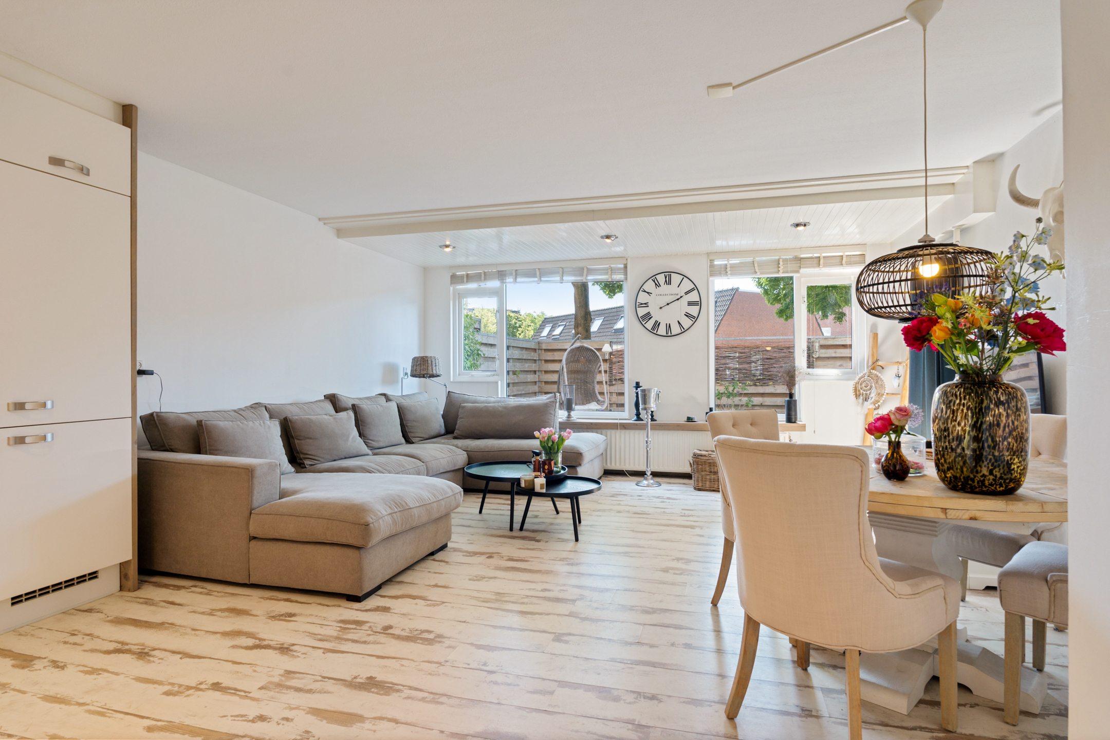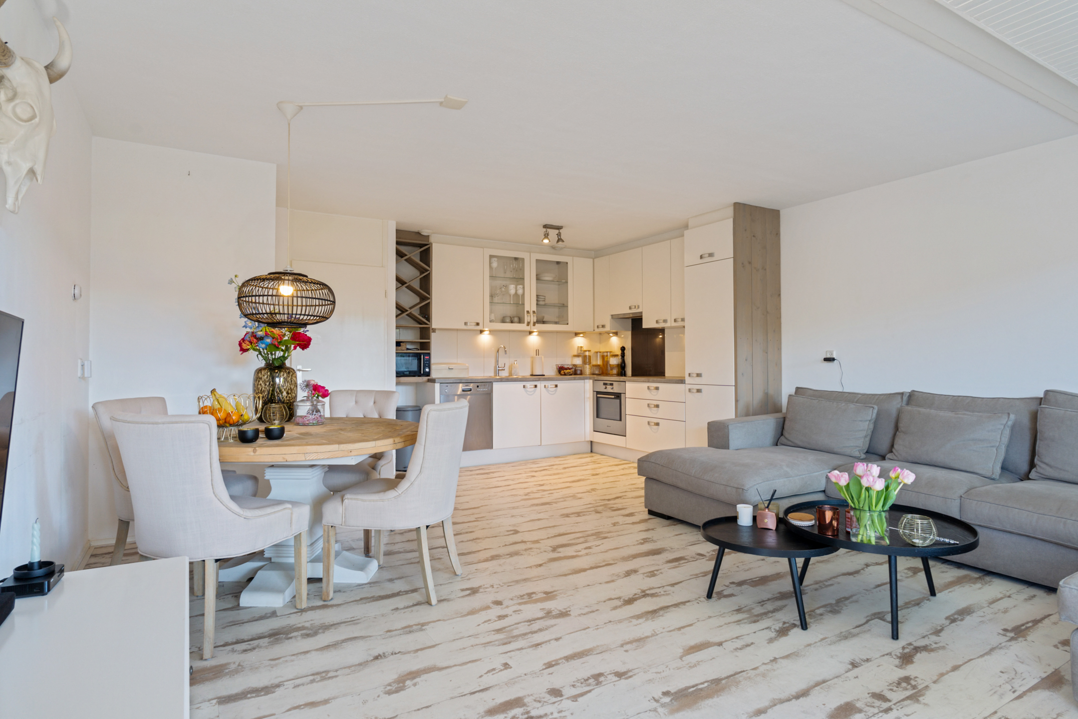 De royale woonkamer straalt licht en ruimte uit door de grote raampartijen. De landelijke laminaatvloer loopt mooi door naar de moderne open keuken, wat zorgt voor een harmonieus geheel. De keuken is compleet uitgerust met inbouwapparatuur, zoals een inductiekookplaat, oven, koelkast, vriezer en vaatwasser. Sfeervolle inbouwspots, een handig wijnrek en veel kastruimte maken het geheel af.