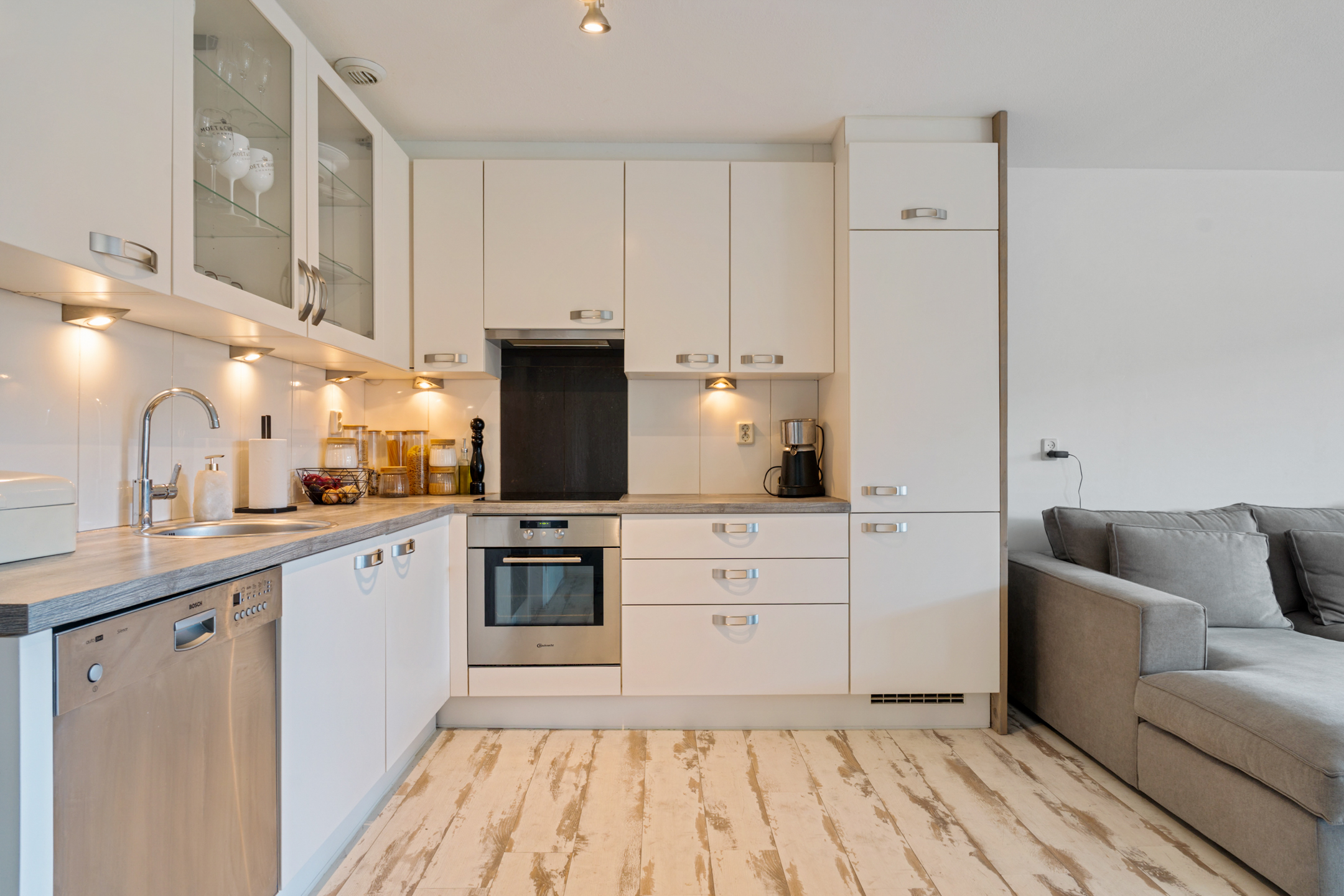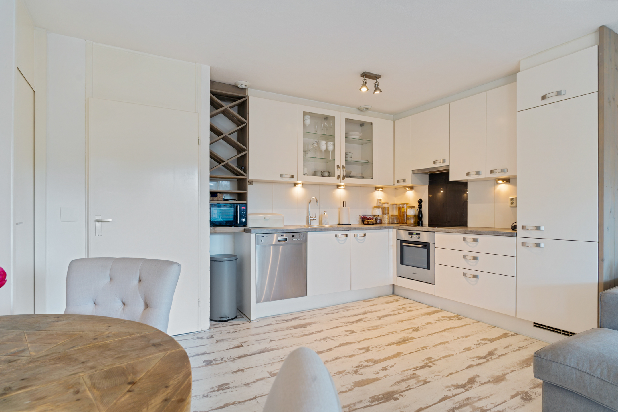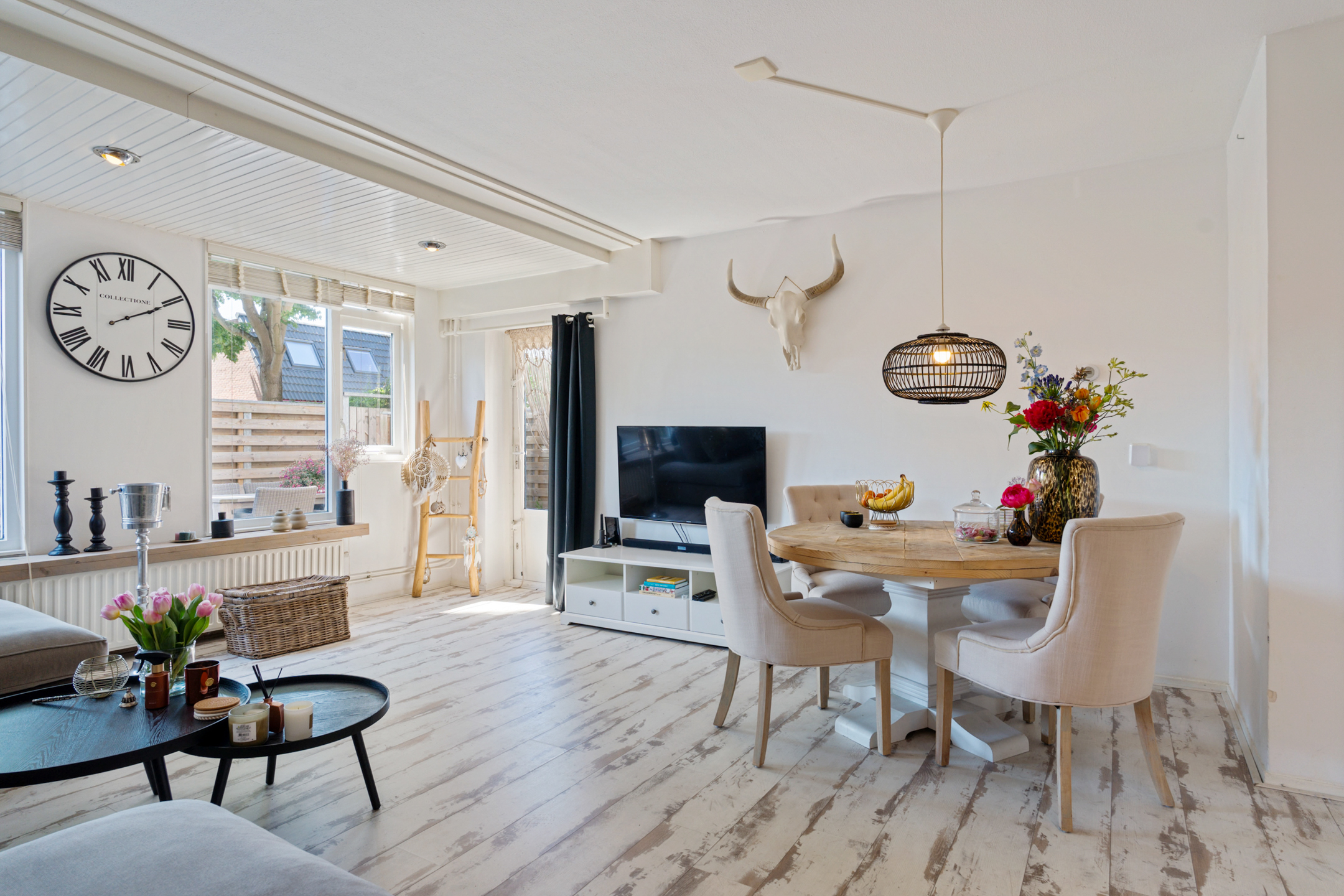 De royale woonkamer straalt licht en ruimte uit door de grote raampartijen. De landelijke laminaatvloer loopt mooi door naar de moderne open keuken, wat zorgt voor een harmonieus geheel. De keuken is compleet uitgerust met inbouwapparatuur, zoals een inductiekookplaat, oven, koelkast, vriezer en vaatwasser. Sfeervolle inbouwspots, een handig wijnrek en veel kastruimte maken het geheel af.