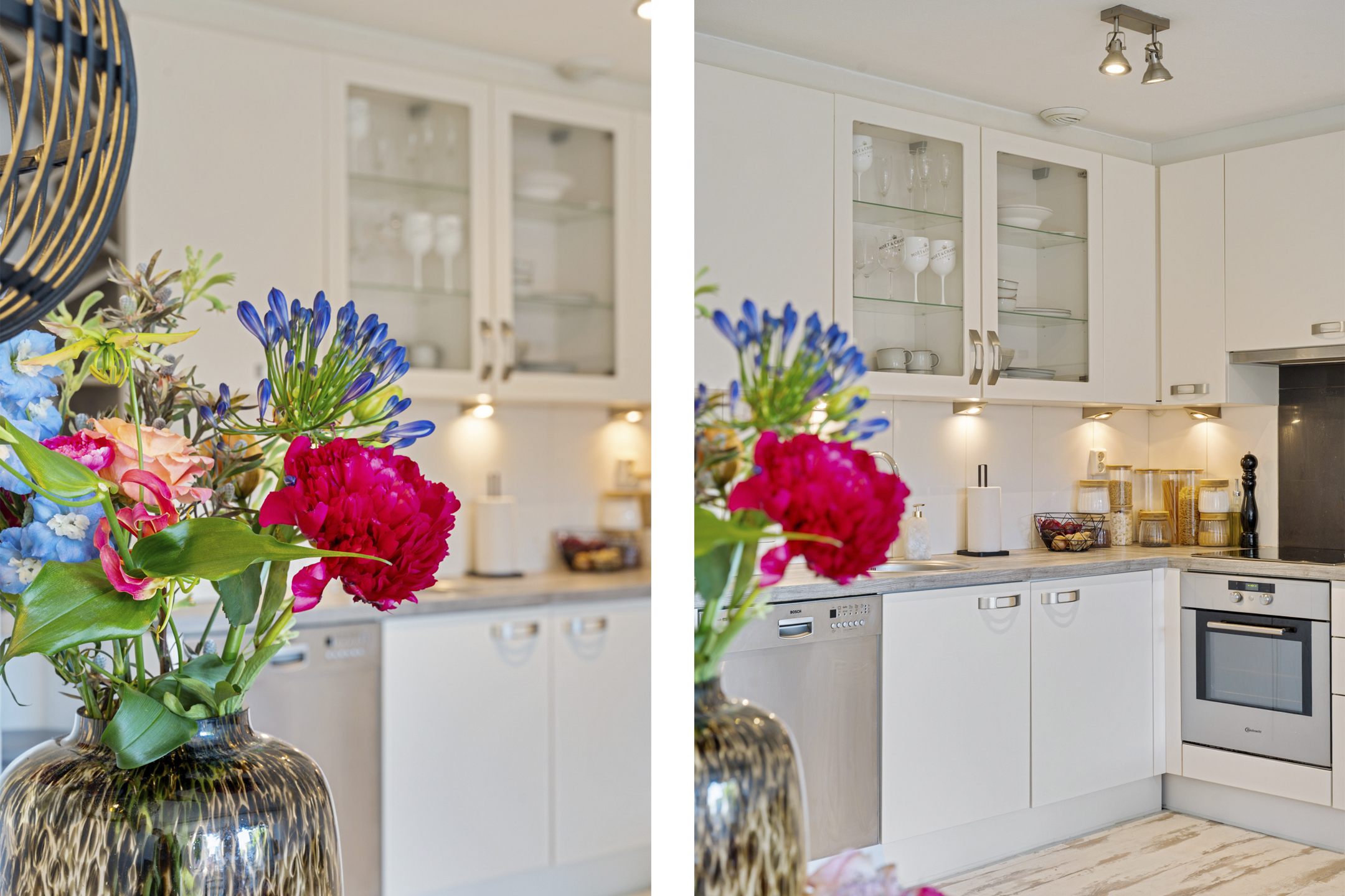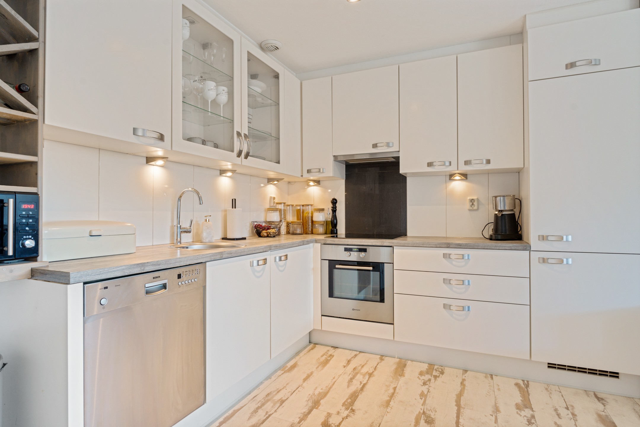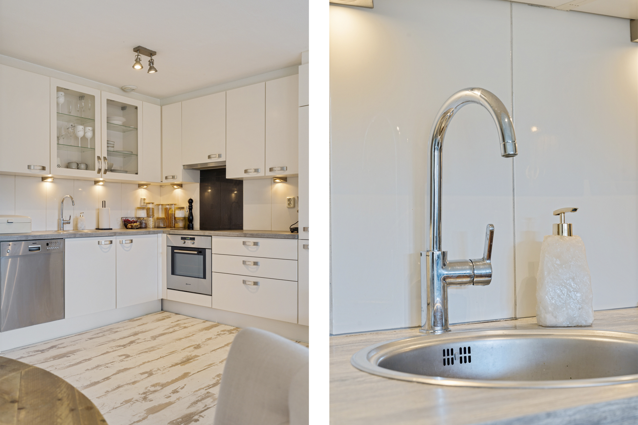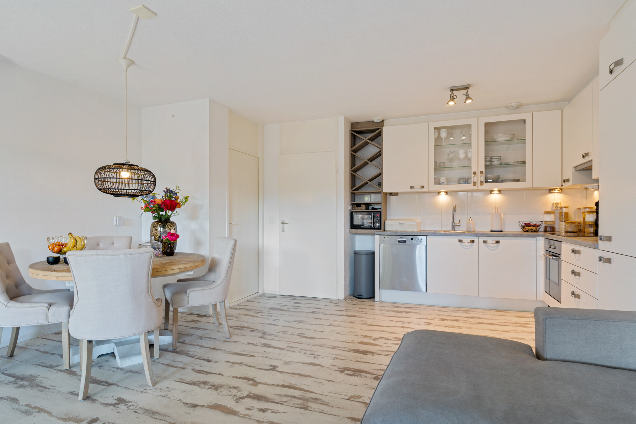 De royale woonkamer straalt licht en ruimte uit door de grote raampartijen. De landelijke laminaatvloer loopt mooi door naar de moderne open keuken, wat zorgt voor een harmonieus geheel. De keuken is compleet uitgerust met inbouwapparatuur, zoals een inductiekookplaat, oven, koelkast, vriezer en vaatwasser. Sfeervolle inbouwspots, een handig wijnrek en veel kastruimte maken het geheel af.