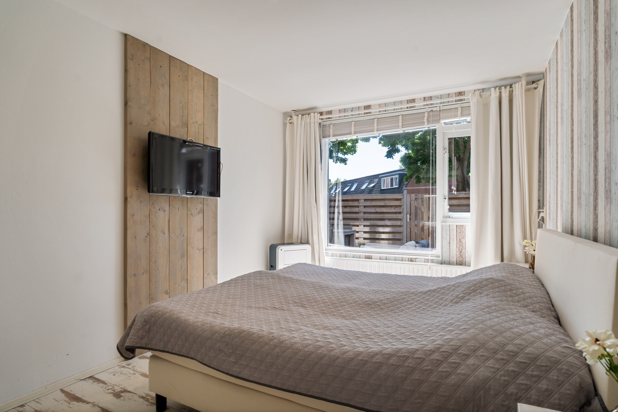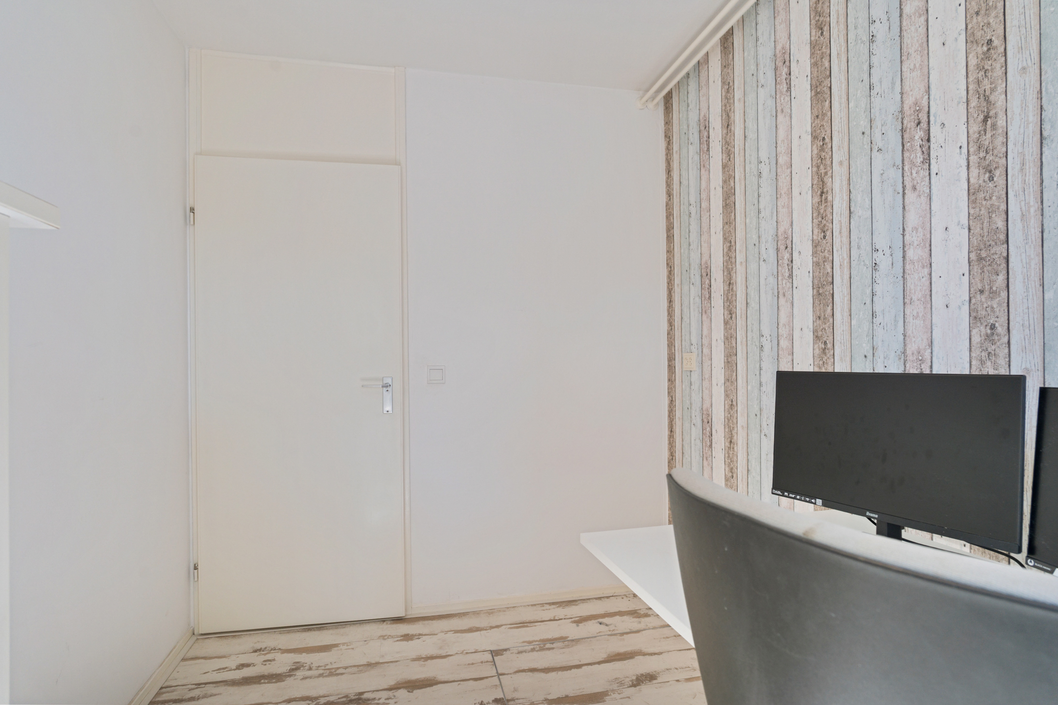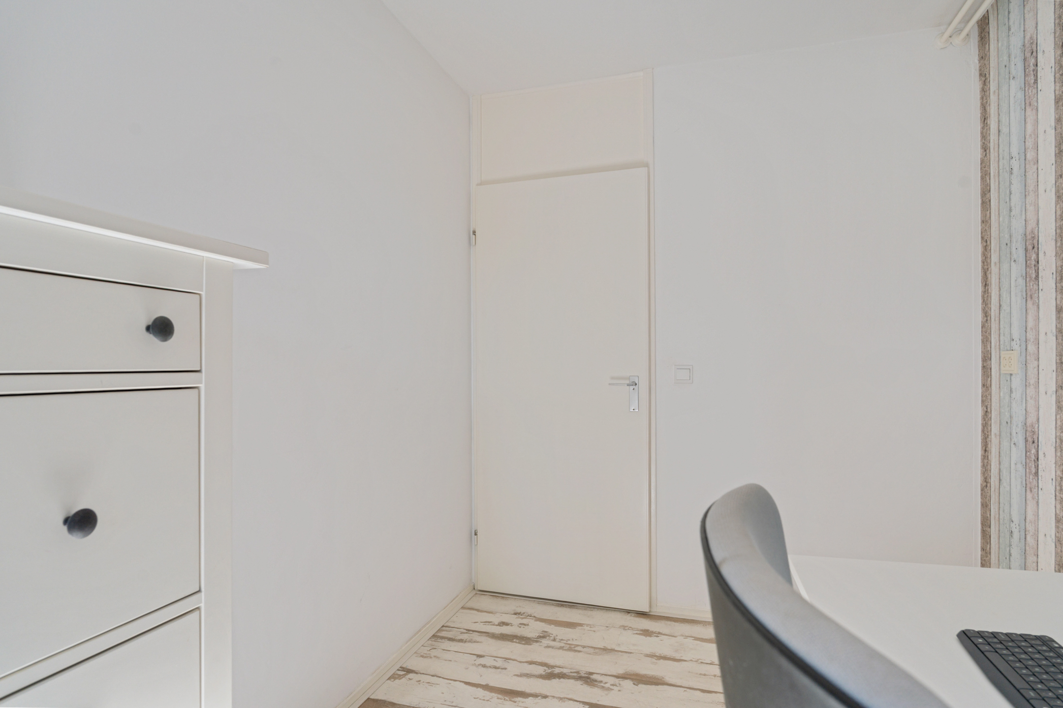 Via de hal bereik je de overige vertrekken. Aan de rechterzijde bevindt zich een moderne toiletruimte, strak afgewerkt en vernieuwd tijdens de renovatie. Links vind je de eerste ruime slaapkamer, momenteel ingericht als praktische werkruimte. De tweede slaapkamer is ruim en licht, met een prettig uitzicht op de tuin – een fijne plek om elke dag wakker te worden.