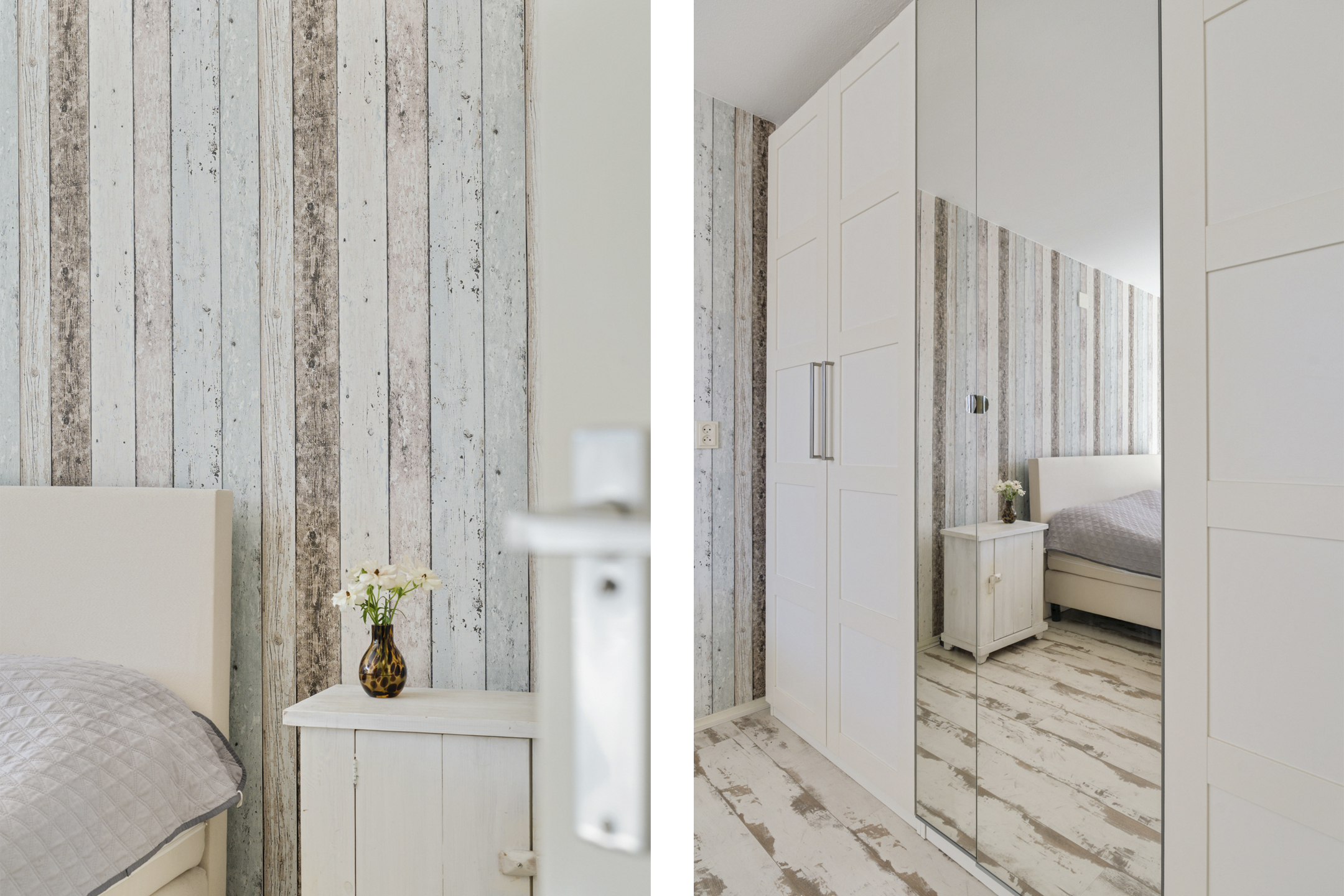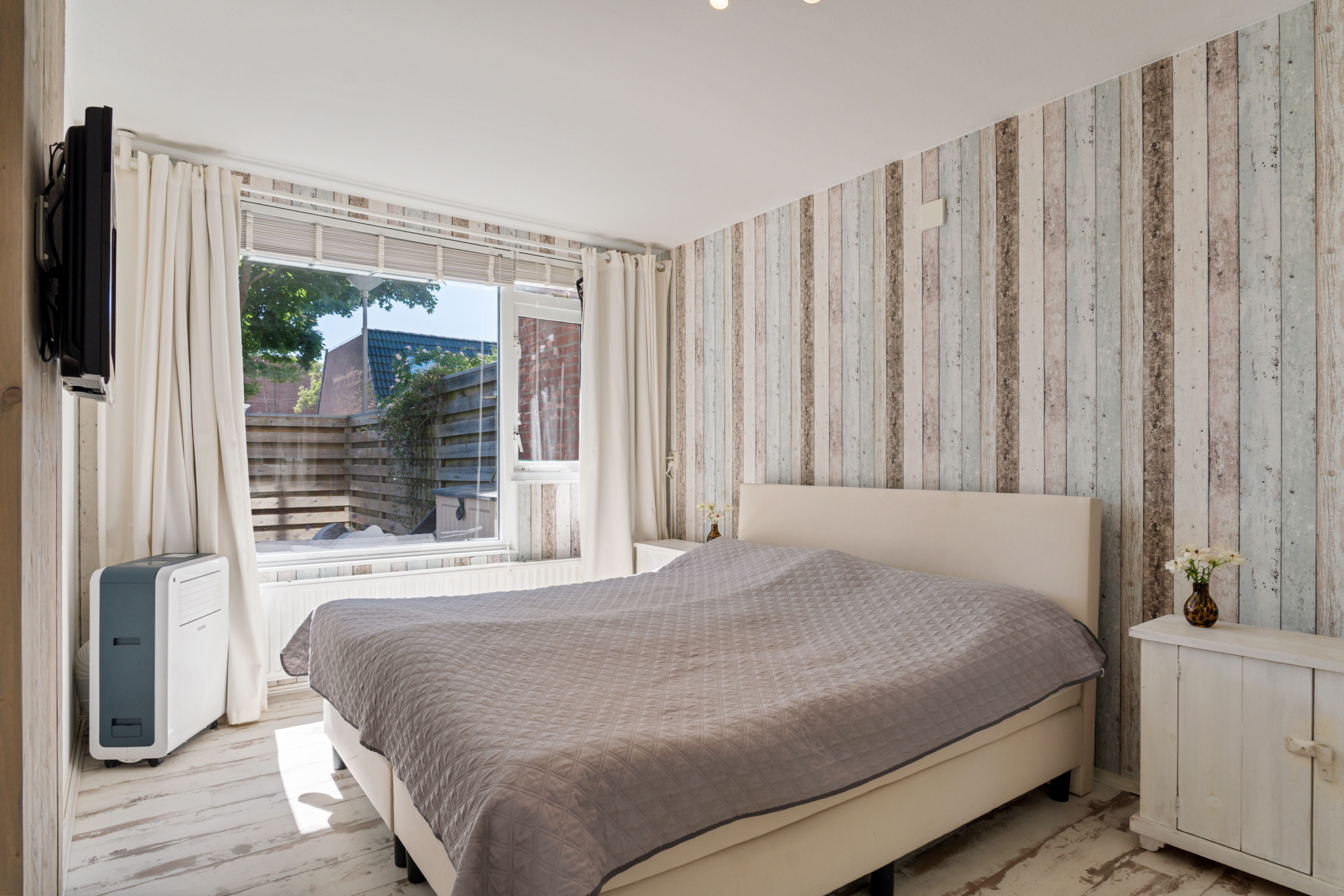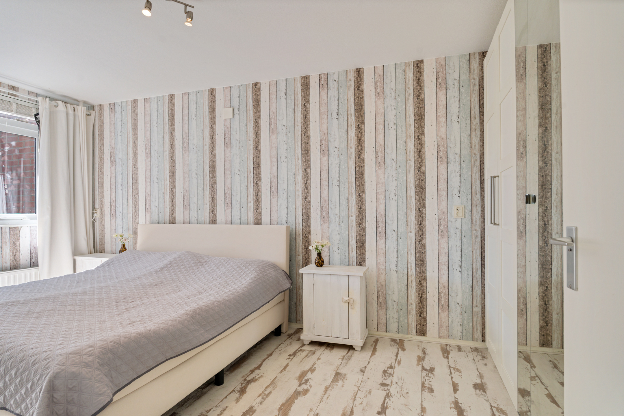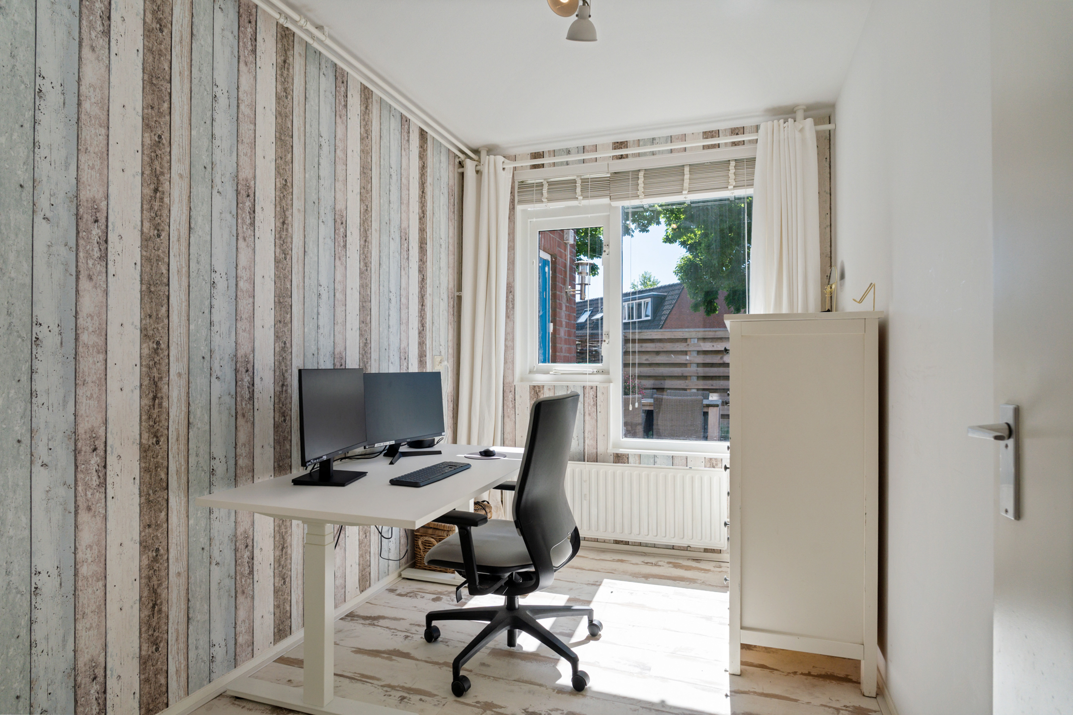 Via de hal bereik je de overige vertrekken. Aan de rechterzijde bevindt zich een moderne toiletruimte, strak afgewerkt en vernieuwd tijdens de renovatie. Links vind je de eerste ruime slaapkamer, momenteel ingericht als praktische werkruimte. De tweede slaapkamer is ruim en licht, met een prettig uitzicht op de tuin – een fijne plek om elke dag wakker te worden.