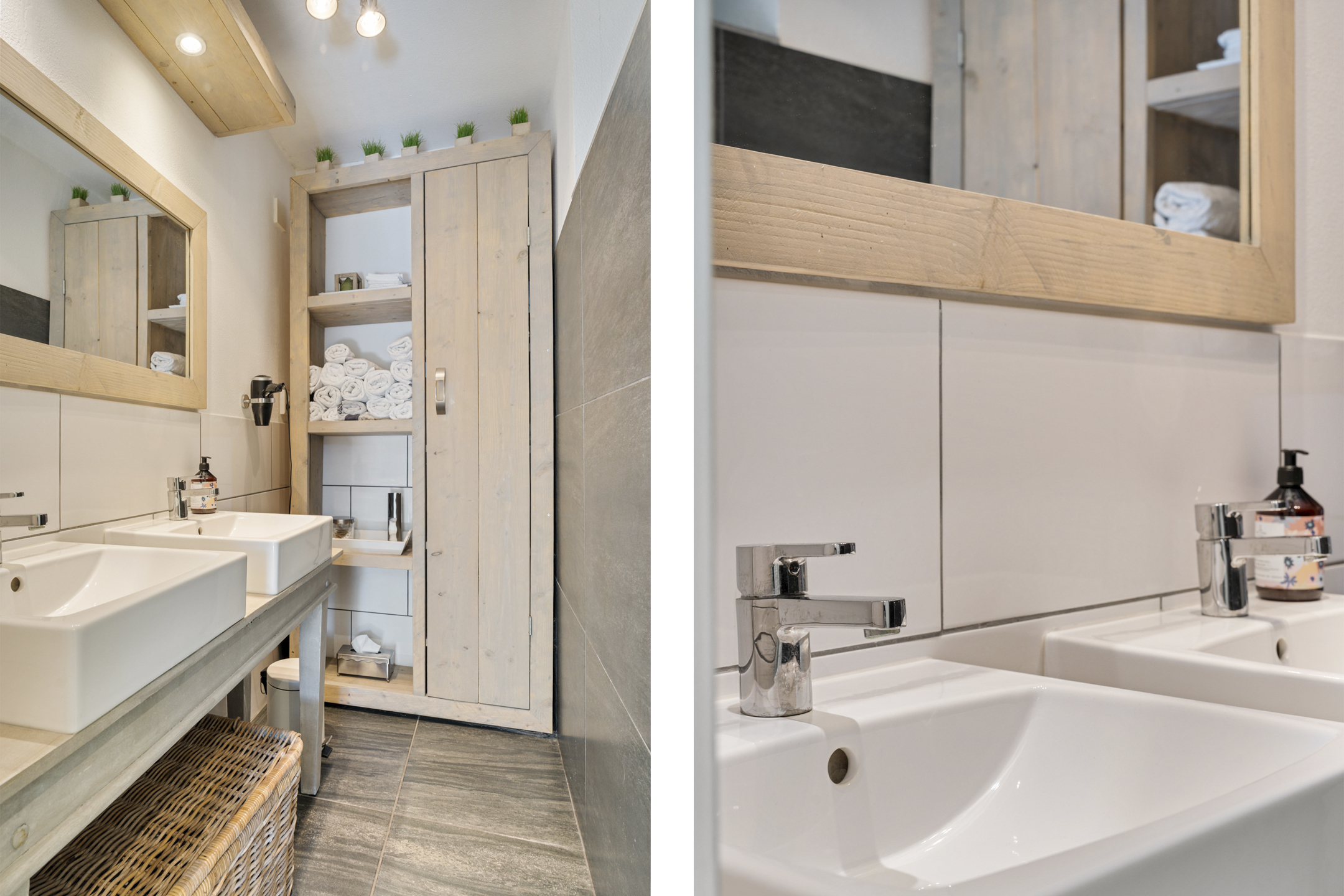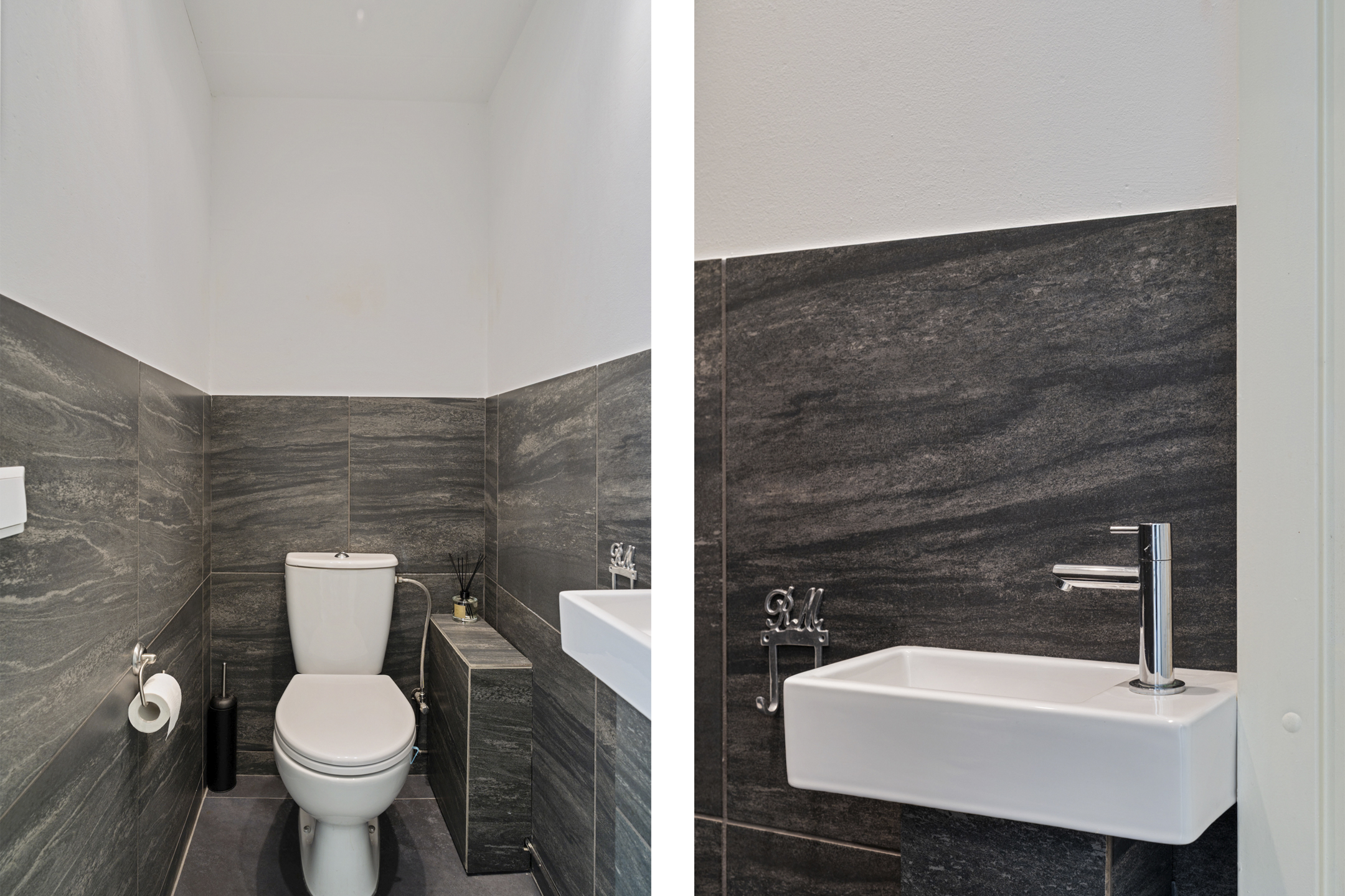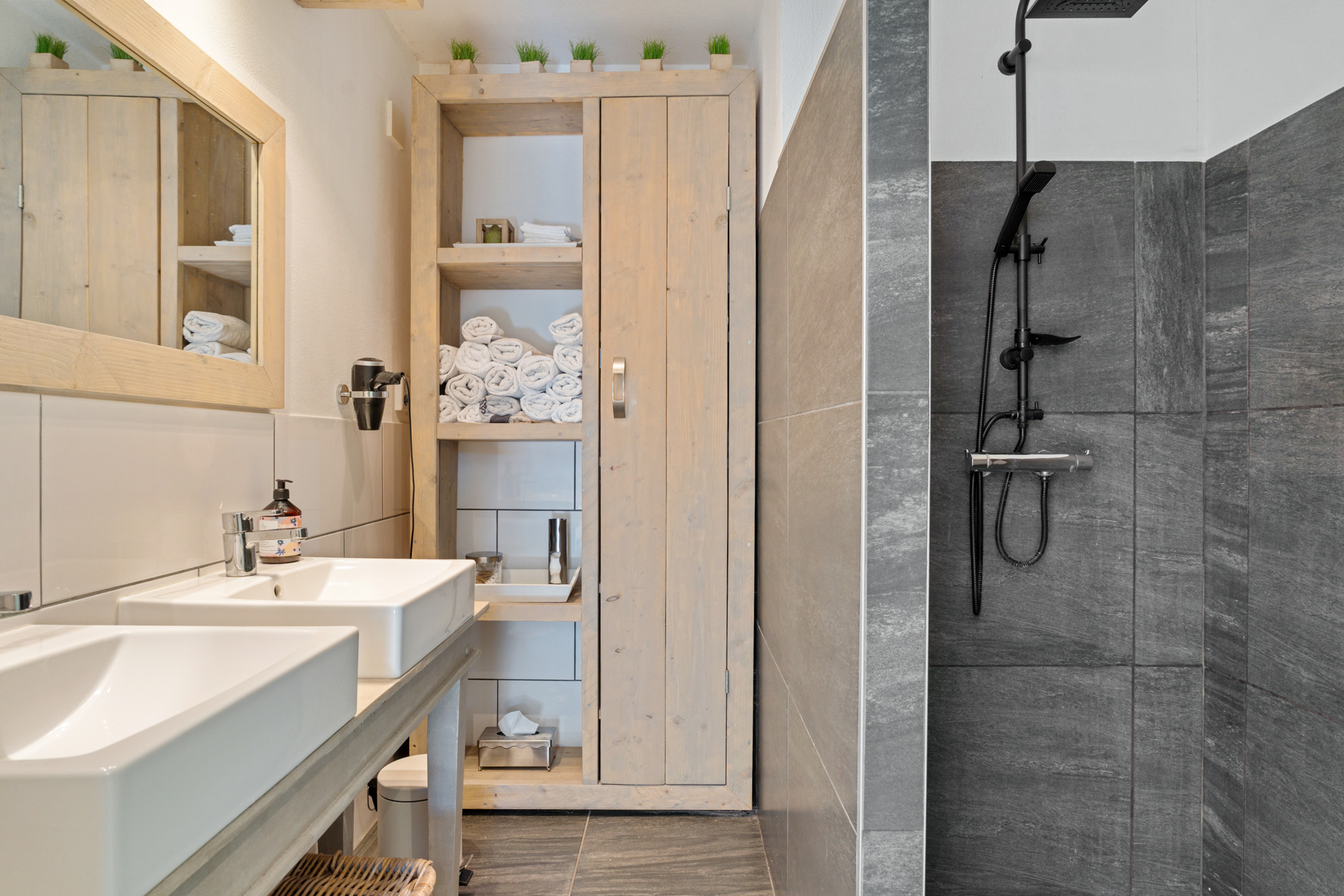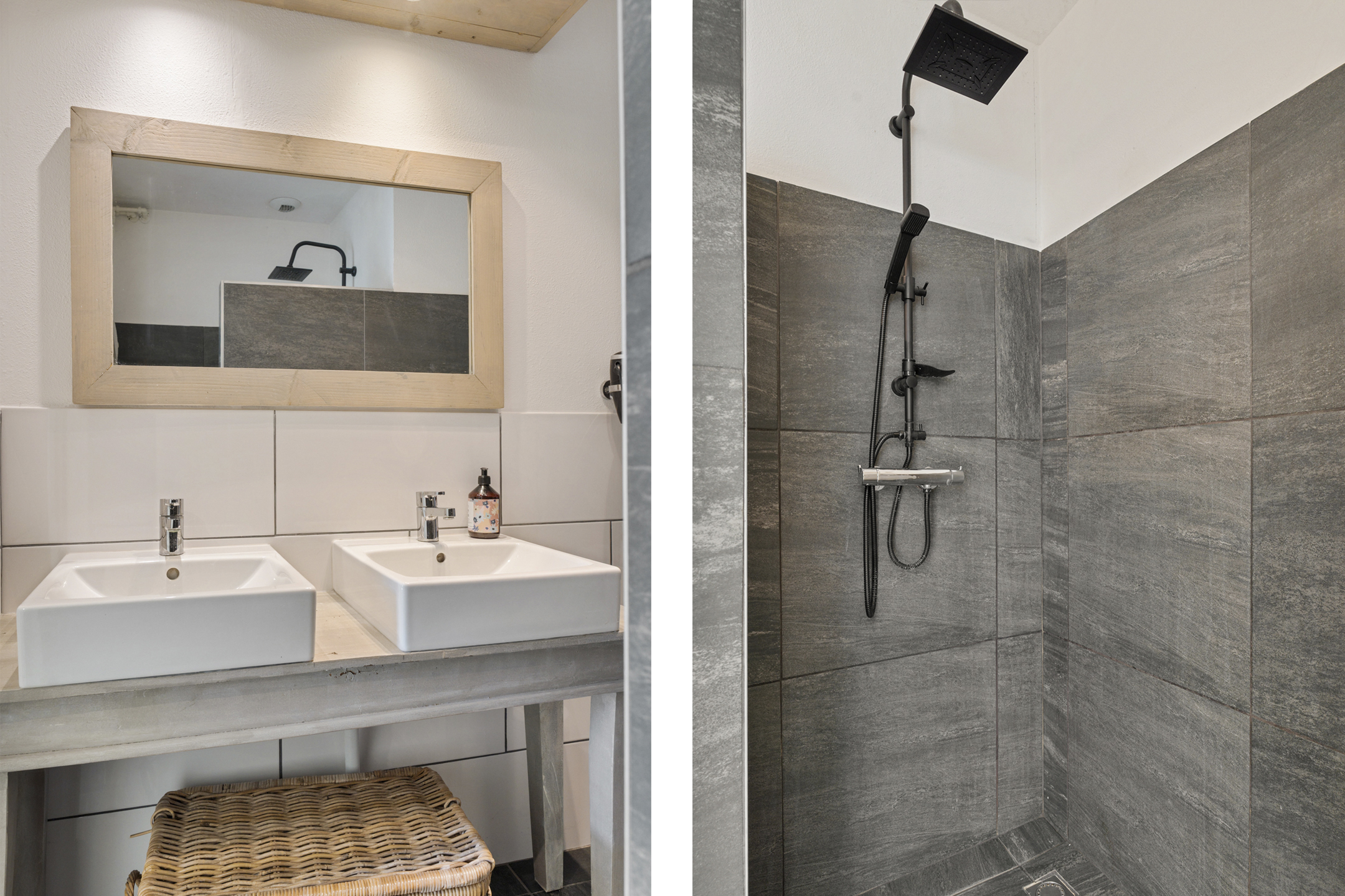 De badkamer is volledig vernieuwd en straalt luxe uit. Voorzien van sfeervolle tegels, een ruime inloopdouche met een zwarte regendouche, een dubbele wastafel, spiegel met inbouwverlichting en een op maat gemaakte badkamer-kast. Hier is duidelijk gekozen voor kwaliteit en comfort.