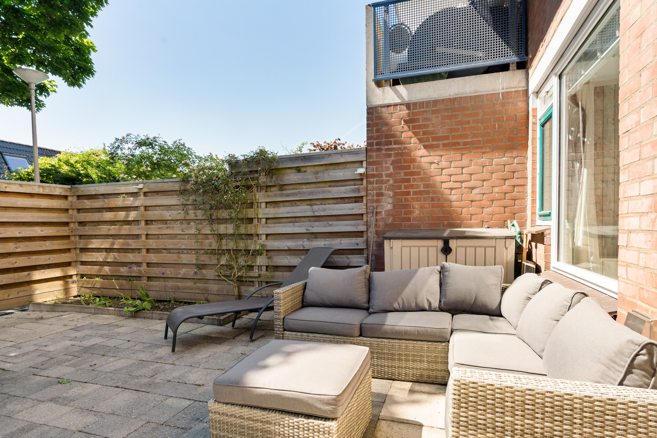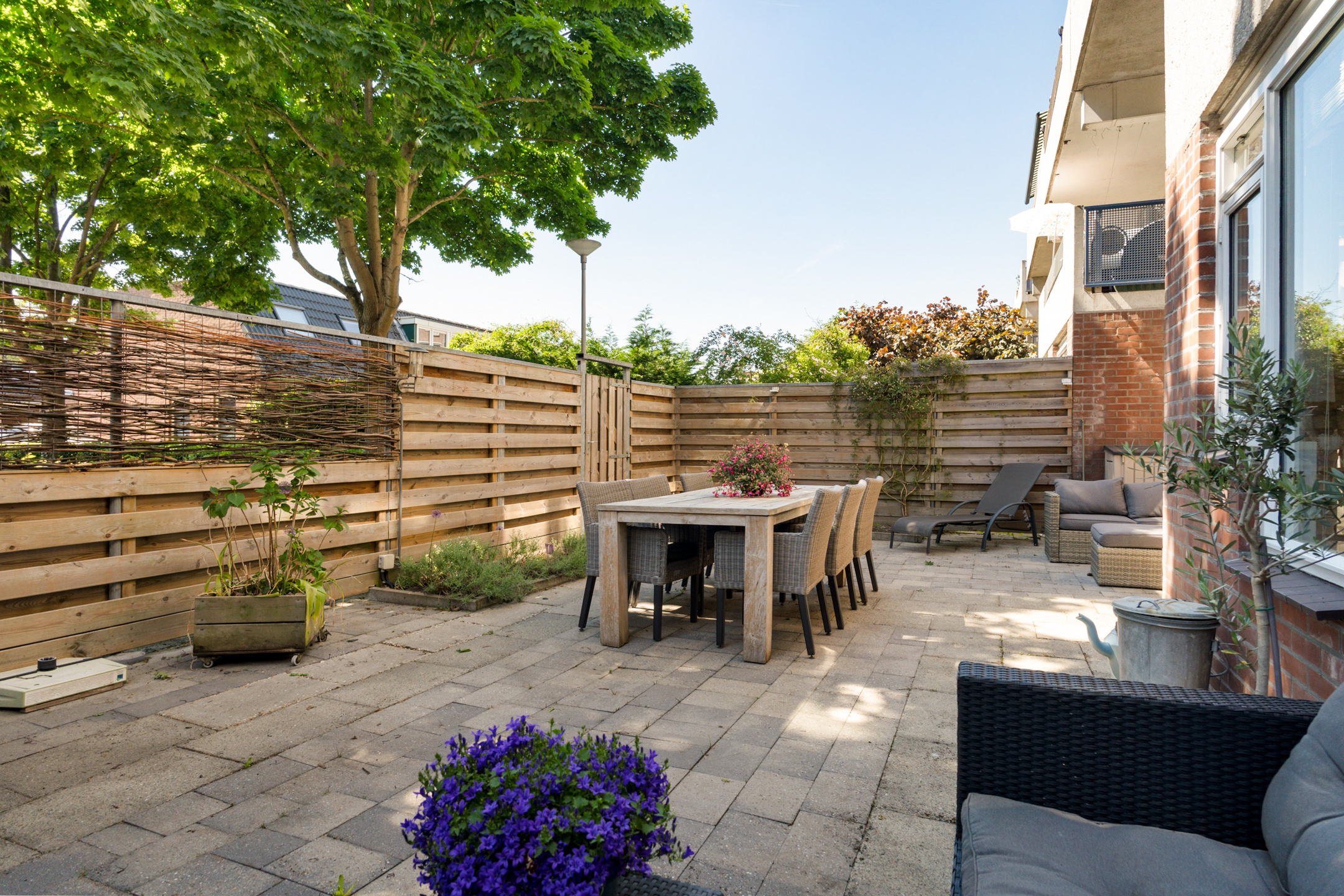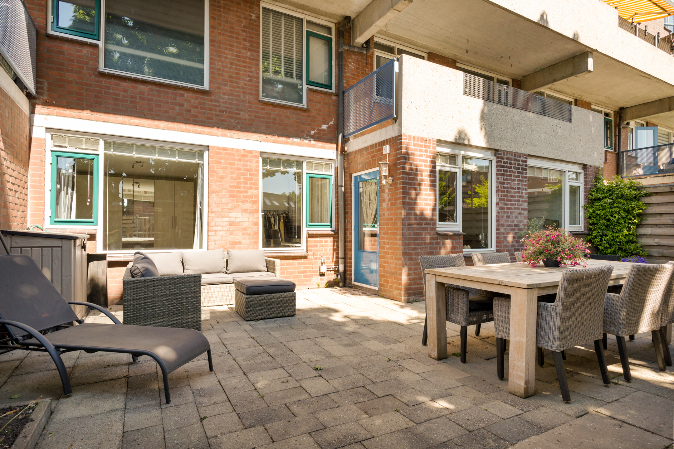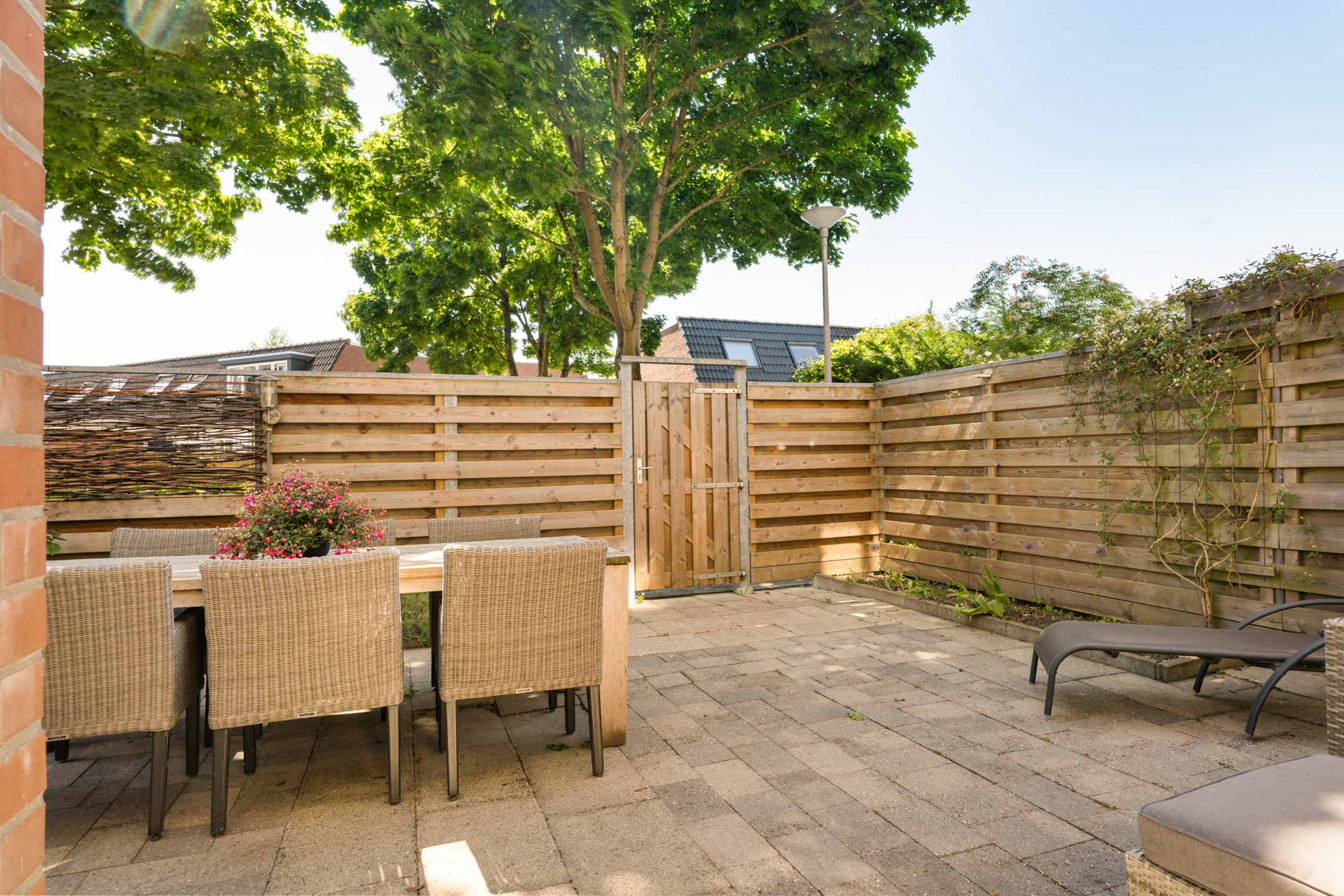 Vanuit de woonkamer stap je zo de absolute blikvanger van deze woning in: de royale, zonnige achtertuin. Deze is strak en onderhoudsvrij aangelegd, met ruimte voor meerdere loungehoeken en een grote eettafel. Hier geniet je de hele dag van de zon. Of je nu wilt ontspannen, barbecueën of tot in de late uurtjes wilt natafelen met vrienden – hier kan het allemaal.