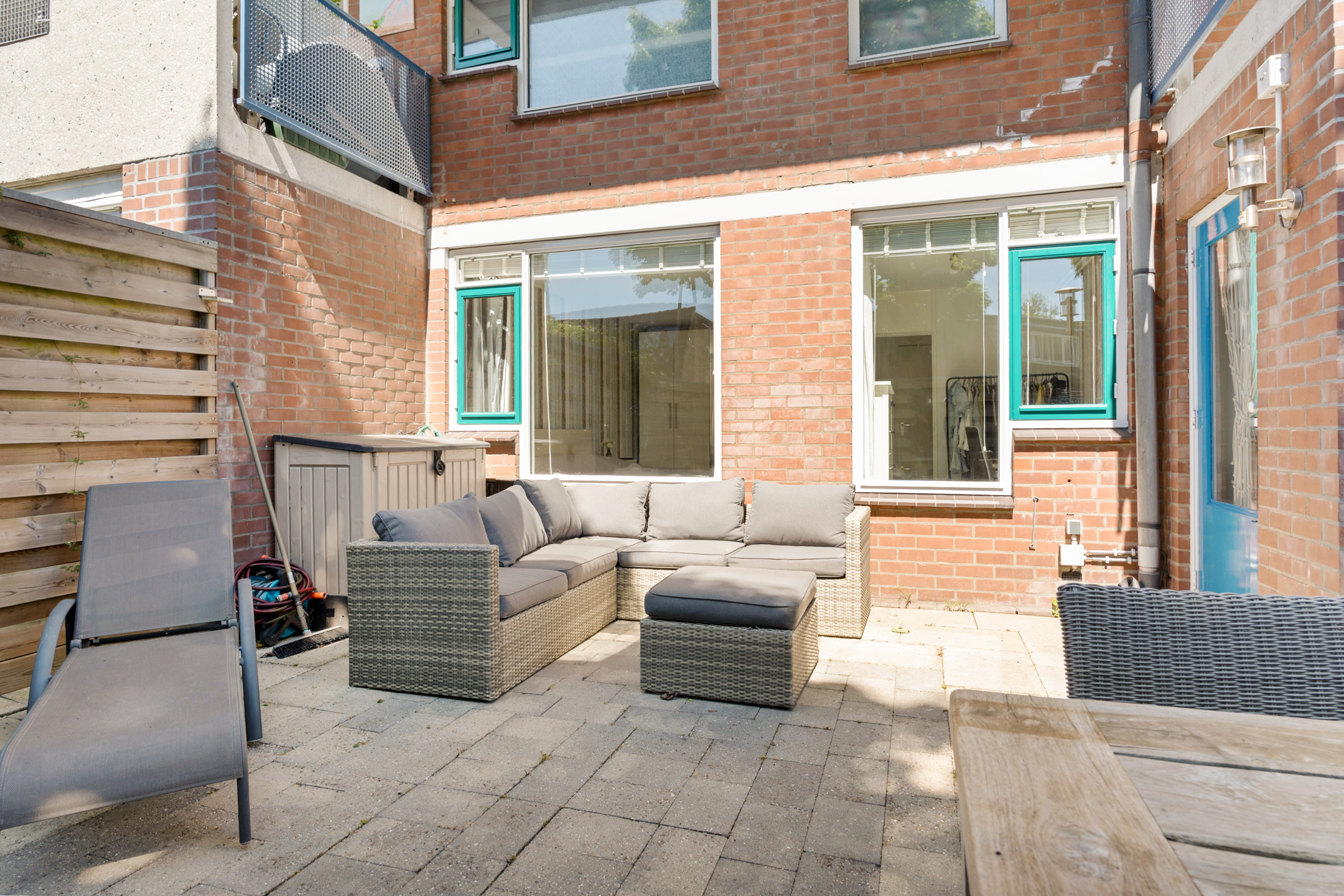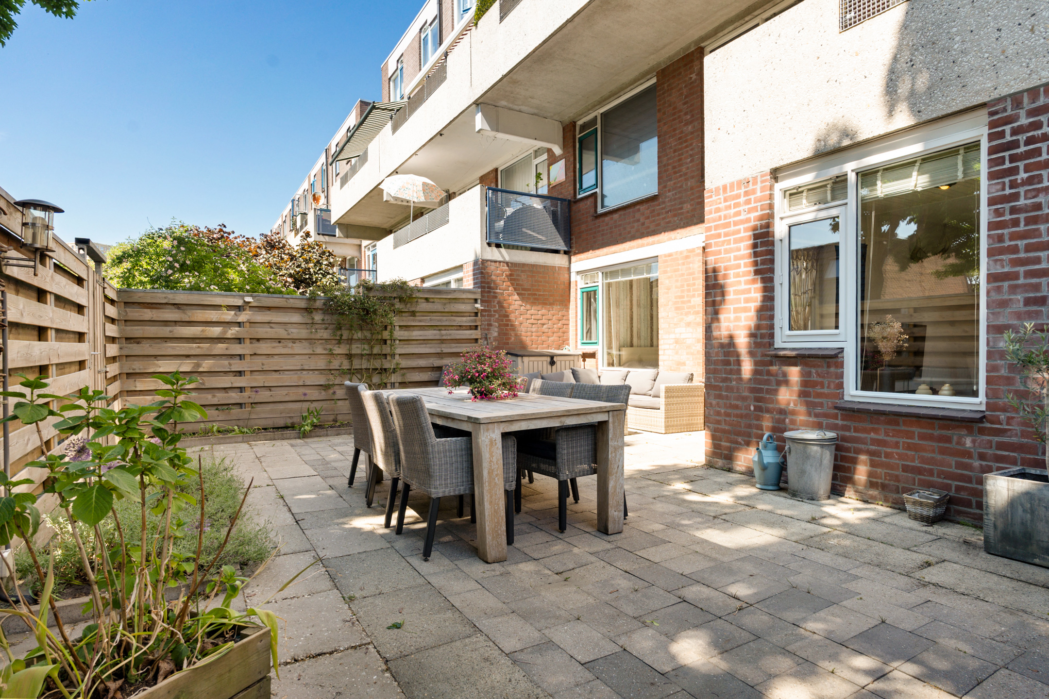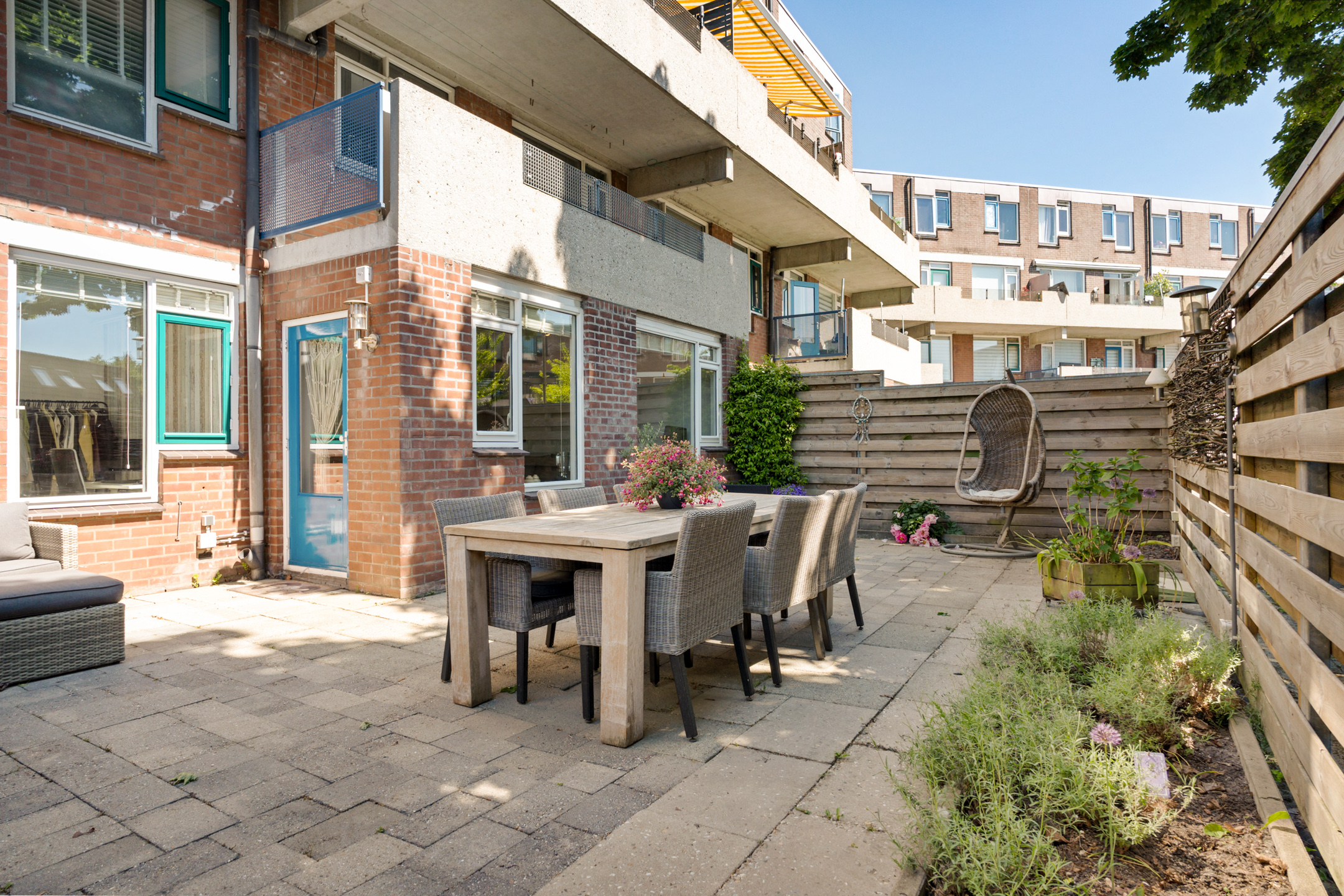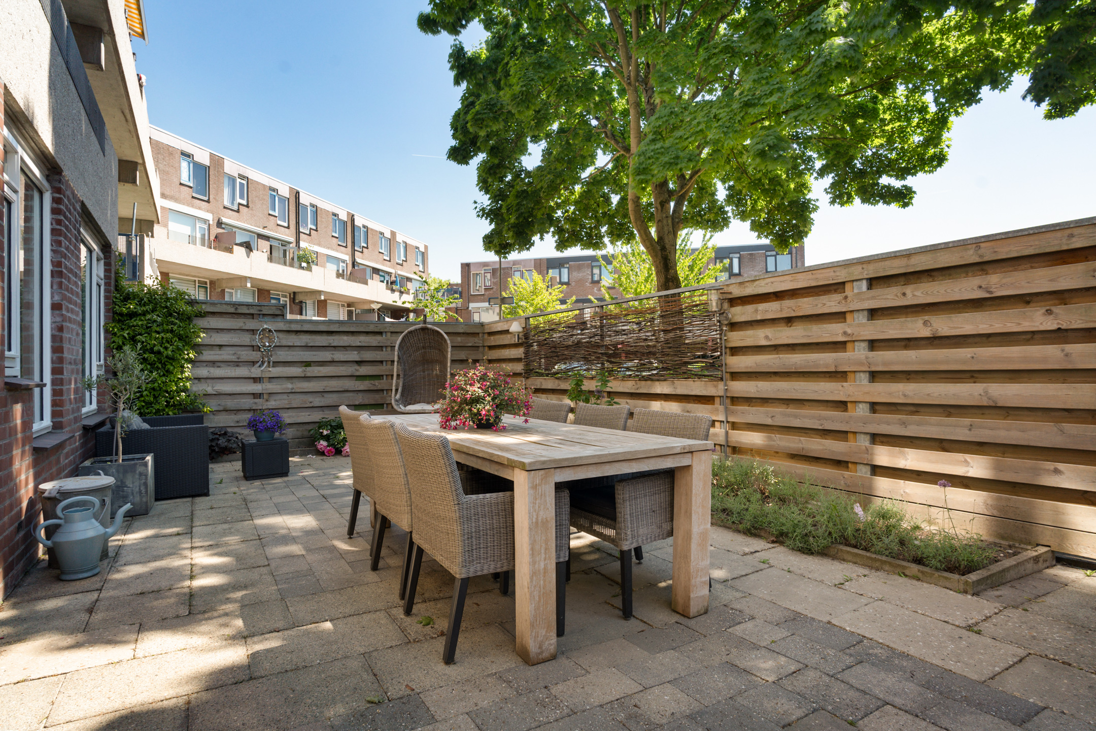 Vanuit de woonkamer stap je zo de absolute blikvanger van deze woning in: de royale, zonnige achtertuin. Deze is strak en onderhoudsvrij aangelegd, met ruimte voor meerdere loungehoeken en een grote eettafel. Hier geniet je de hele dag van de zon. Of je nu wilt ontspannen, barbecueën of tot in de late uurtjes wilt natafelen met vrienden – hier kan het allemaal.