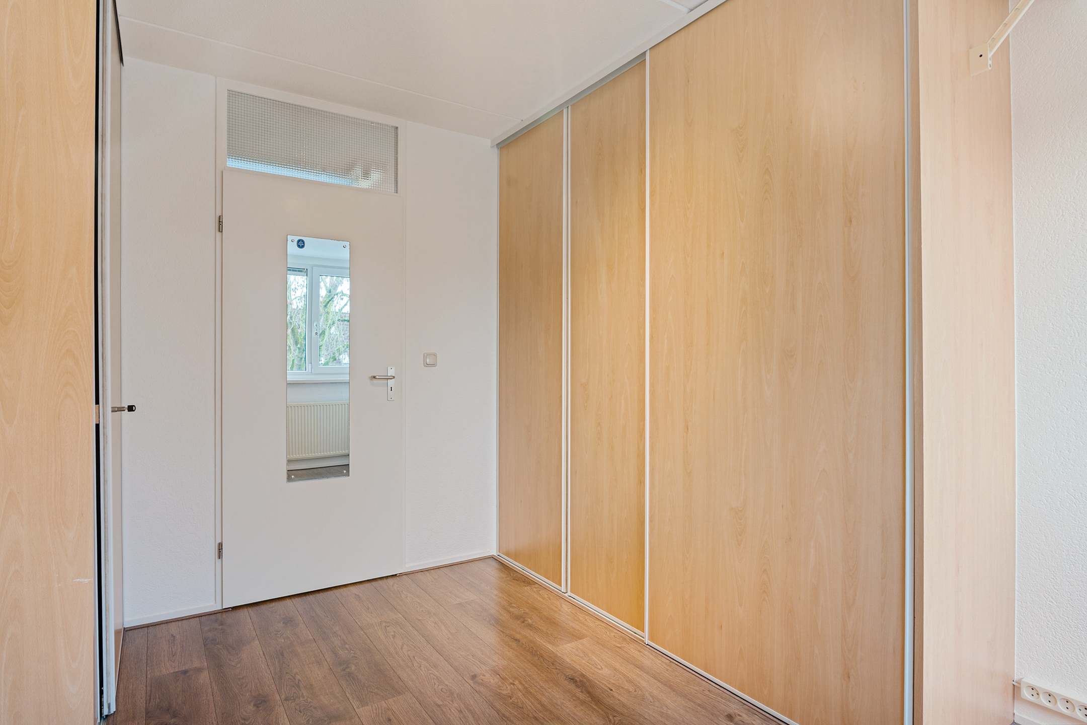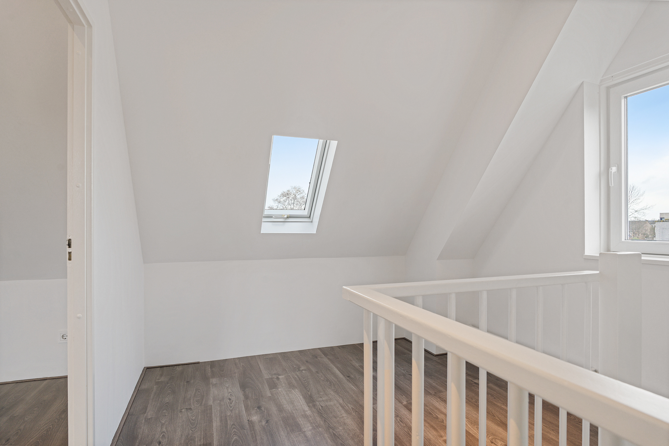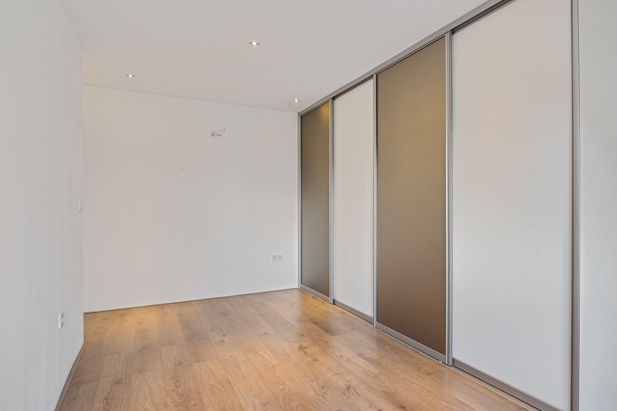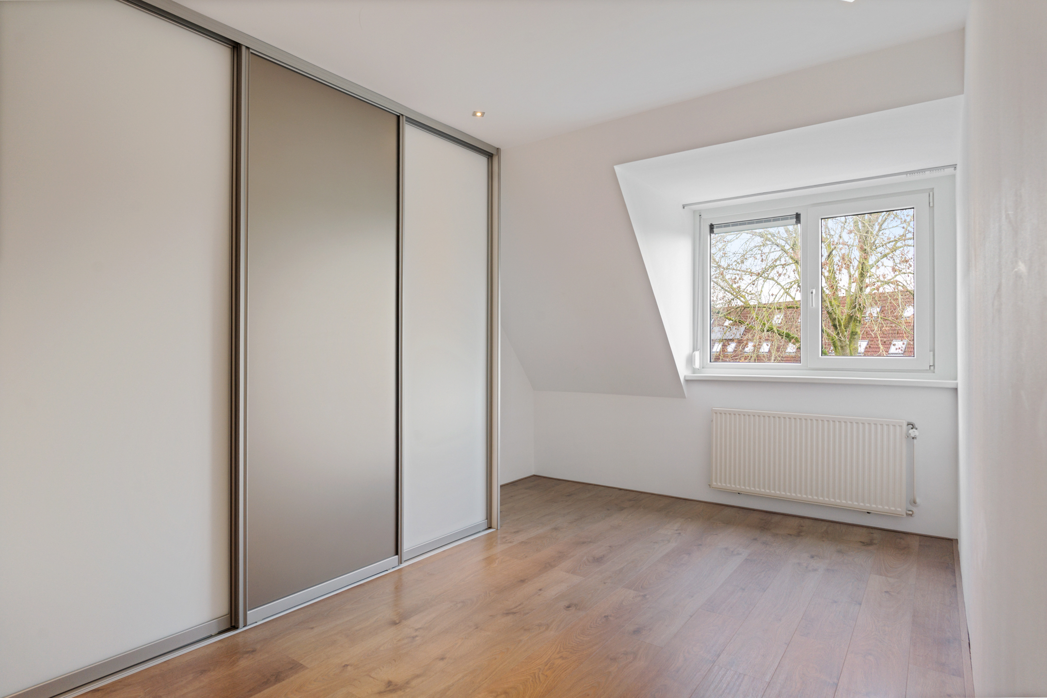 De overloop geeft toegang tot drie ruime slaapkamers, allemaal voorzien van vaste kasten, kunststof kozijnen en rolluiken. De afwerking is strak en goed onderhouden. Ook hier is vloerverwarming aanwezig.
