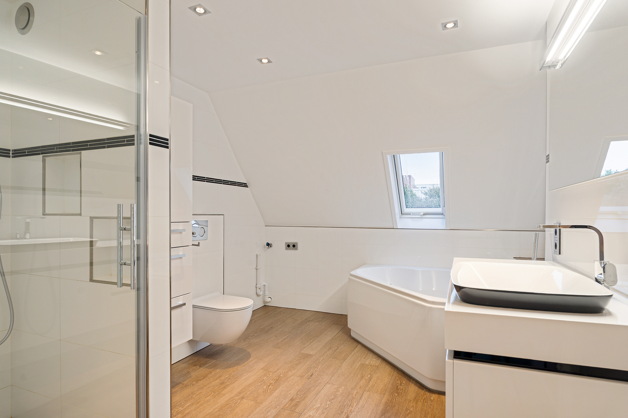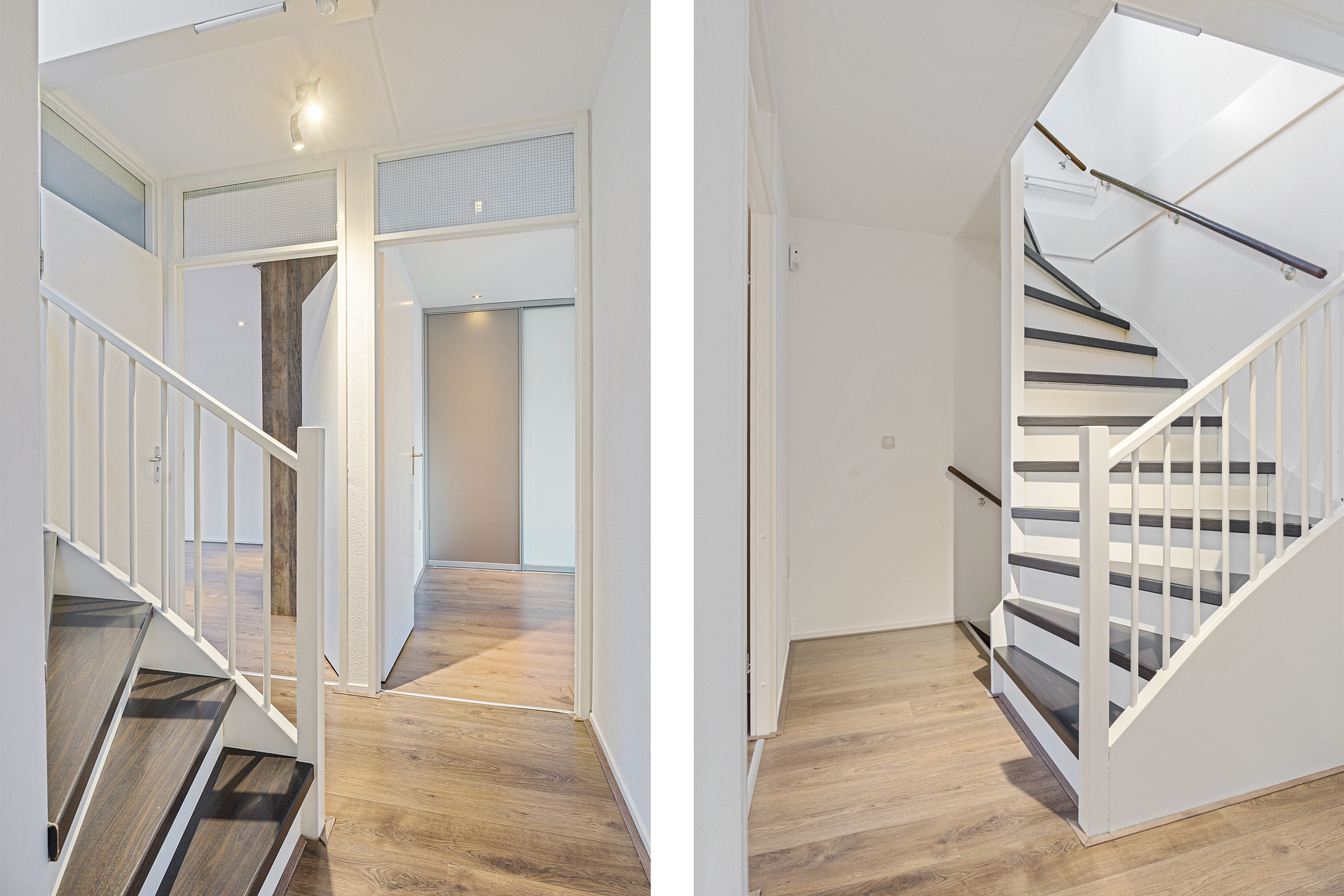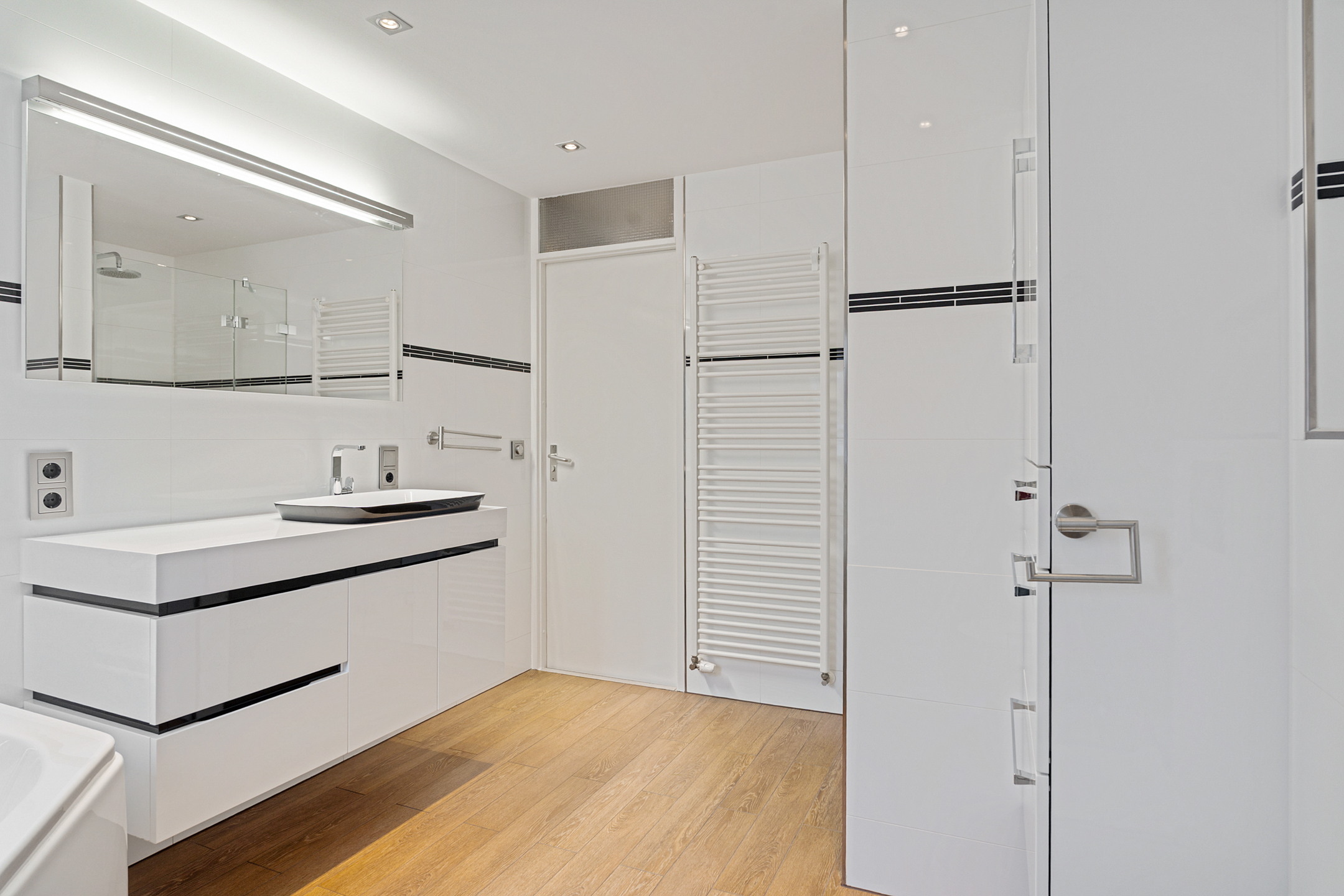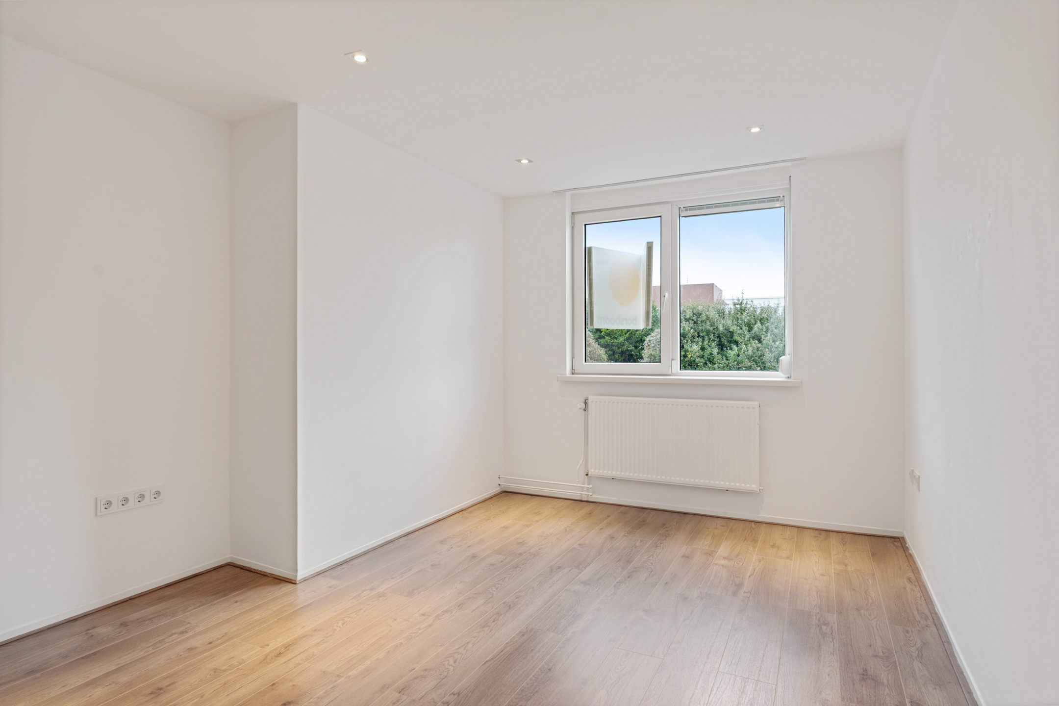 De overloop geeft toegang tot drie ruime slaapkamers, allemaal voorzien van vaste kasten, kunststof kozijnen en rolluiken. De afwerking is strak en goed onderhouden. Ook hier is vloerverwarming aanwezig.
