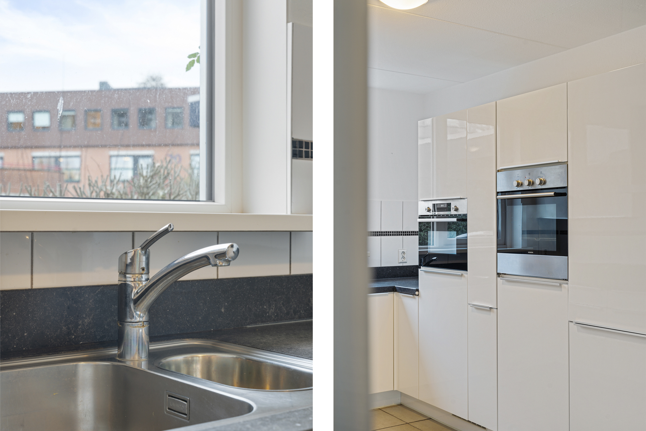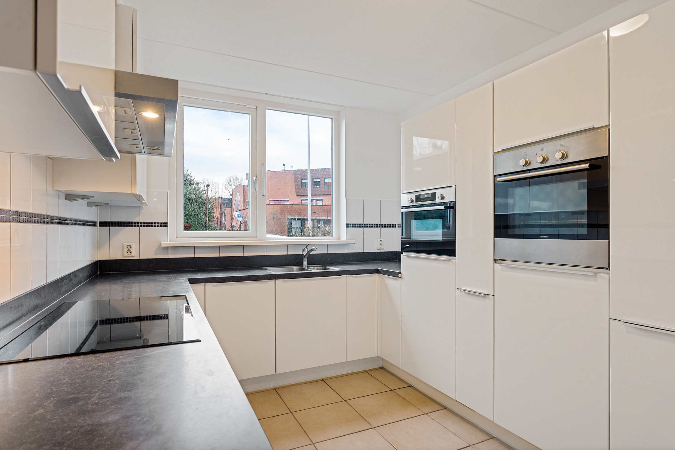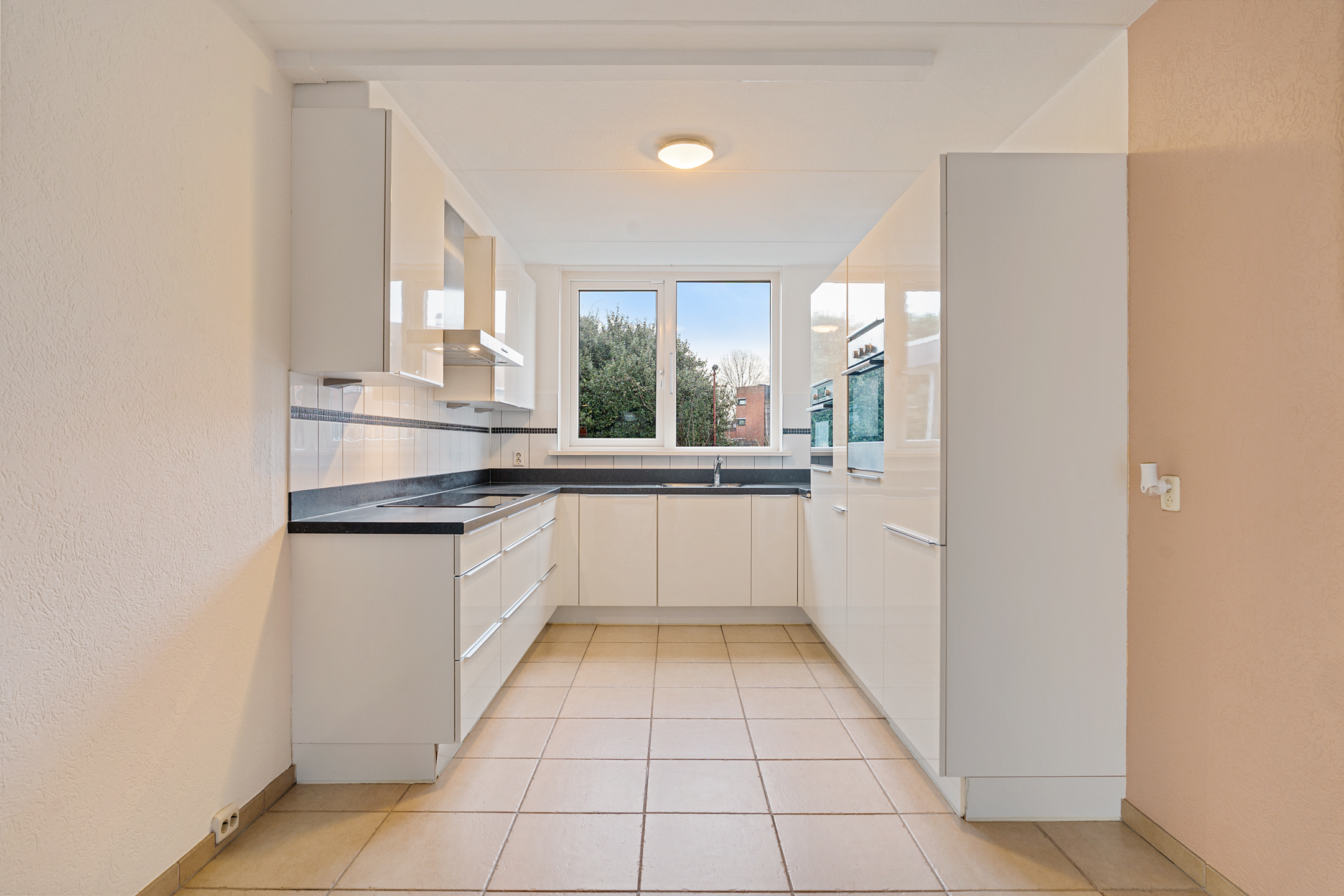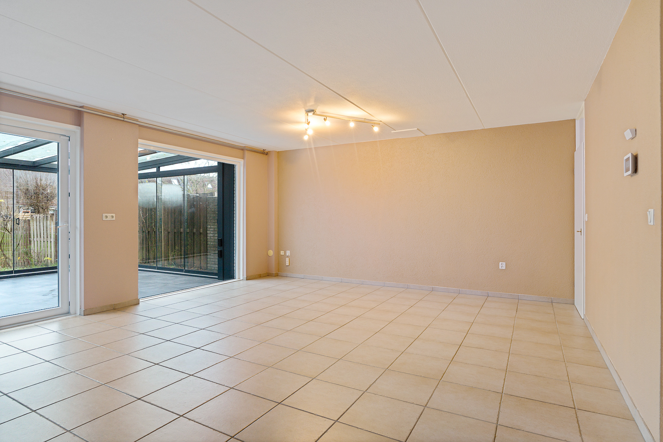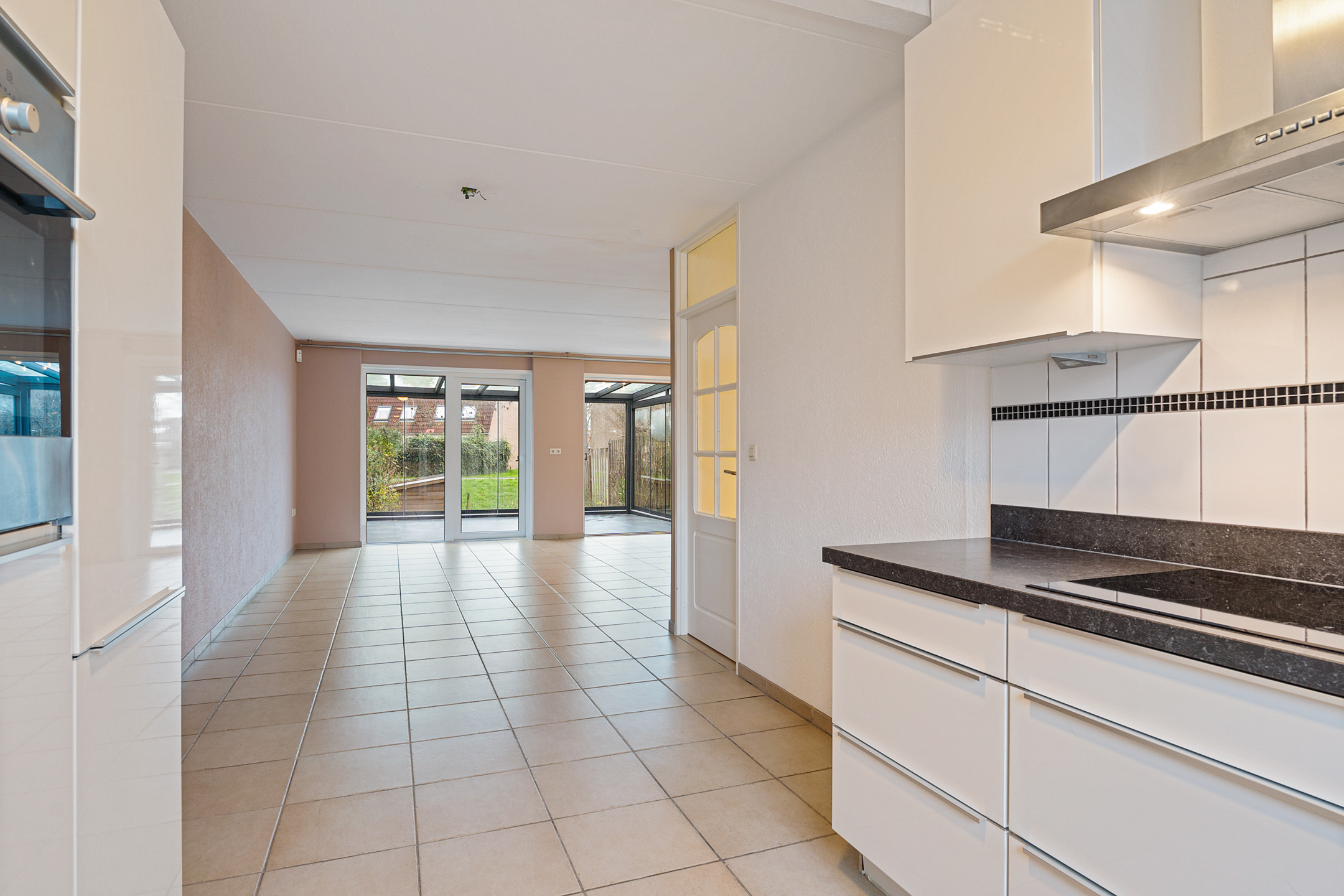 De royale woonkamer heeft een strakke afwerking, plavuizen met vloerverwarming en fijne lichtinval. Aan de achterzijde is de volledig afsluitbare serre aangebouwd, een ideale plek als extra zit- of speelruimte. De keuken ligt aan de voorzijde en is ingericht in een praktische u-opstelling, voorzien van onder andere een elektrische kookplaat.