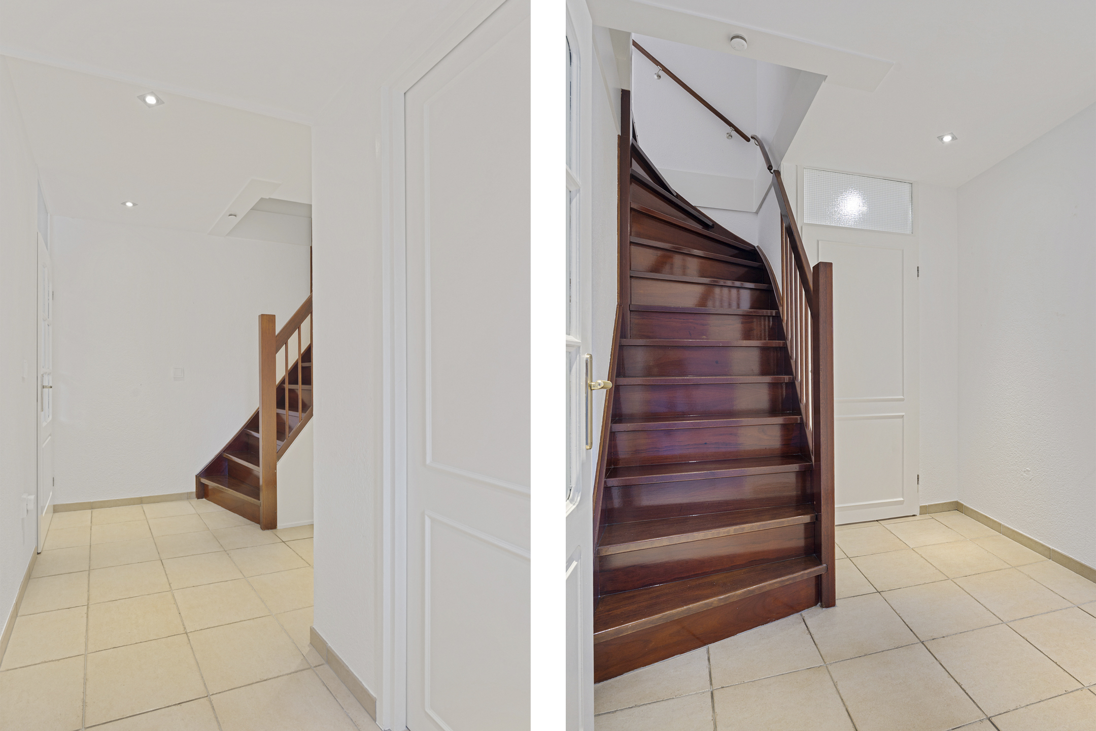Binnen kom je in een ruime hal met plavuizen vloer, toegang tot de berging, de meterkast en de toiletruimte. De hardhouten trap brengt je naar de verdieping.