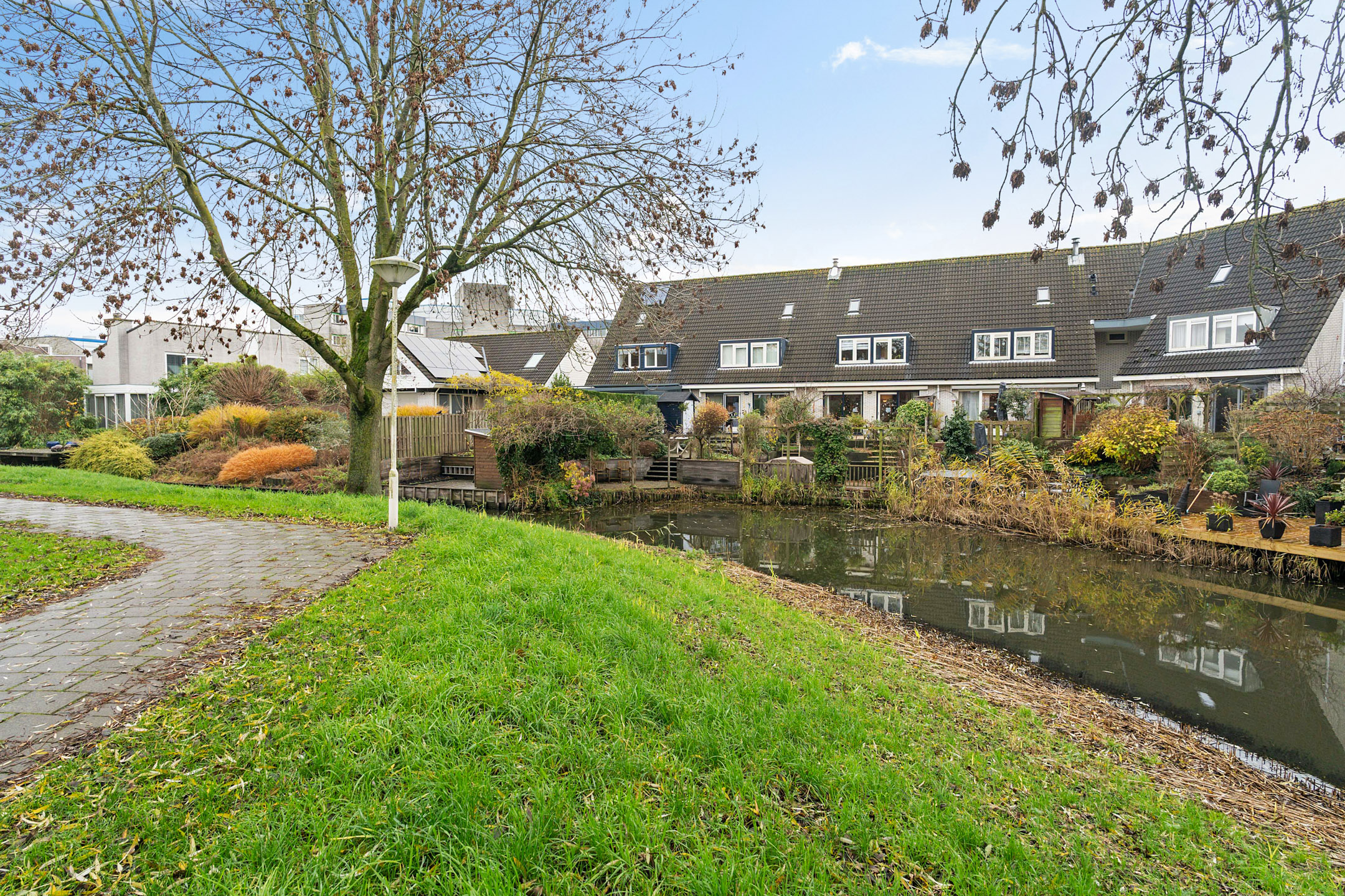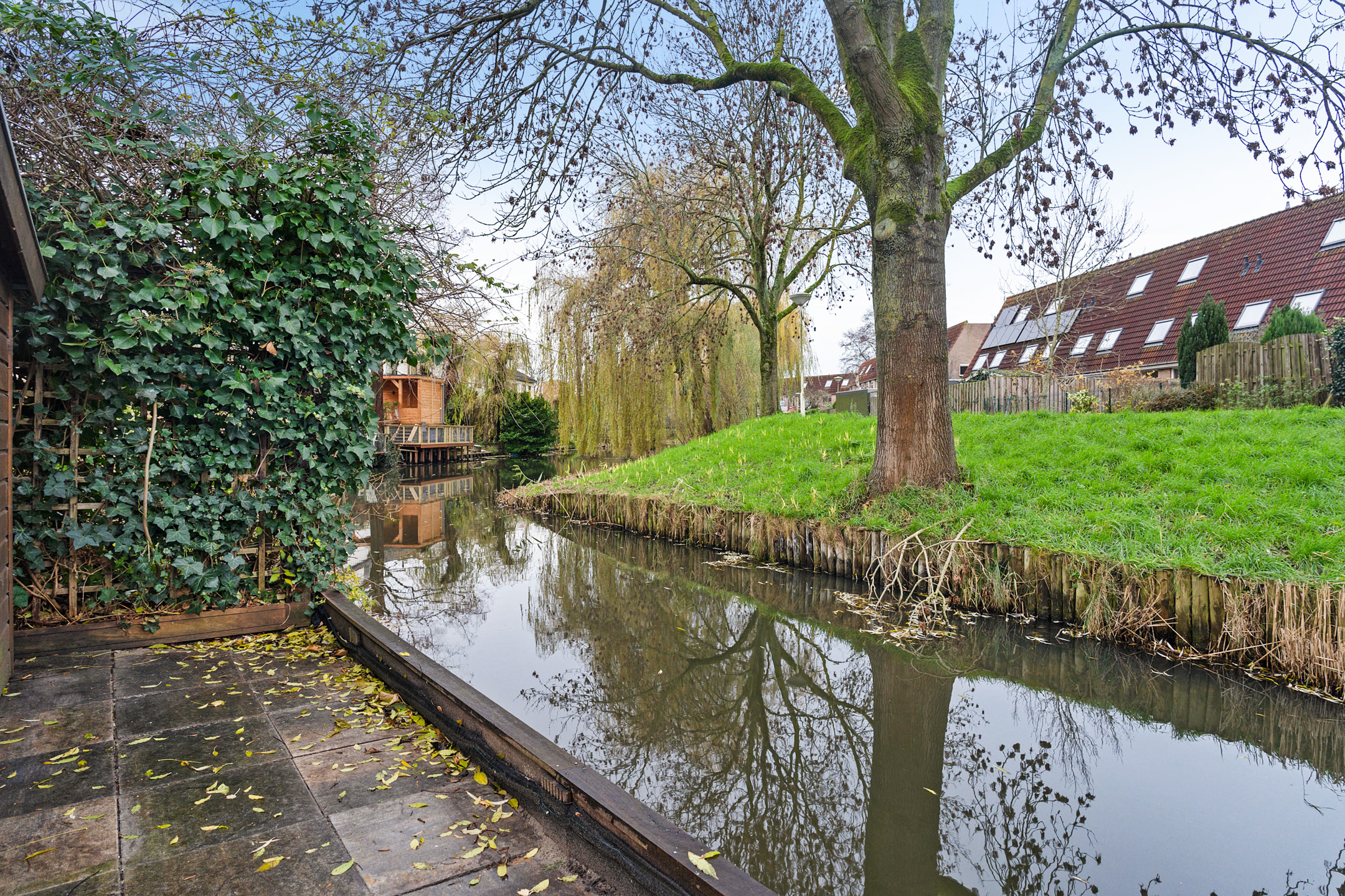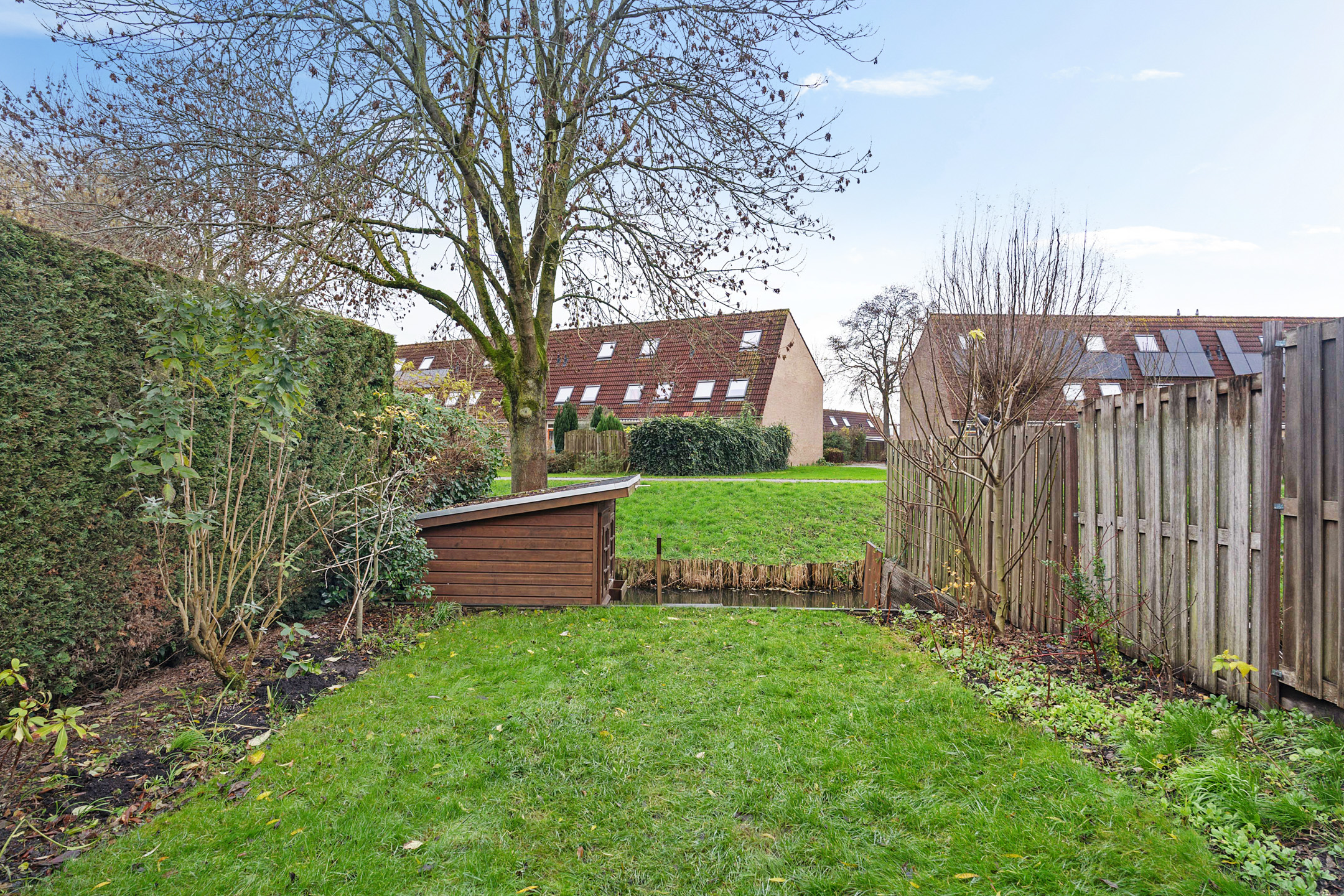 De achtertuin ligt op het westen en biedt veel sfeer. Achterin is een verlaagd zitgedeelte aan het water gemaakt: een rustige plek waar je het hele jaar door kunt genieten van het uitzicht. Verder is er een houten berging aanwezig.