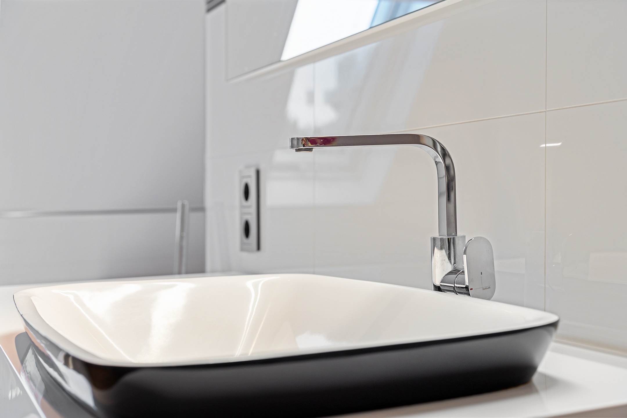 De volledig betegelde badkamer is uitgerust met een inloopdouche, hoekbad, wastafelmeubel, toilet en wasmachineaansluiting.