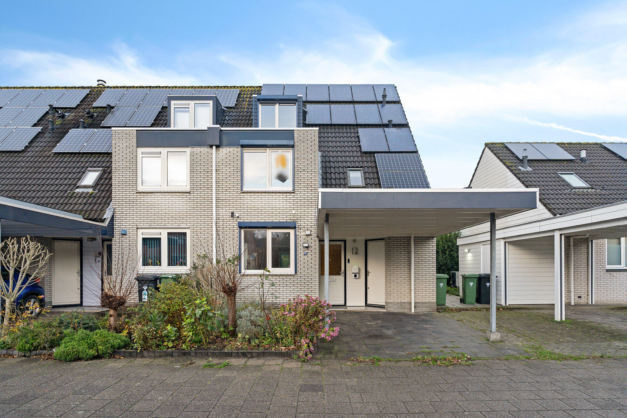 Aan de voorzijde beschik je over een eigen parkeerplaats onder de carport, direct grenzend aan de voortuin. Vanuit hier heb je toegang tot de inpandige berging en de entree van de woning.