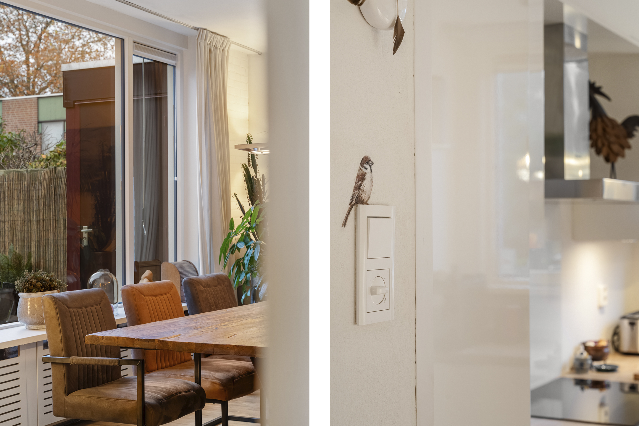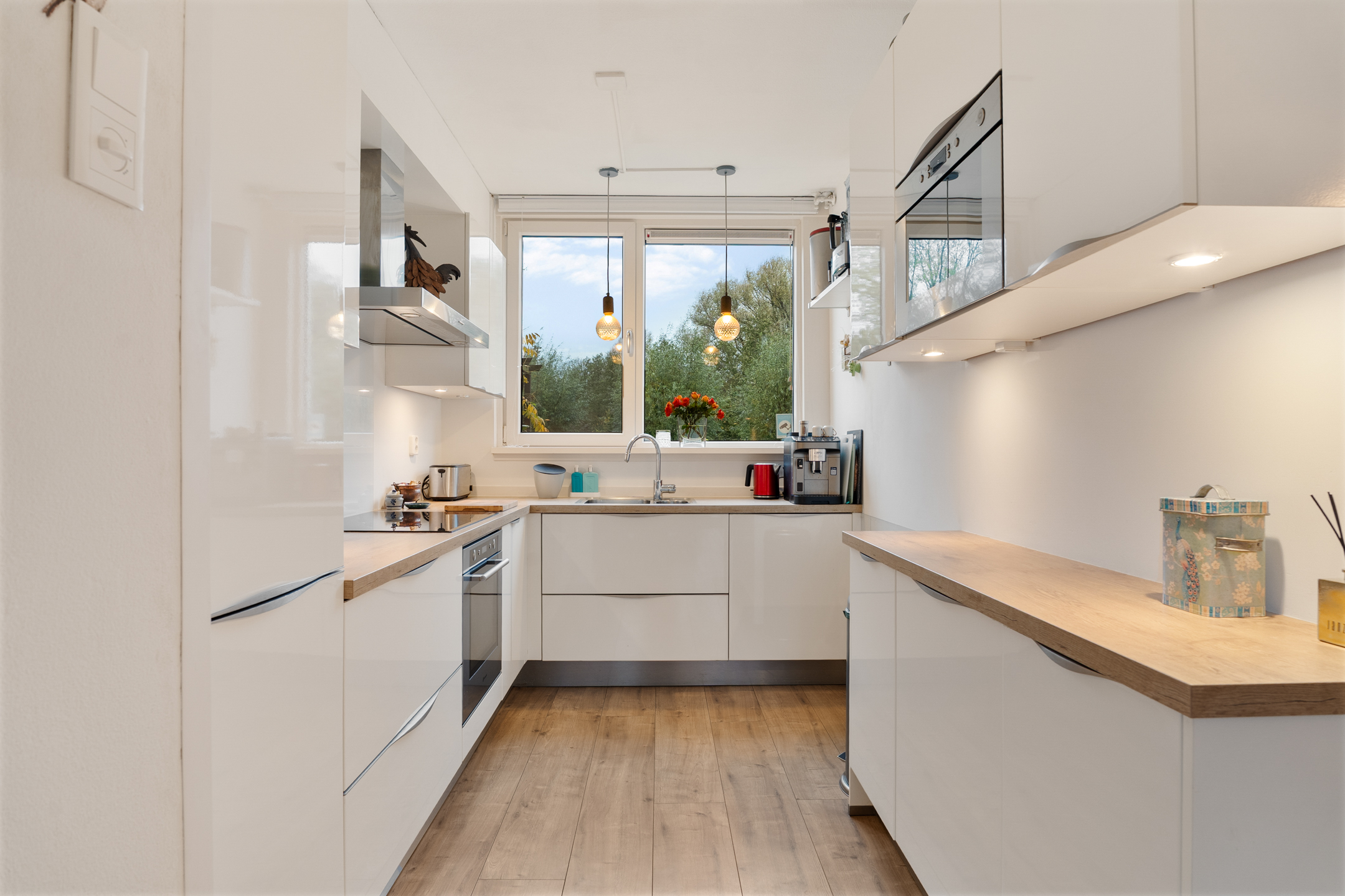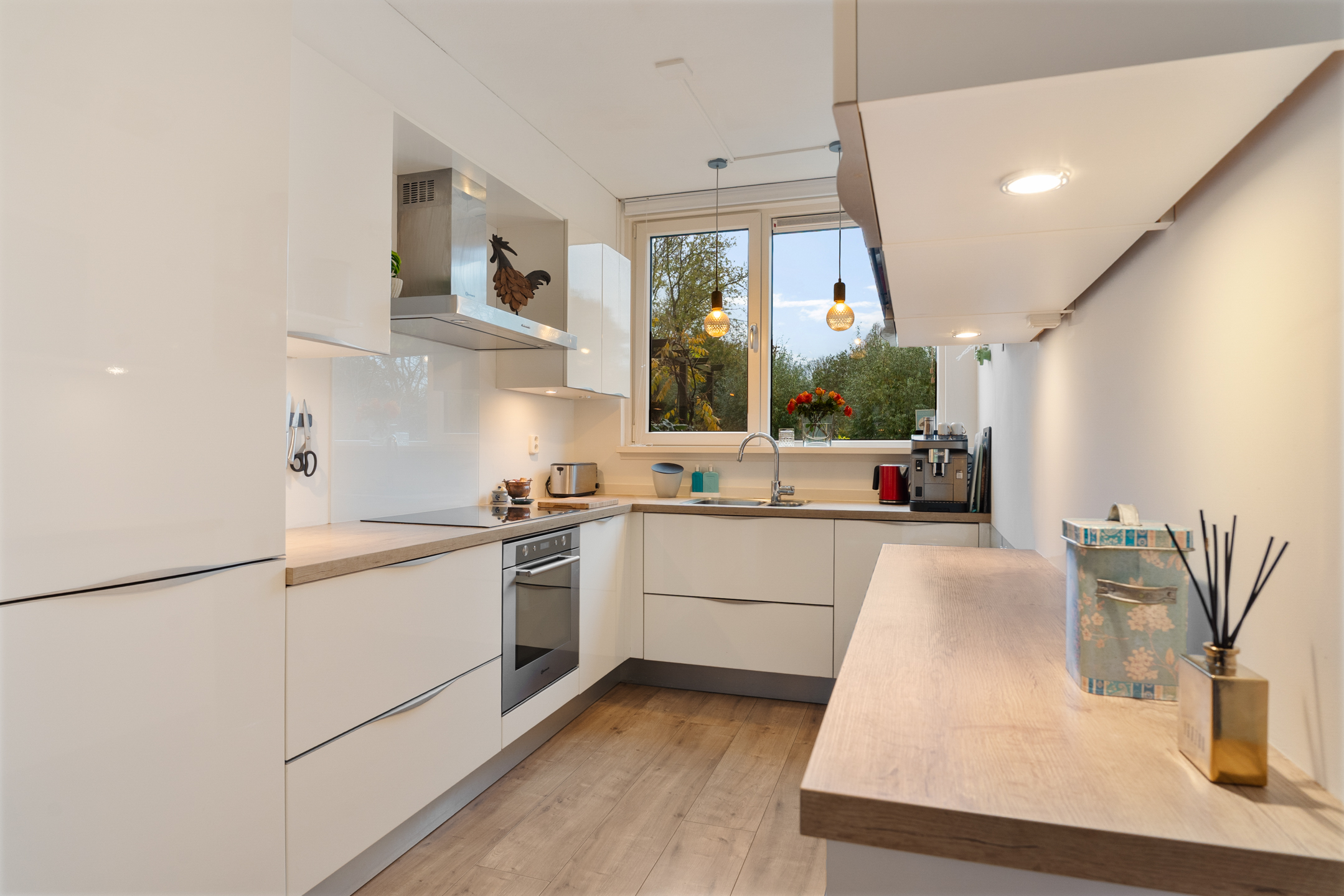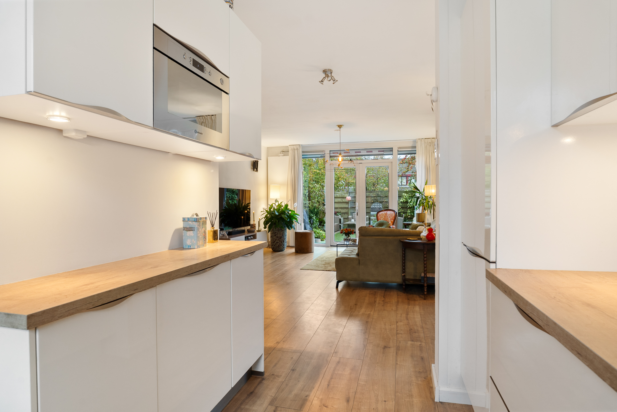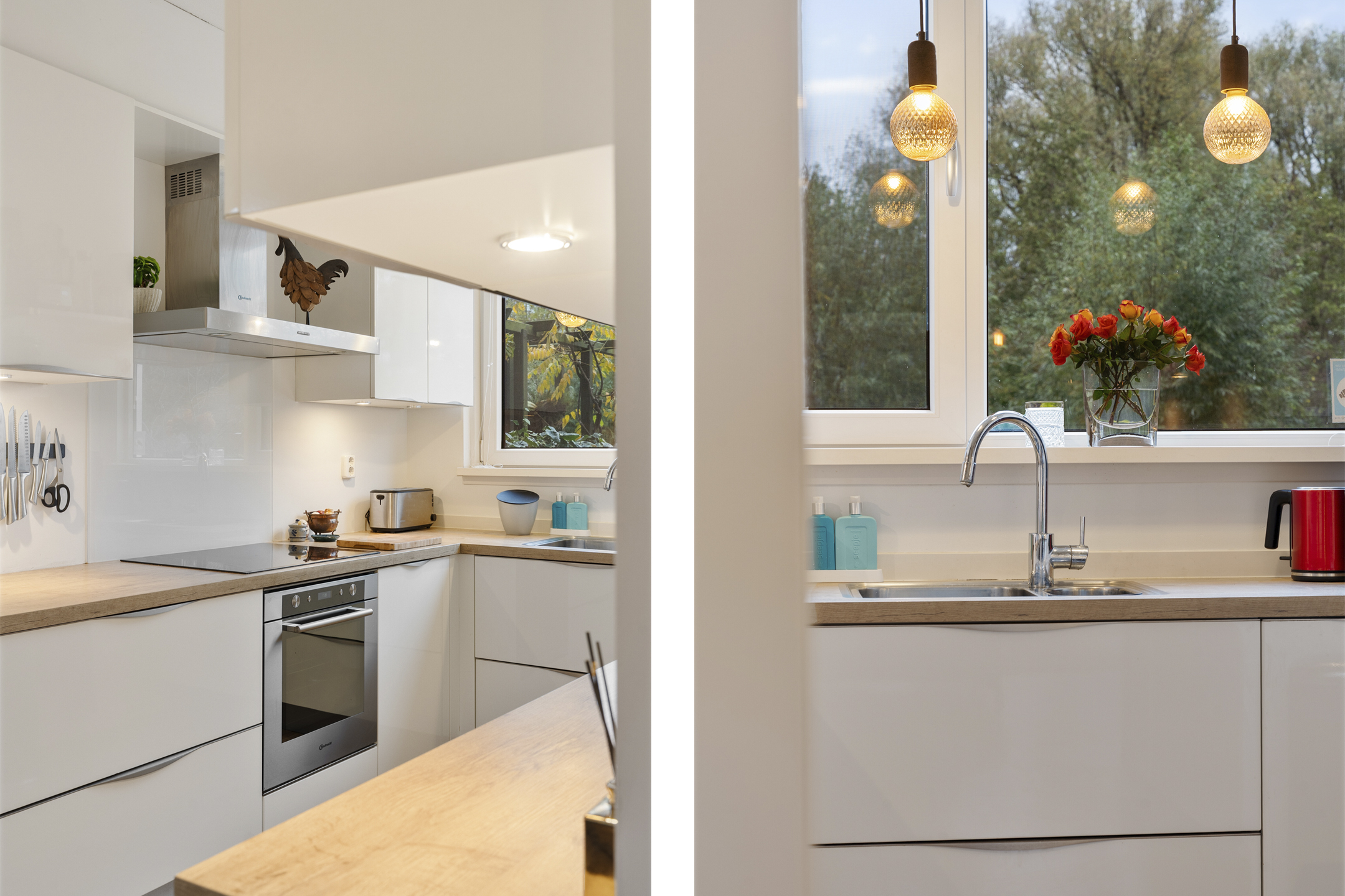 Aan de voorzijde bevindt zich de open en moderne keuken (2018). De keuken is voorzien van hoogwaardig gemoderniseerde inbouwapparatuur, waaronder; een inductiekookplaat van Bosch (2024), een vaatwasser (Siemens 2024) en een separate heteluchtoven en magnetron van Bauknecht. Via de openslaande deuren in de woonkamer kom je in de diepe, op het zuiden/oosten gelegen achtertuin, inclusief stenen berging, fietsenhok, tuinkast en achterom. De royale tuin is netjes onderhouden (deels betegeld en grotendeels voorzien van groen) en voorzien van twee zonneschermen, waardoor je de gehele dag heerlijk kan vertoeven buiten. De kunststof kozijnen met HR+++ glas zorgen voor uitstekende isolatie en een laag energieverbruik.