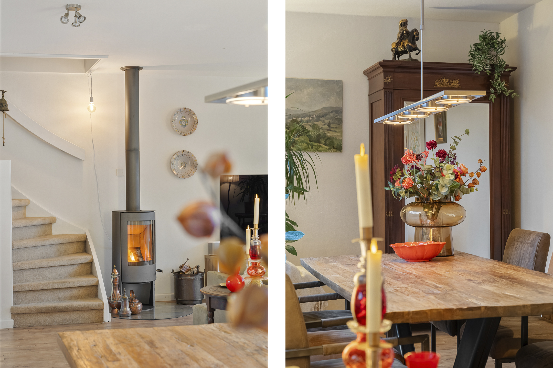 Via de ruime voortuin kom je binnen in de lichte hal. Aan de linkerzijde bevindt zich het toilet. Vanuit de hal loop je door naar de royale woonkamer met grote raampartijen en een sfeervolle open haard.