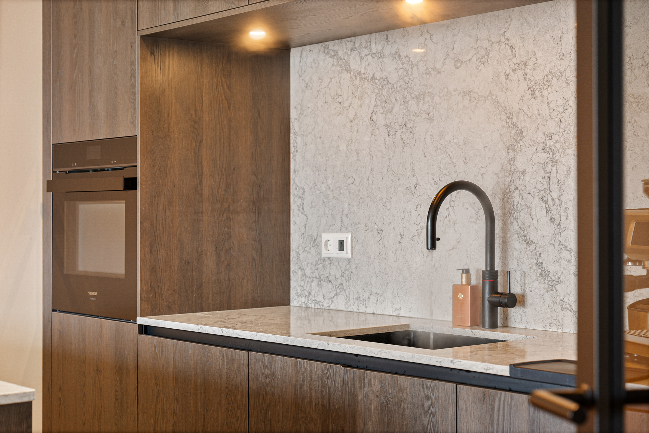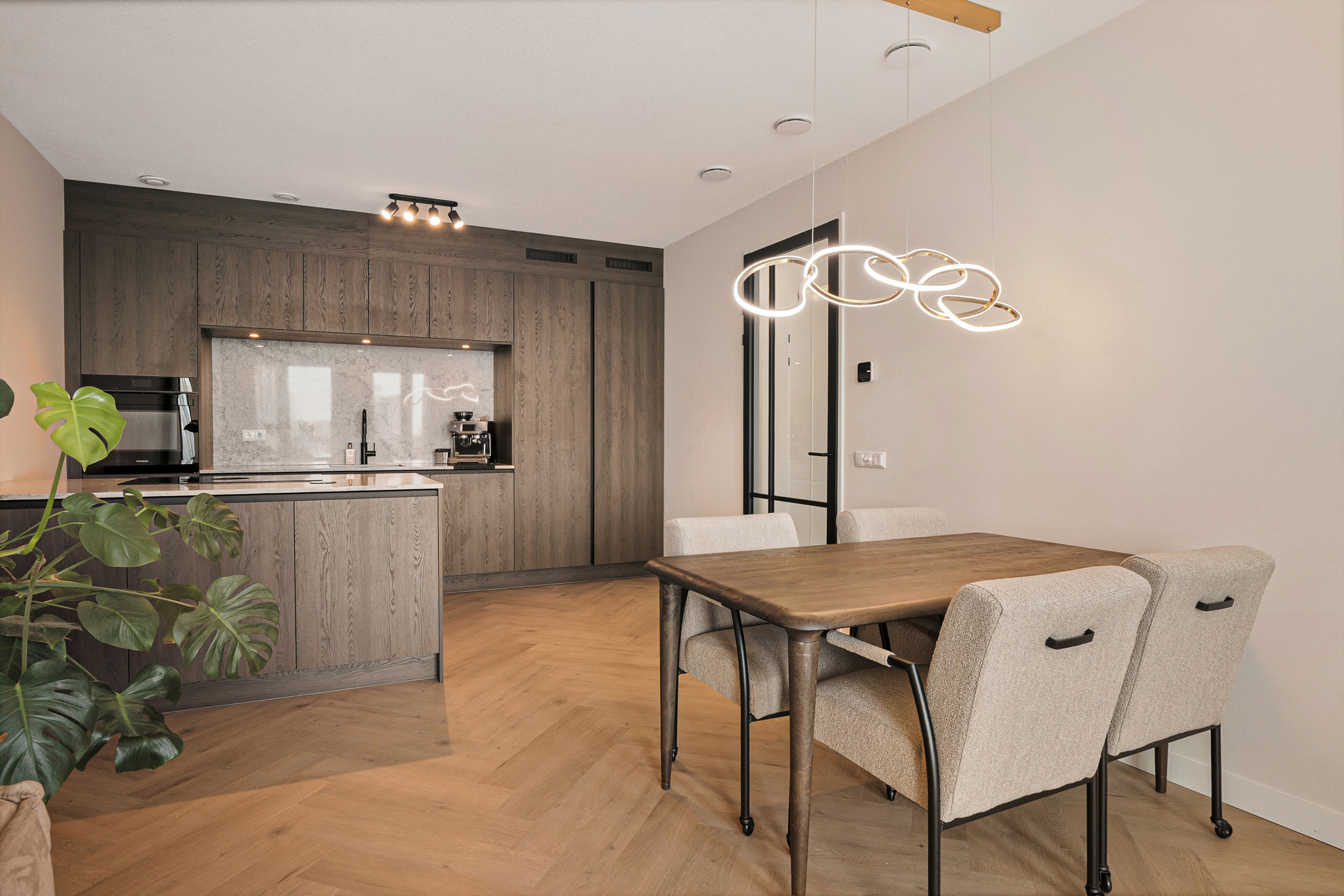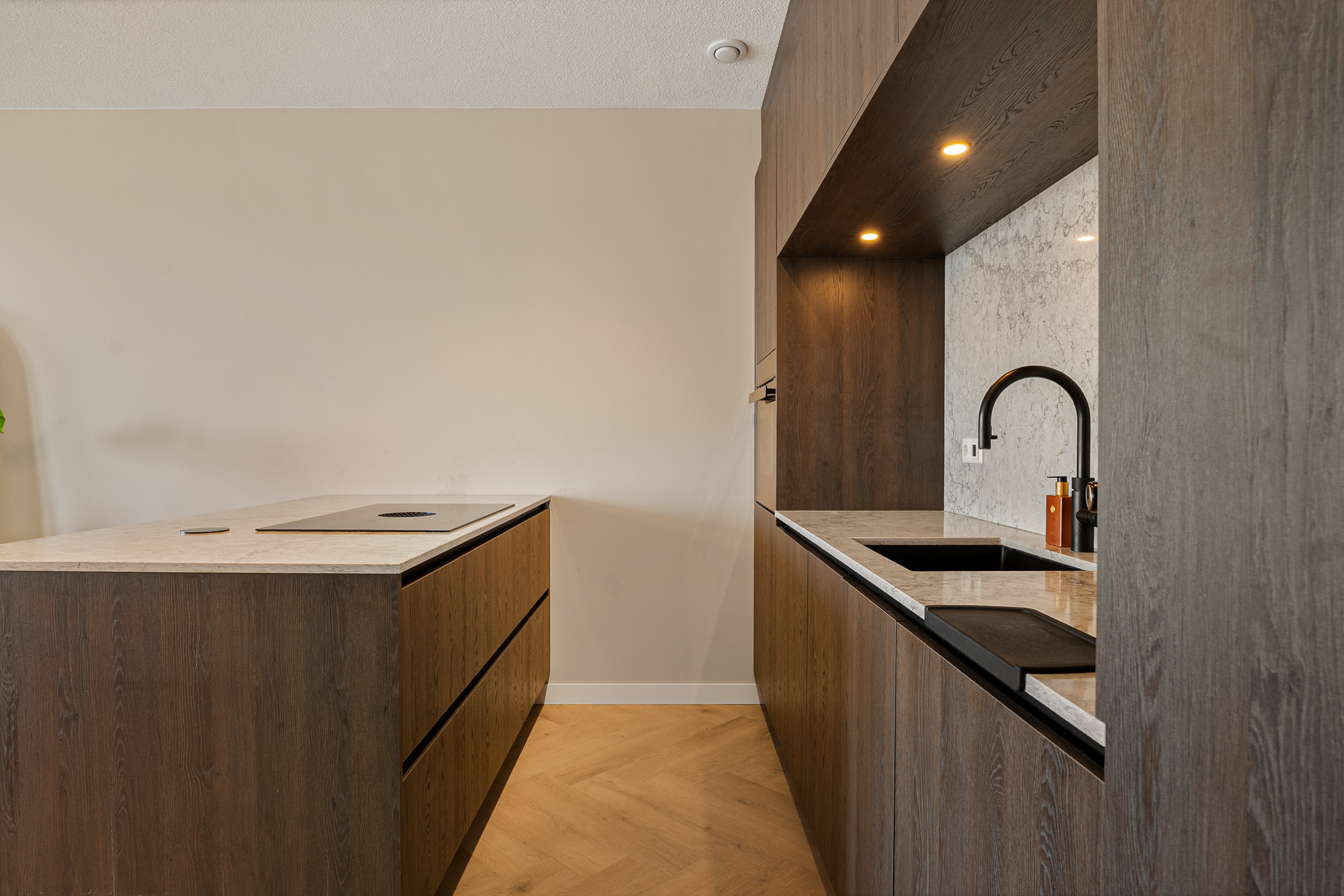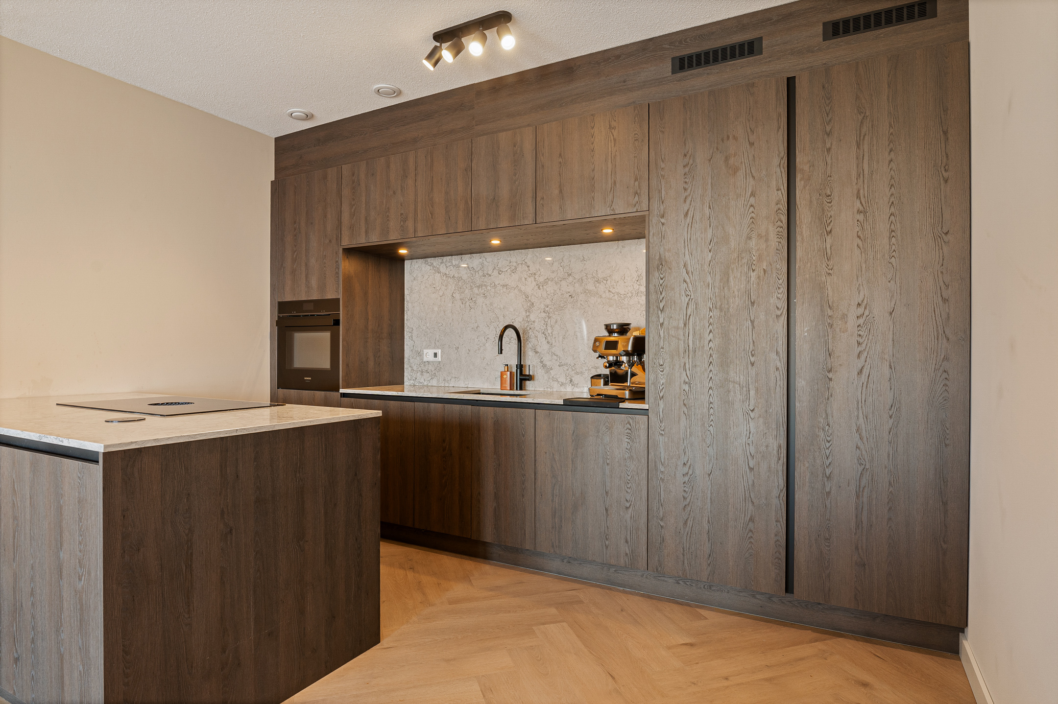 De moderne keuken heeft een strak design met kookeiland en is voorzien van diverse inbouwapparatuur, waaronder een inductiekookplaat, oven en vaatwasser. Daarnaast beschikt de keuken over een hoge, losse koelkast en een hoge, losse vriezer, ideaal voor wie veel koel- en vriesruimte nodig heeft. De hoogwaardige afwerking, strakke wanden en vloerverwarming én vloerkoeling zorgen voor een comfortabele en stijlvolle leefruimte.