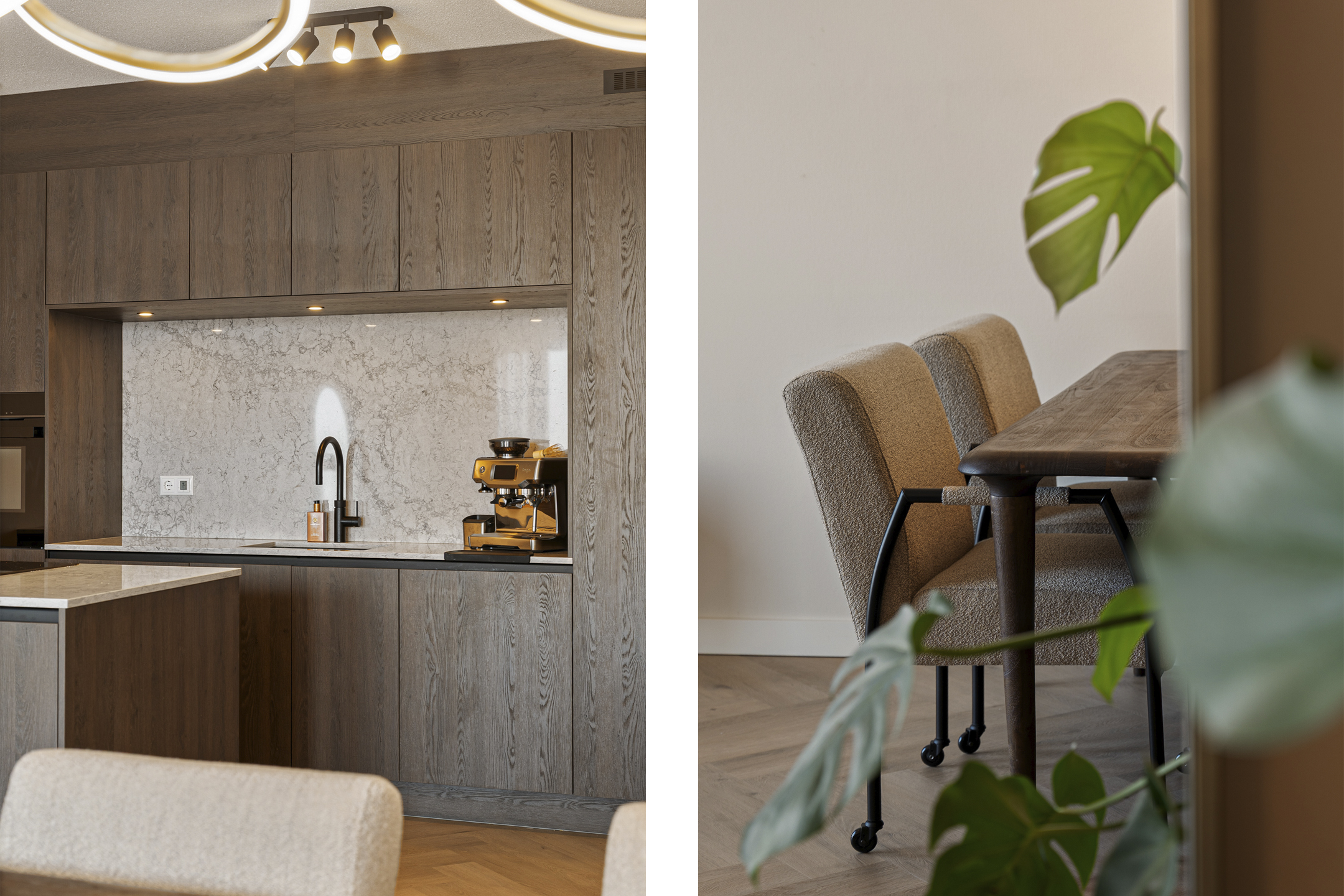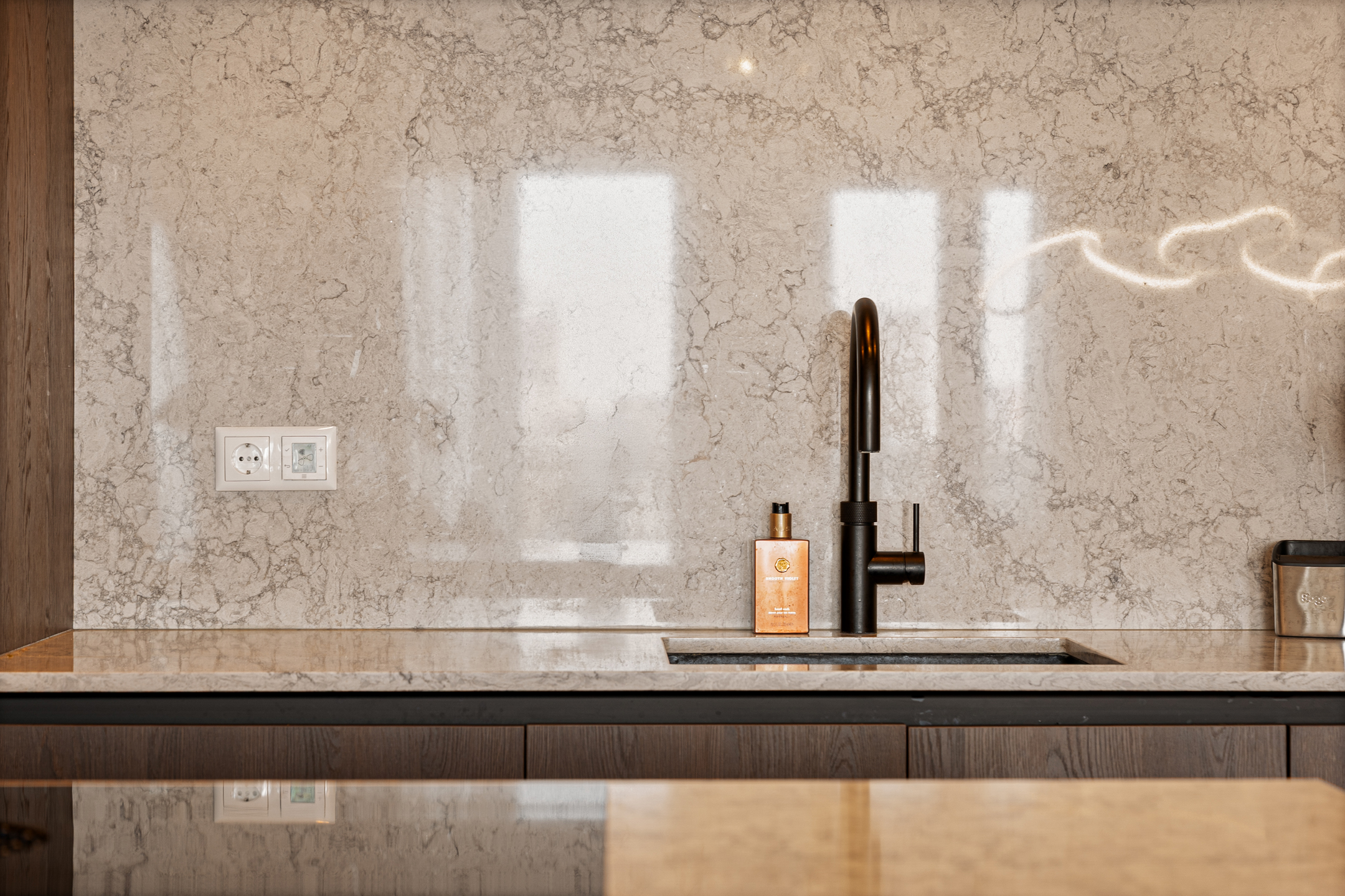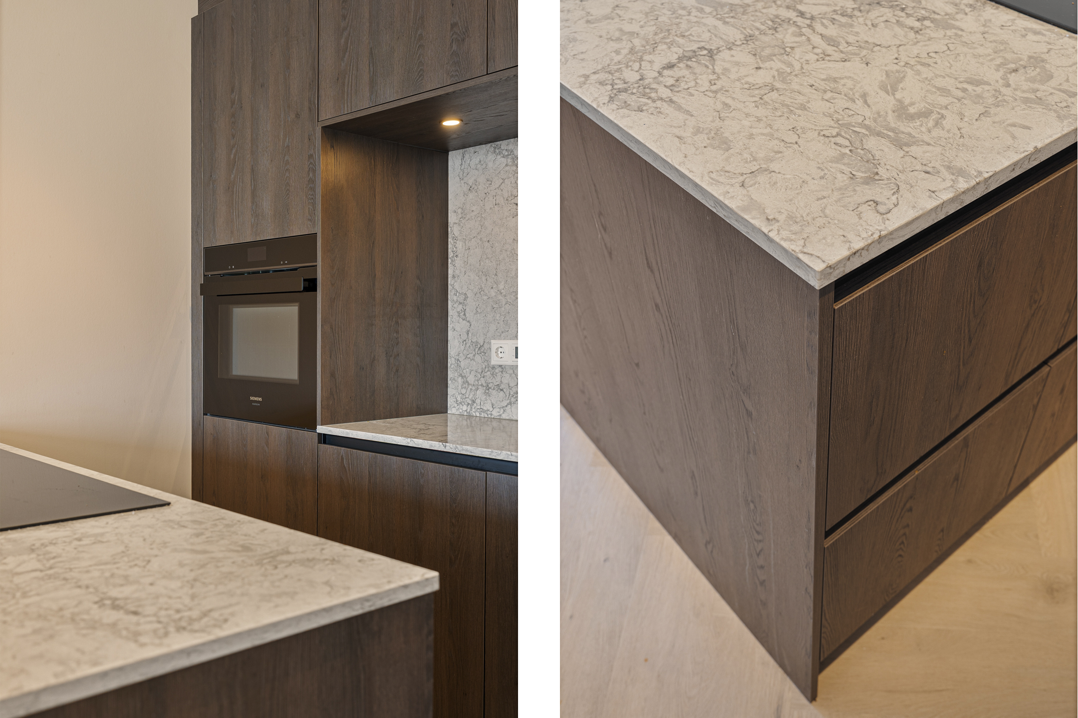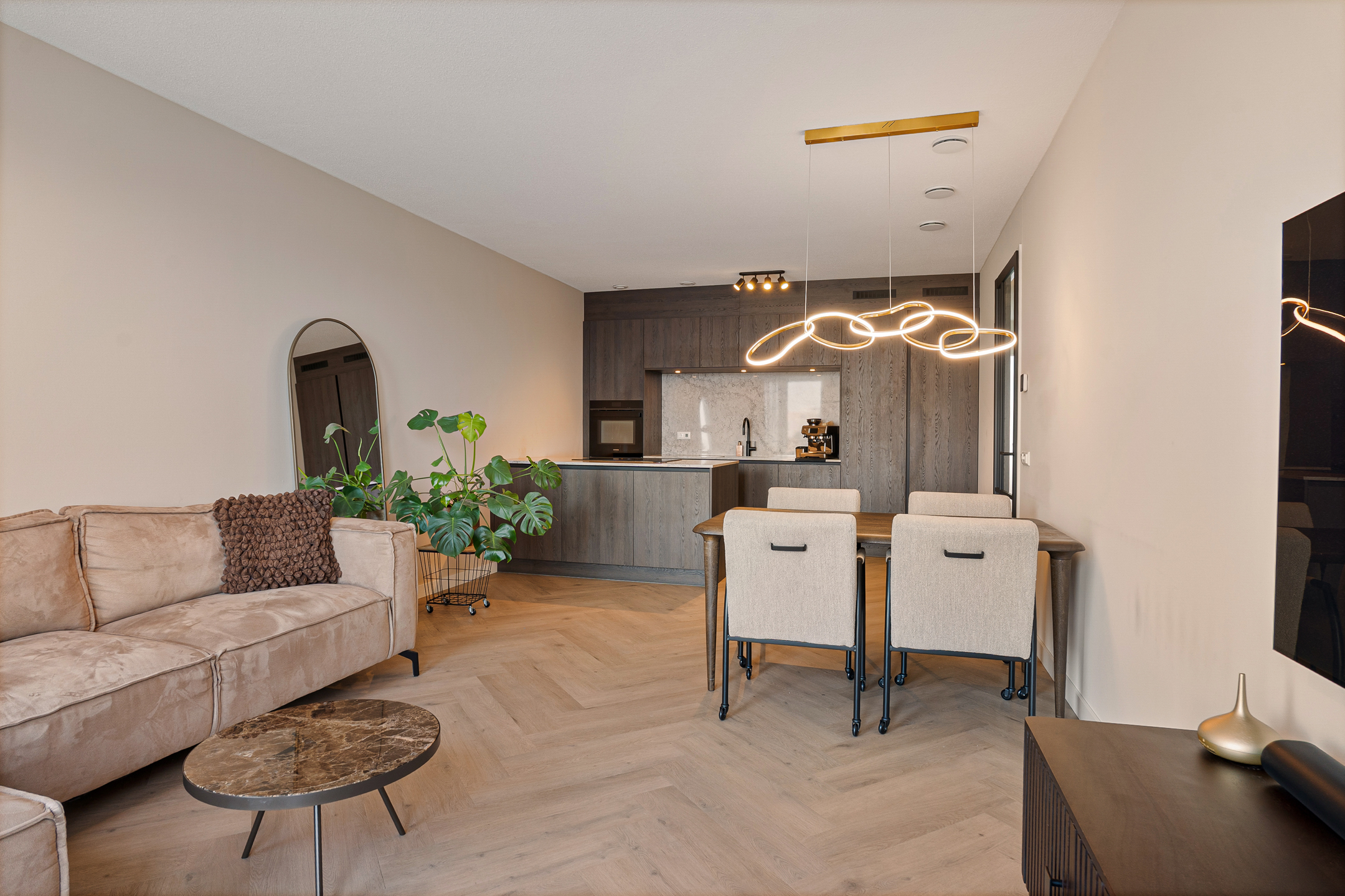 De moderne keuken heeft een strak design met kookeiland en is voorzien van diverse inbouwapparatuur, waaronder een inductiekookplaat, oven en vaatwasser. Daarnaast beschikt de keuken over een hoge, losse koelkast en een hoge, losse vriezer, ideaal voor wie veel koel- en vriesruimte nodig heeft. De hoogwaardige afwerking, strakke wanden en vloerverwarming én vloerkoeling zorgen voor een comfortabele en stijlvolle leefruimte.