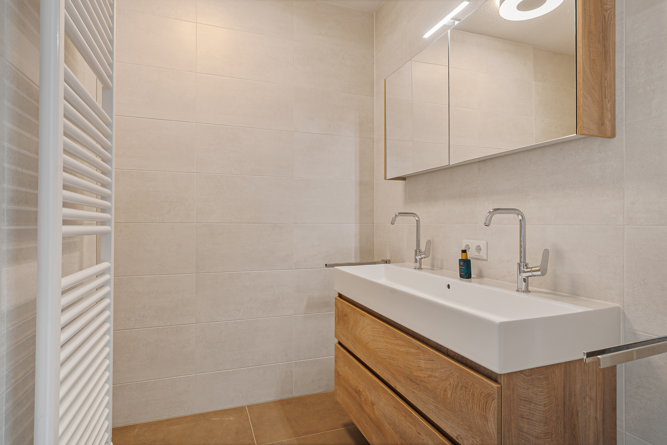 De moderne badkamer is uitgerust met een inloopdouche en een dubbele wastafel met meubel. Daarnaast is er een separaat toilet en een praktische technische berging met ruimte voor de wasmachine, droger en installaties.